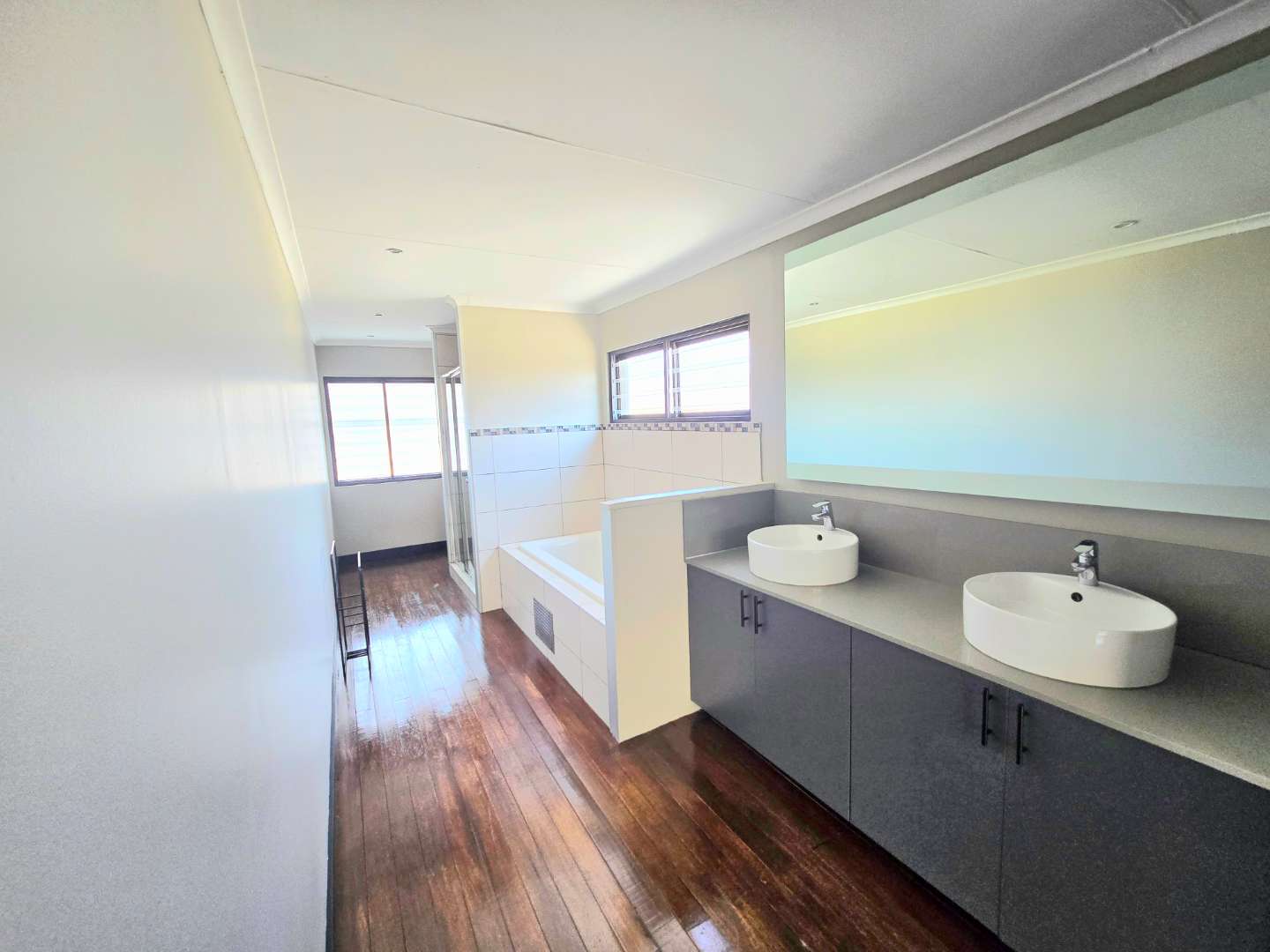 Luxurious main bedroom with a full en-suite bathroom featuring a bathtub, shower, toilet, and double vanity, plus ample built-in cupboards