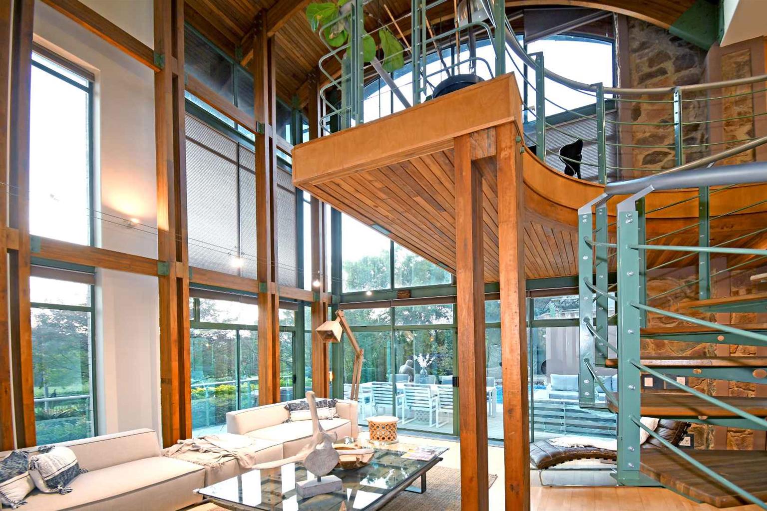 Step inside to discover a striking architectural design featuring a double-volume barrel ceiling that defines the expansive living areas. Natural wood accents and floor-to-ceiling glass invite warm light throughout the home, creating a space that is both inviting and sophisticated.