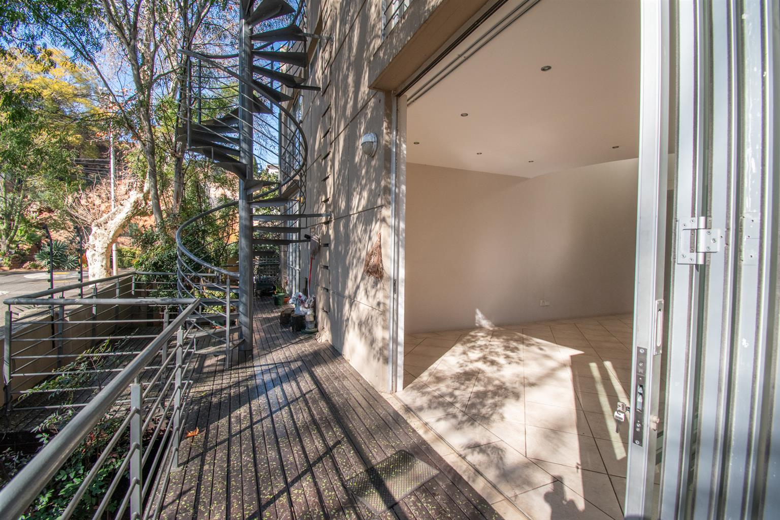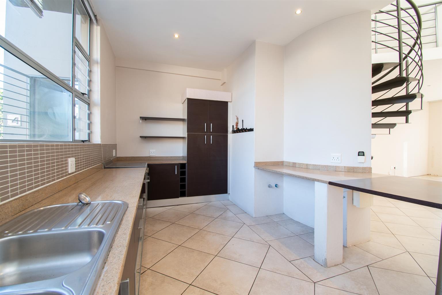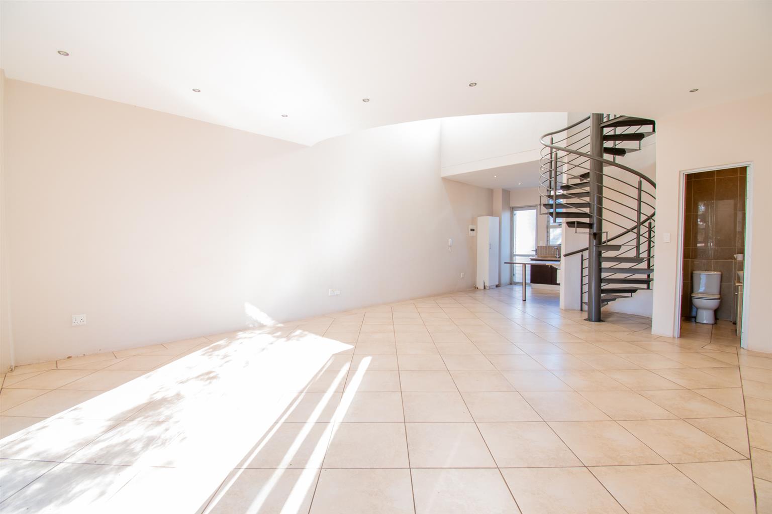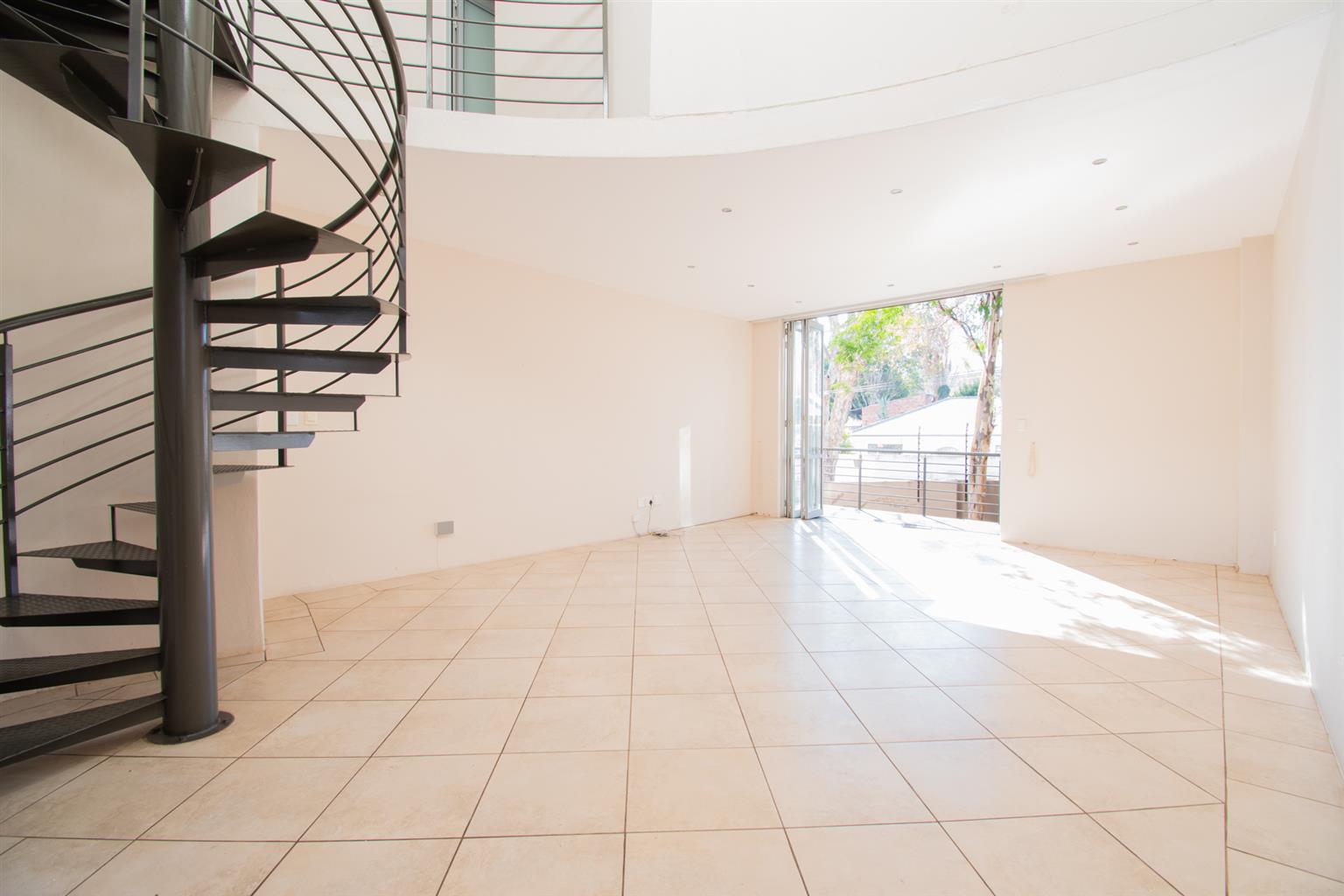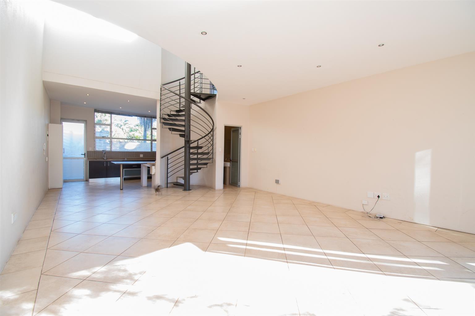 The Living area has enough space for a dining and a lounge set, tall ceilings with a spiral staircase and skylights and access to a Patio.
