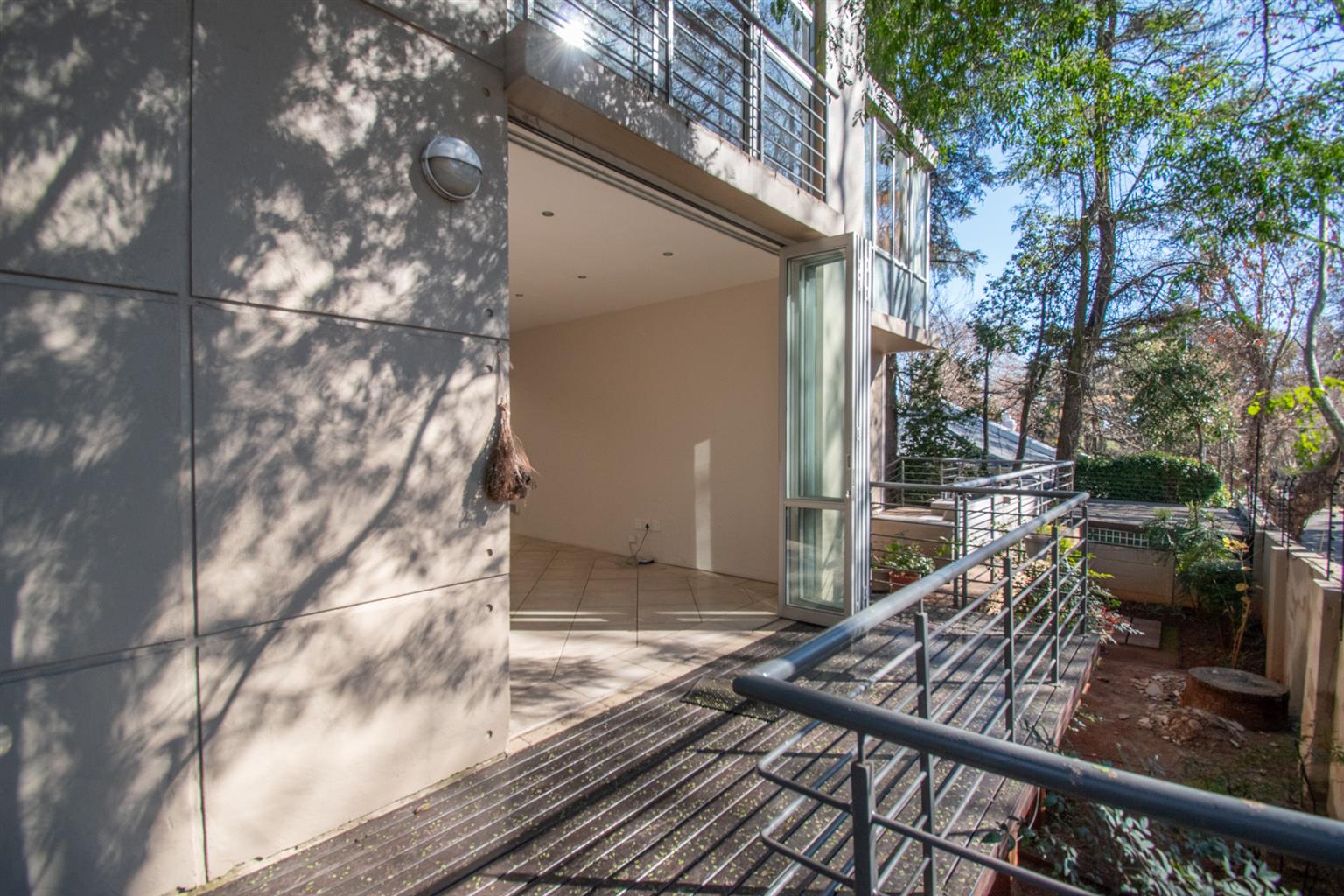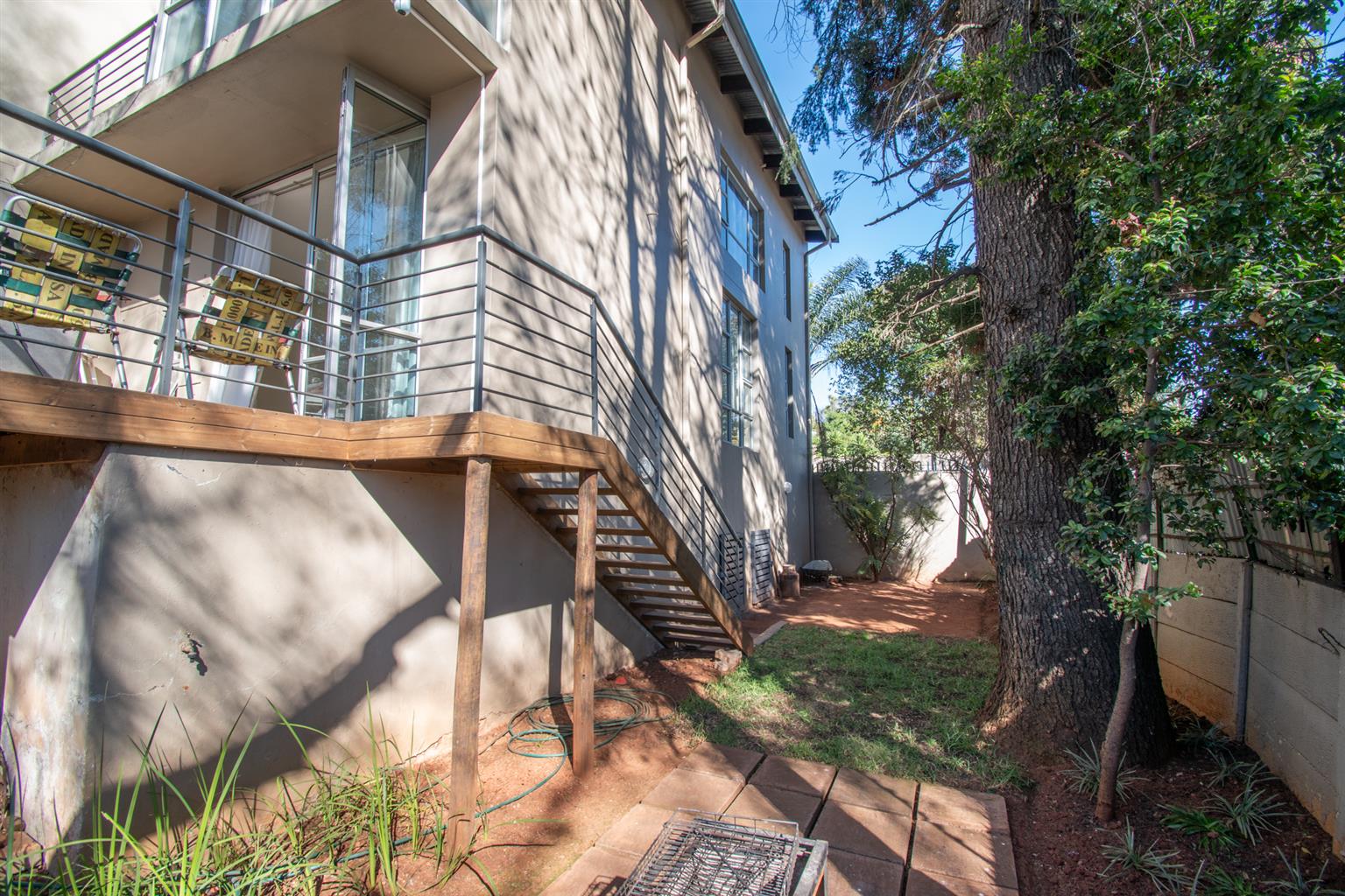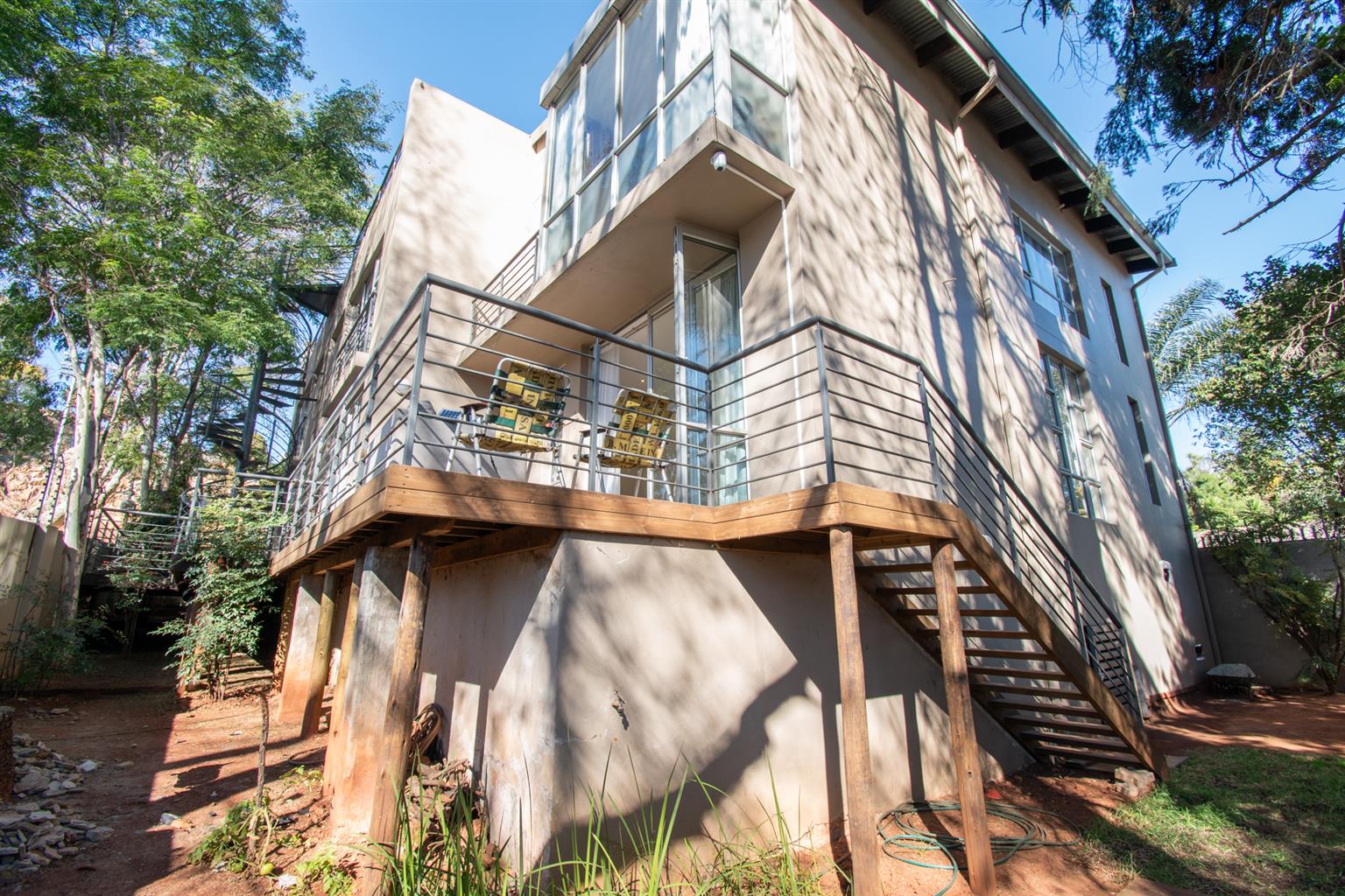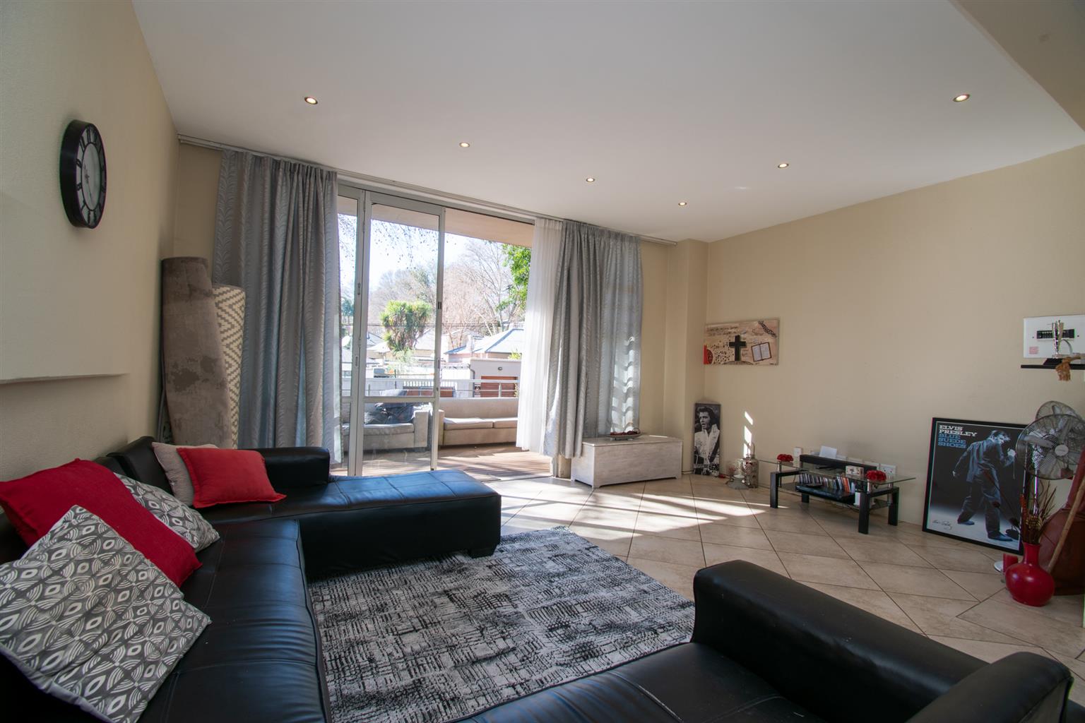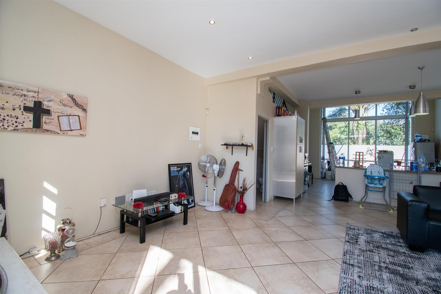 The Living area has enough space for a dining and a lounge set, tall ceilings with a spiral staircase and skylights and access to a Patio.