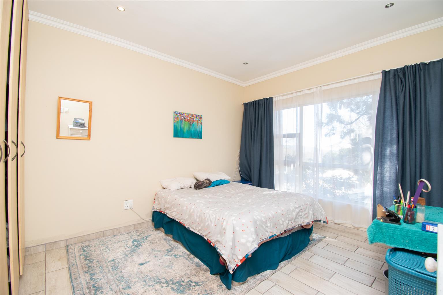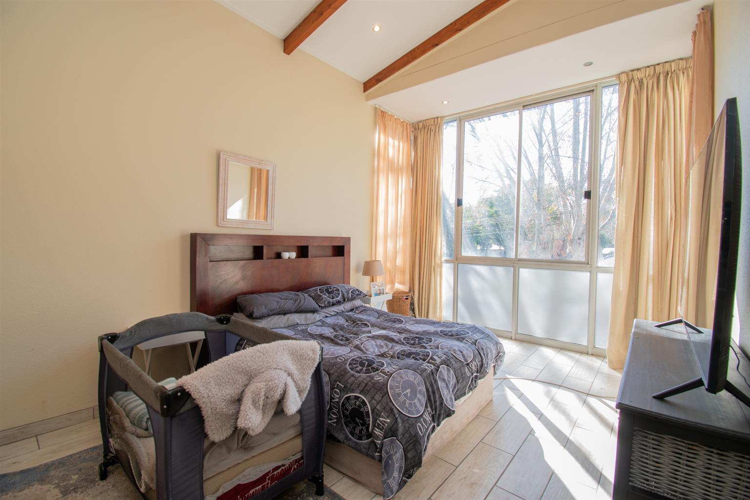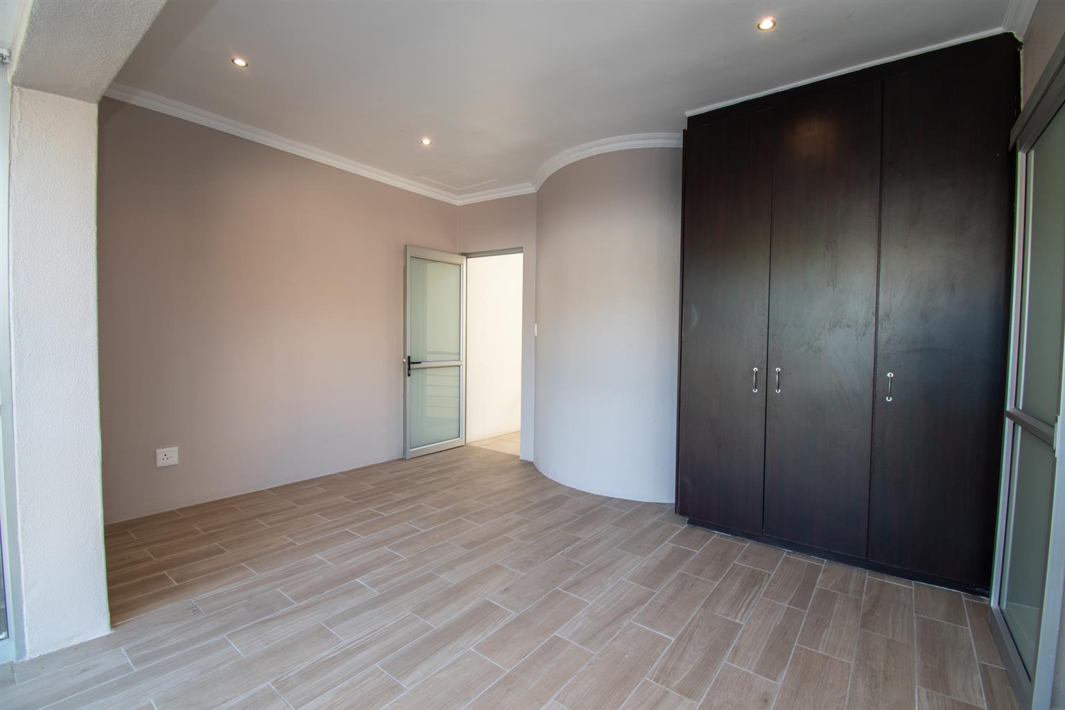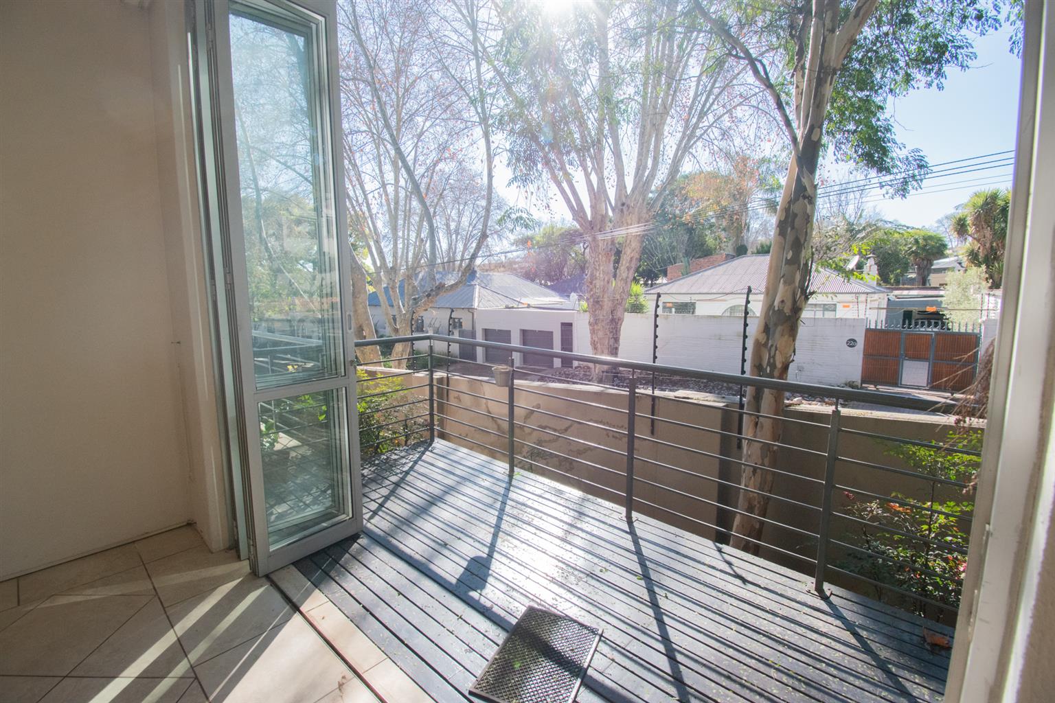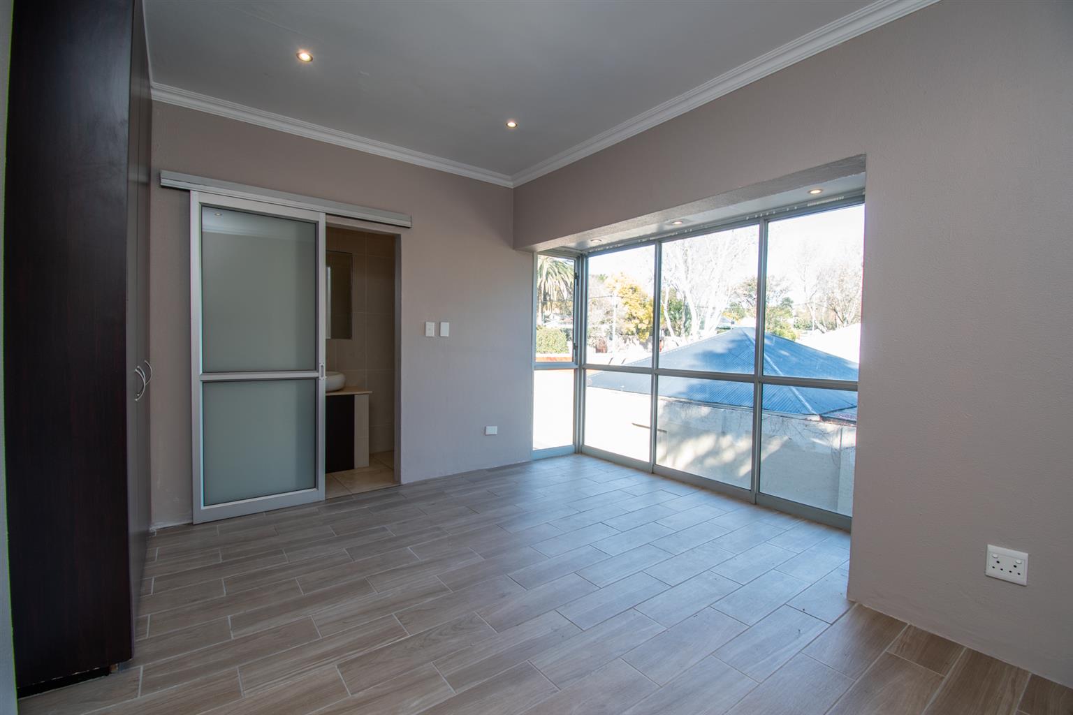 The Living area has enough space for a dining and a lounge set, tall ceilings with a spiral staircase and skylights and access to a Patio.