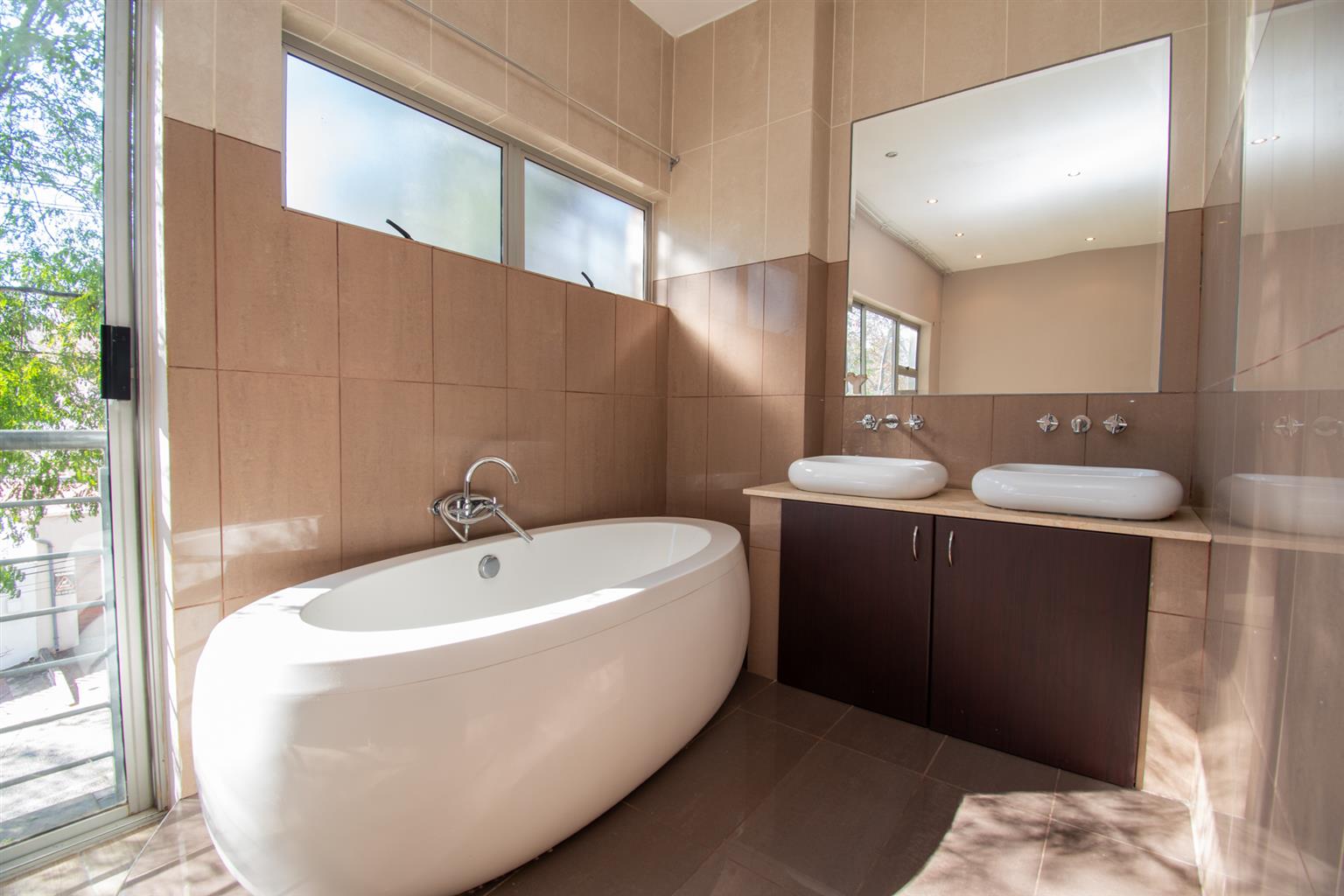 The Living area has space for both a lounge and a dining set and leads to a private East facing balcony. The Balcony has stairs down to a private garden and access to the underground parking.