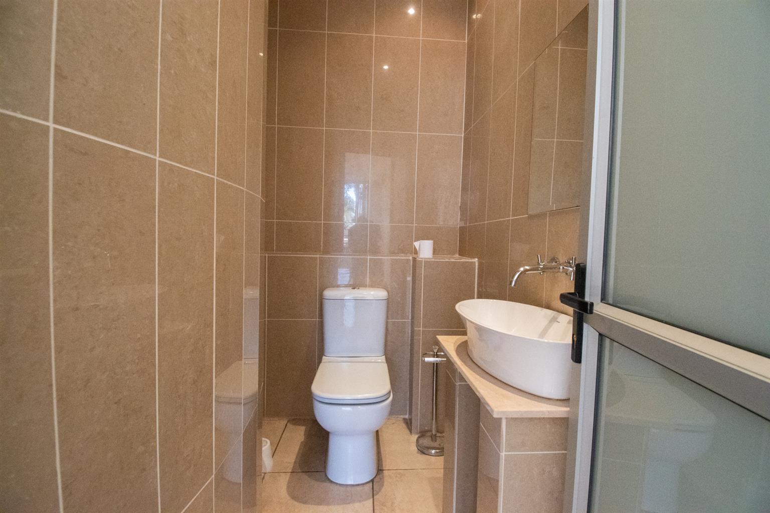 There is a guest Bathroom downstairs with a toilet and sink.