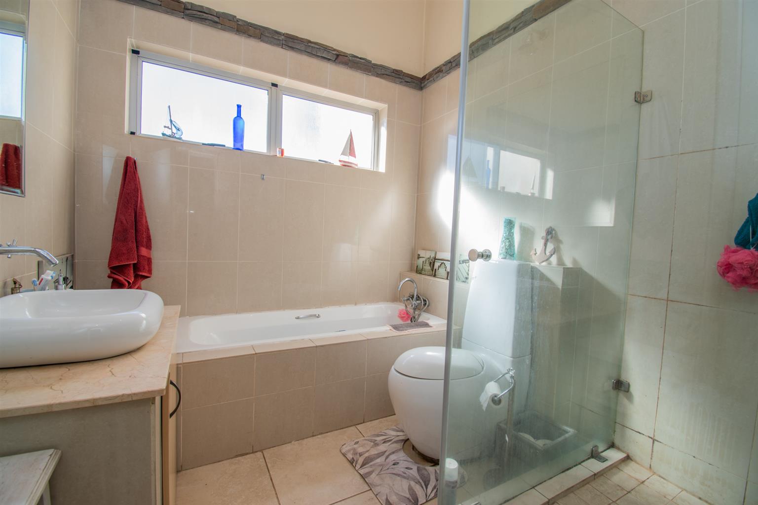There is a family Bathroom upstairs with a bath, separate shower, toilet and sink.