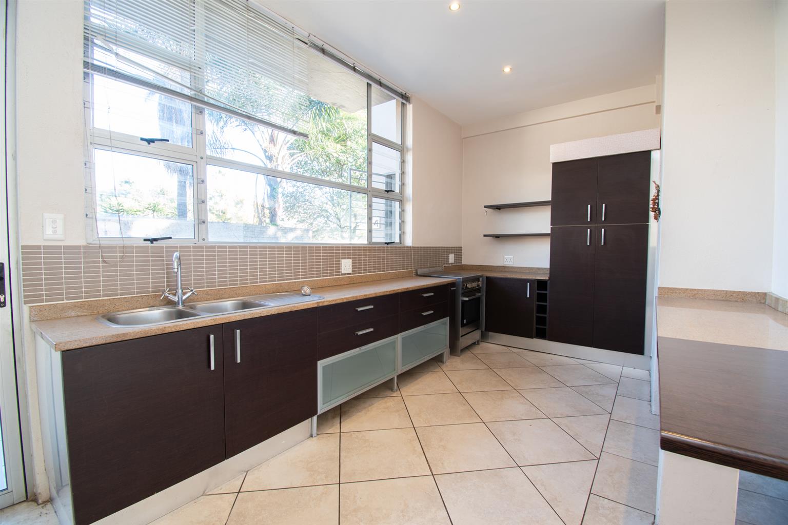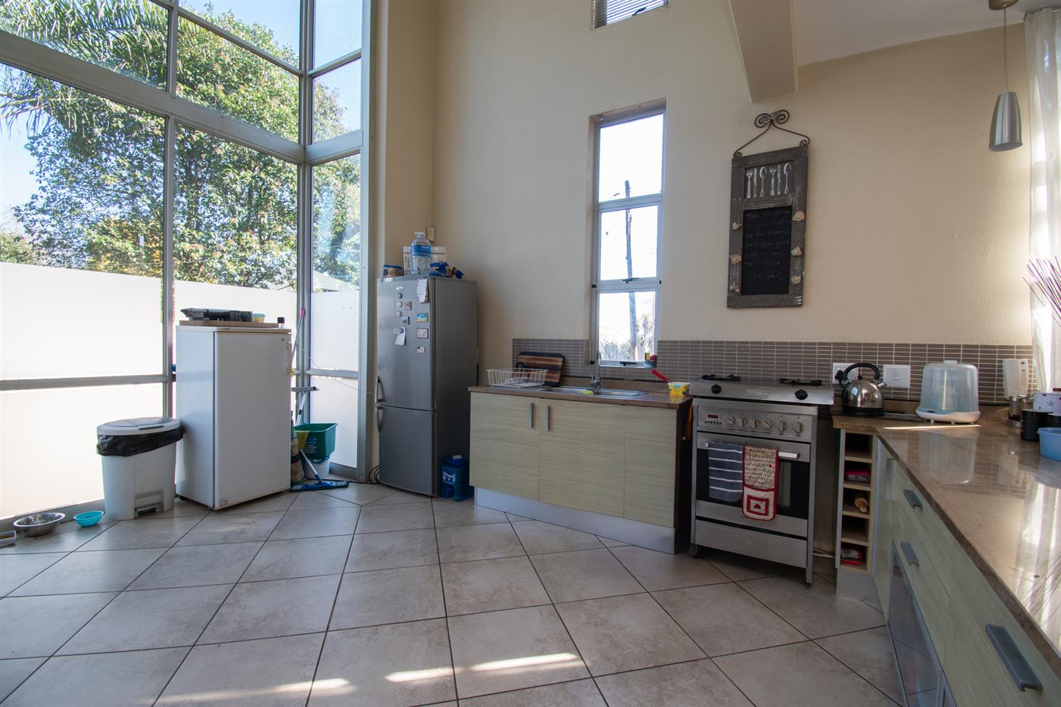 The Kitchen and Living area are open-plan. The Kitchen has floor to ceiling windows letting in tons of light, space for a water appliance, stove, under counter oven and opens up into the Living area.