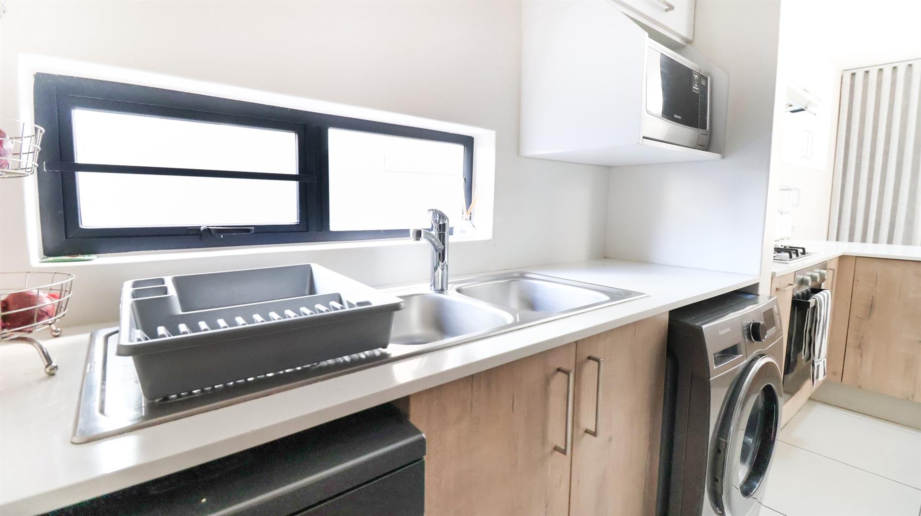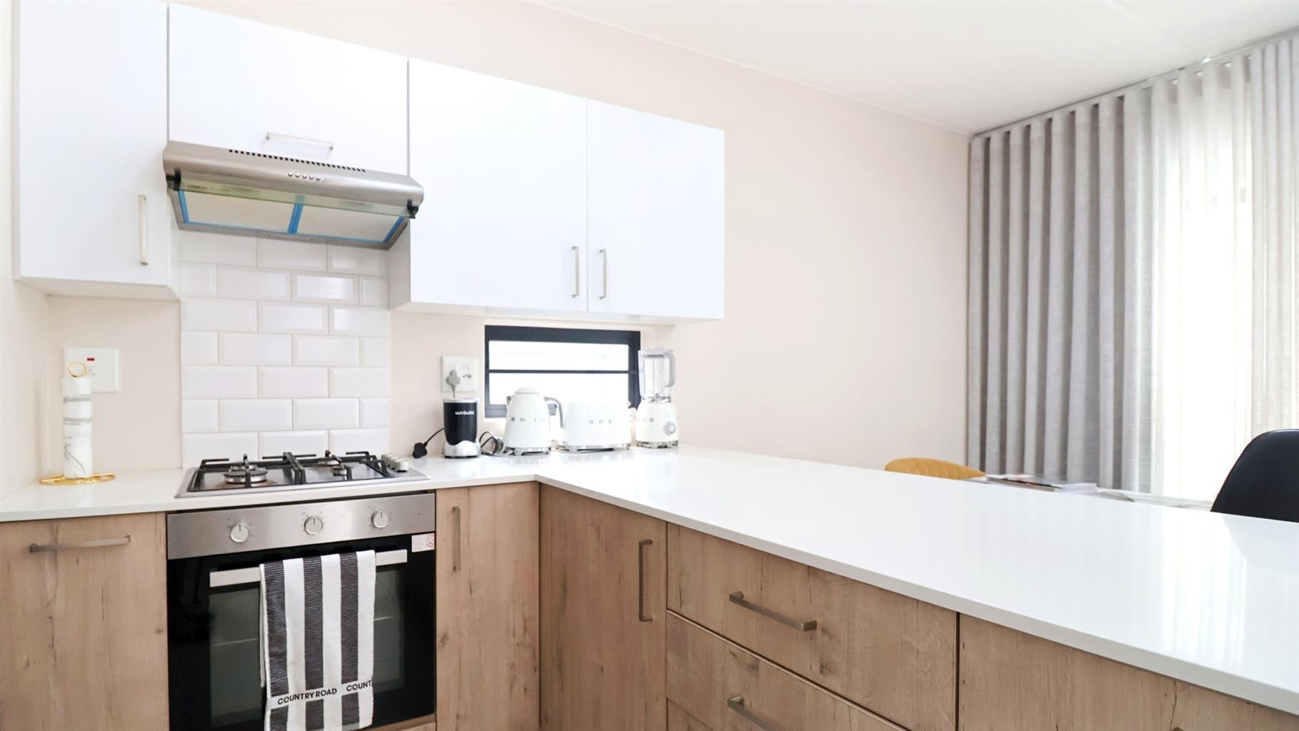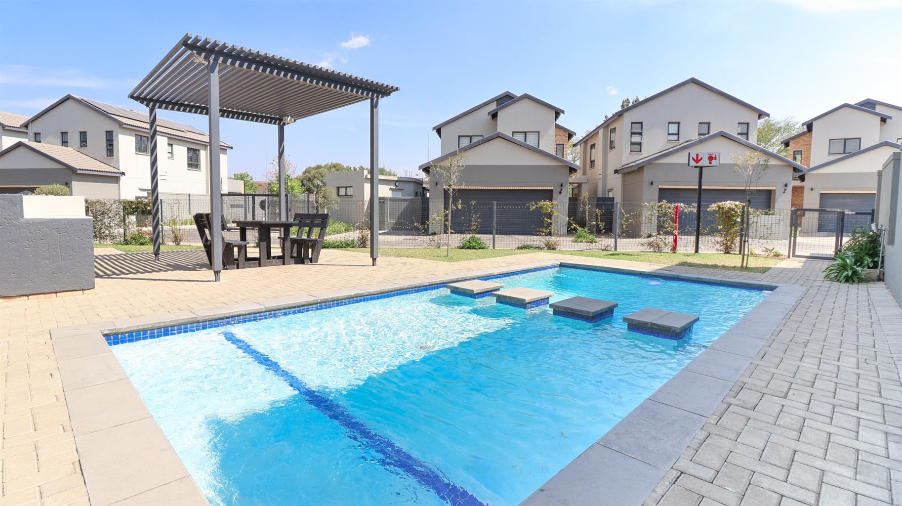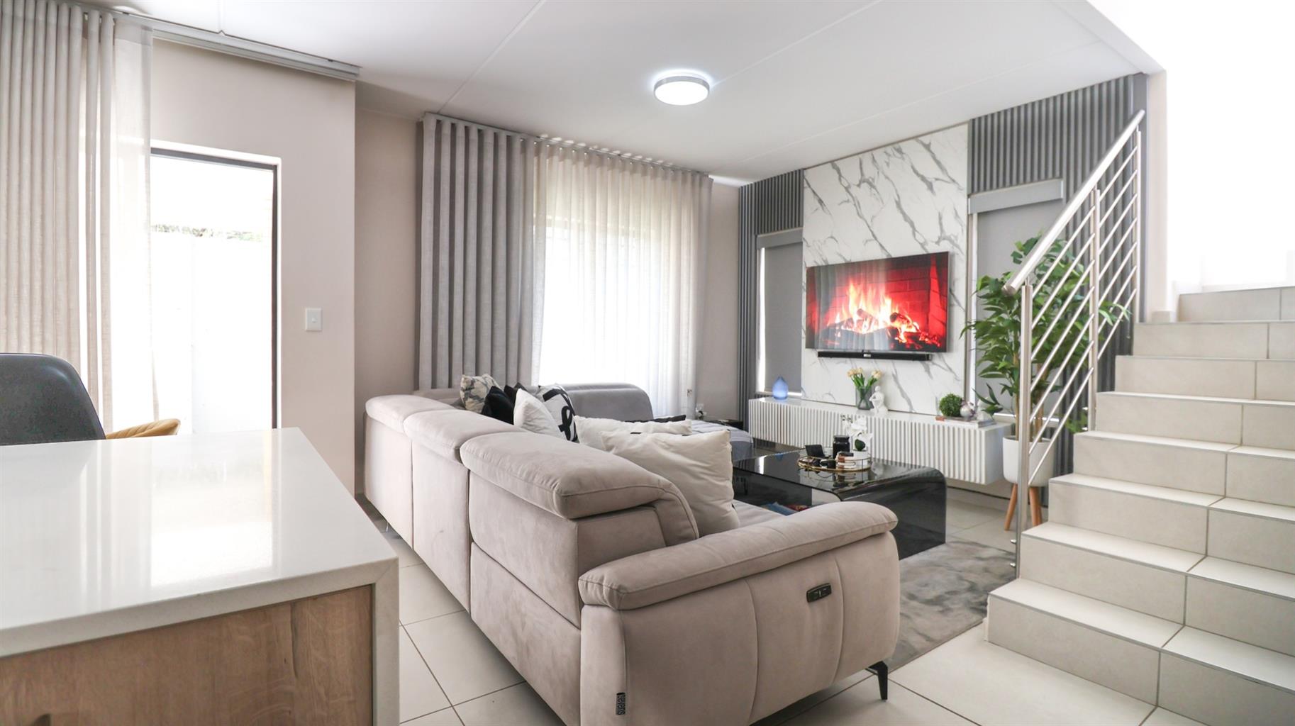 The light-filled open-plan lounge, dining, and kitchen area is perfect for entertaining. The kitchen offers sleek Caesarstone countertops, a pantry, and a separate scullery, while the living space flows effortlessly onto a covered patio with a built-in braai overlooking the private garden — ideal for relaxed evenings and weekend gatherings. A spacious guest toilet downstairs adds convenience.