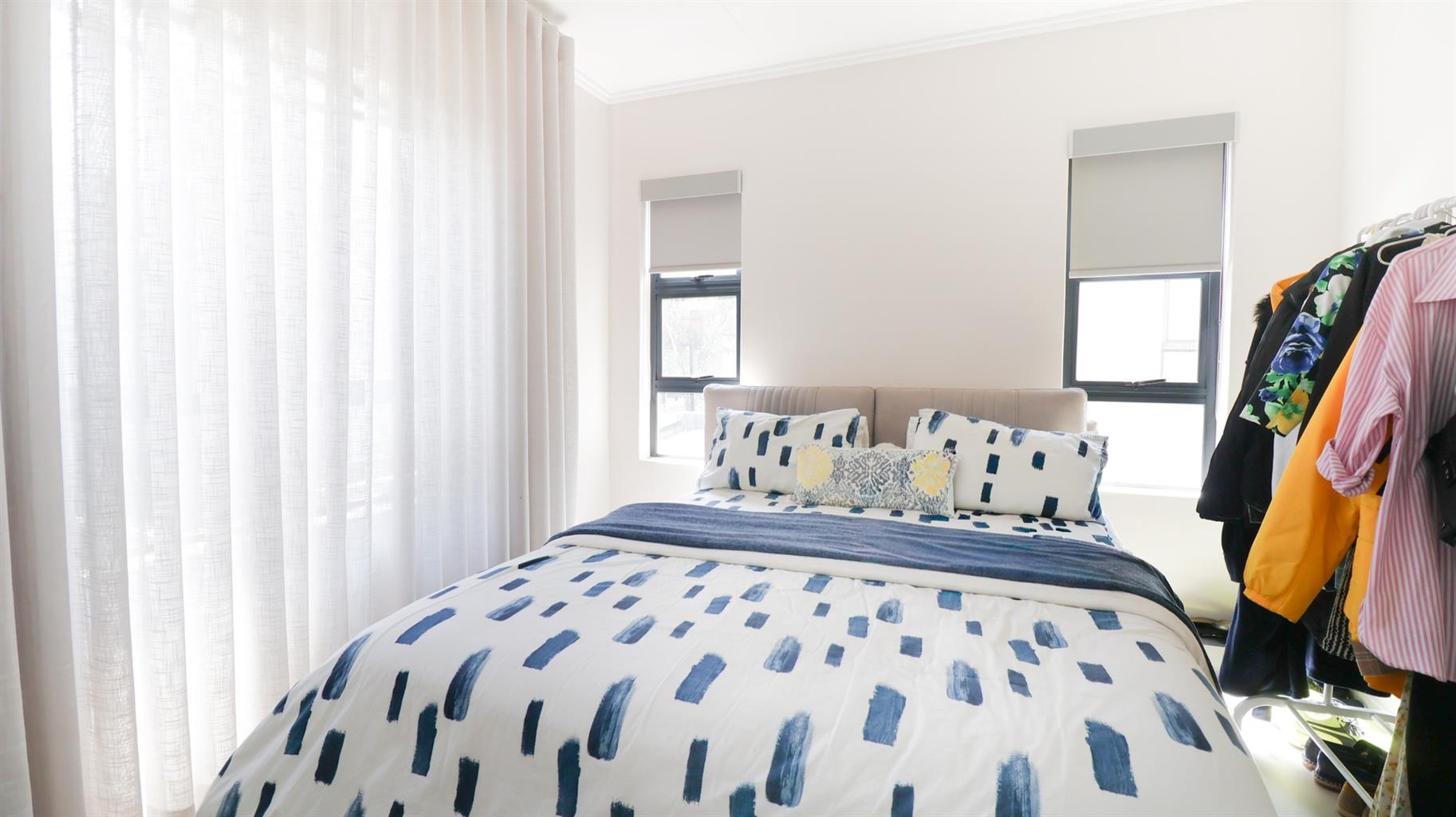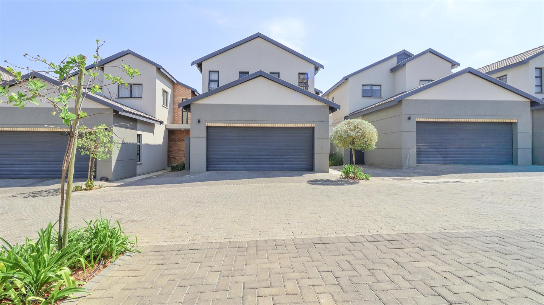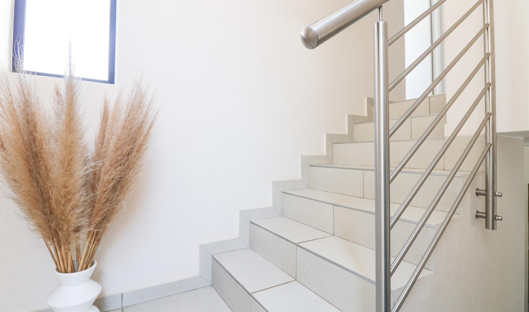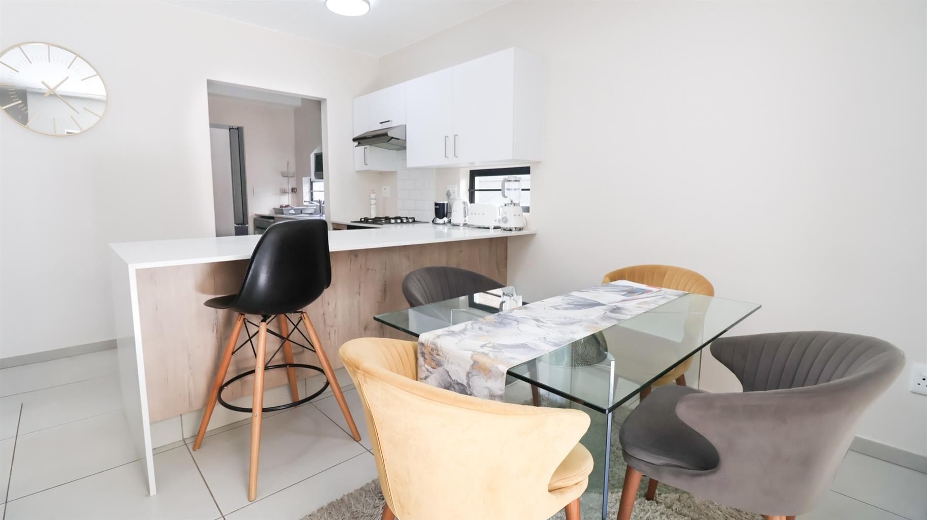 The light-filled open-plan lounge, dining, and kitchen area is perfect for entertaining. The kitchen offers sleek Caesarstone countertops, a pantry, and a separate scullery, while the living space flows effortlessly onto a covered patio with a built-in braai overlooking the private garden — ideal for relaxed evenings and weekend gatherings. A spacious guest toilet downstairs adds convenience.