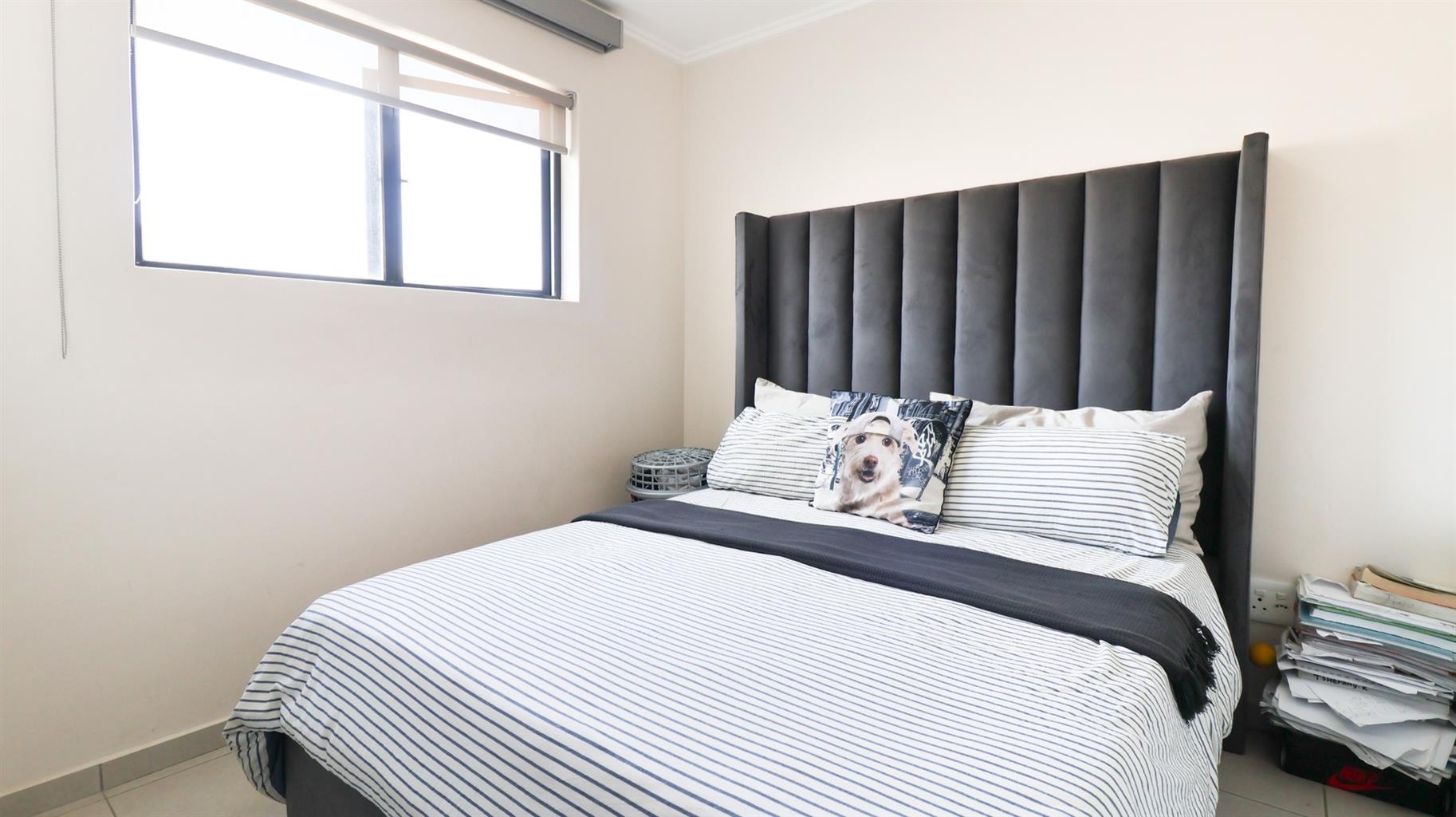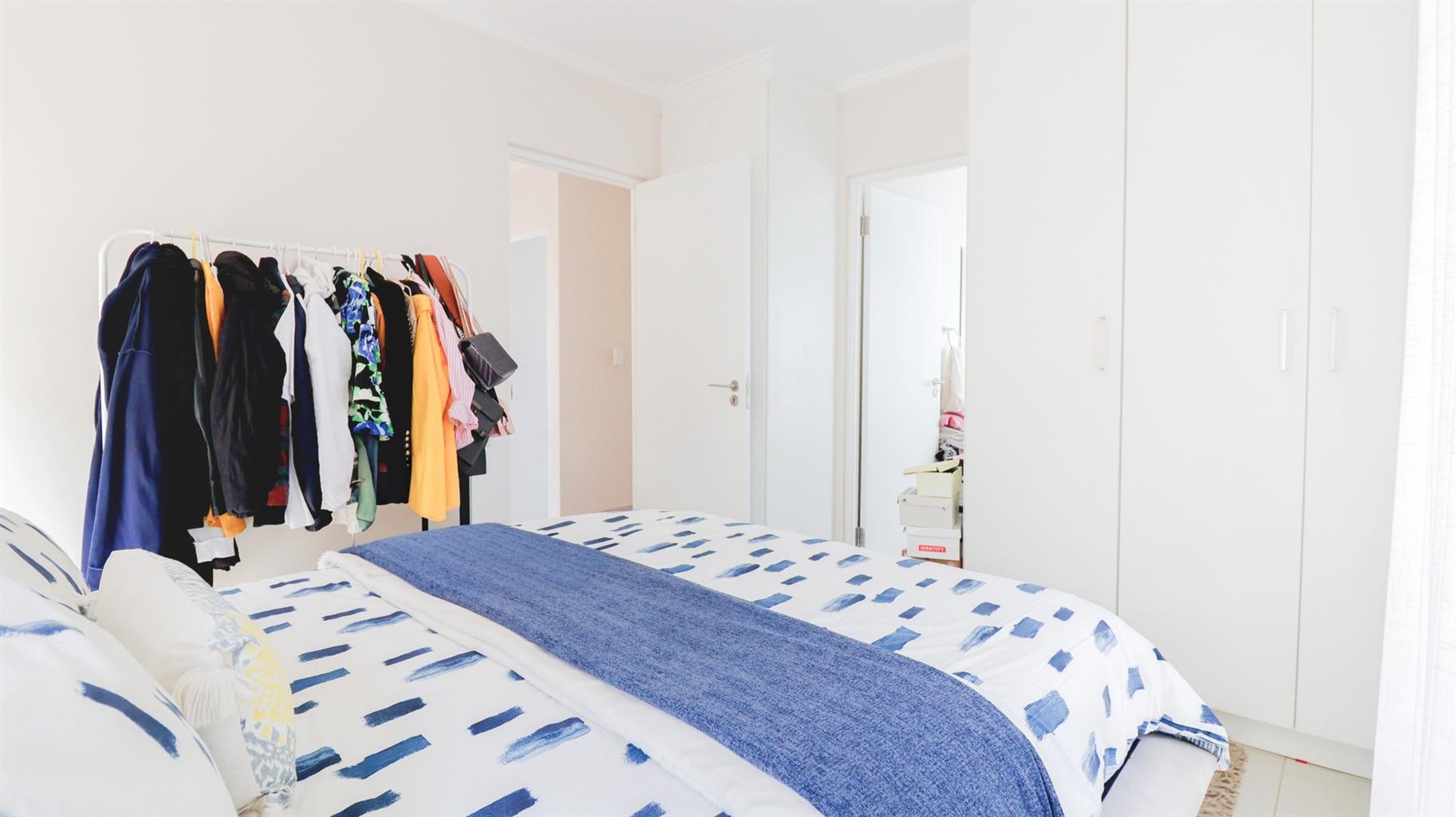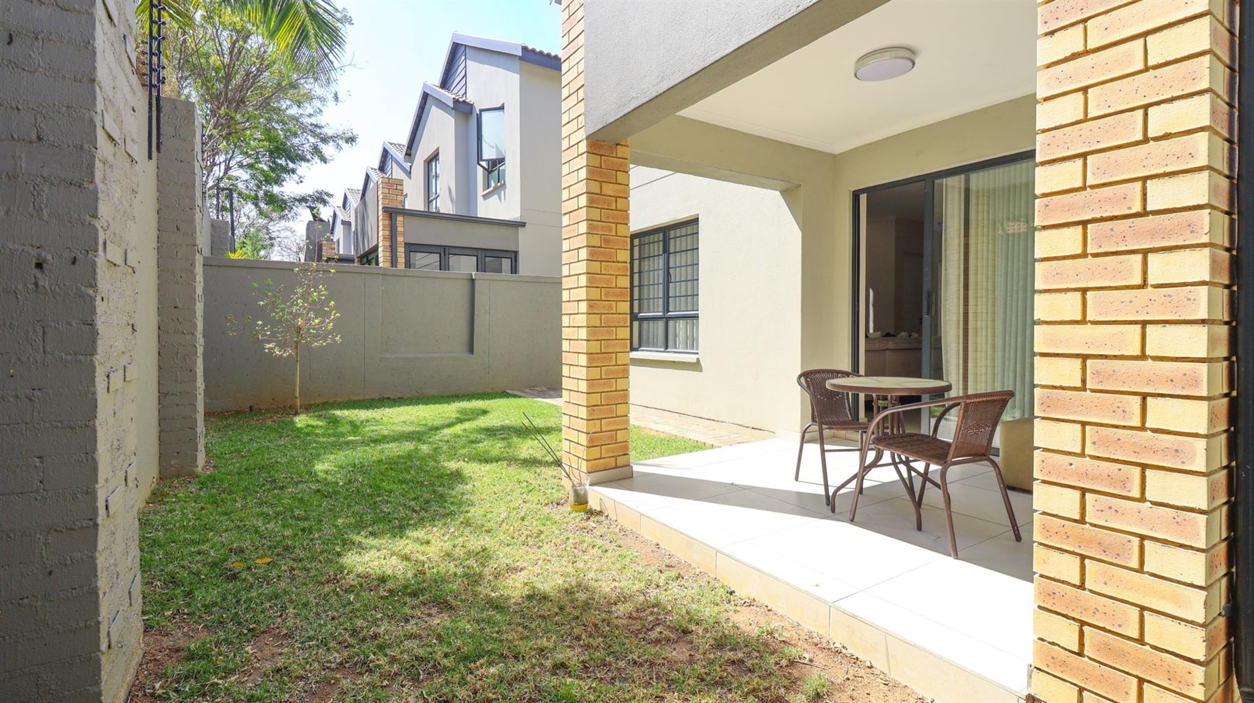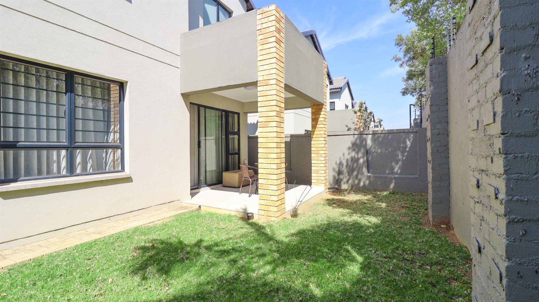 The light-filled open-plan lounge, dining, and kitchen area is perfect for entertaining. The kitchen offers sleek Caesarstone countertops, a pantry, and a separate scullery, while the living space flows effortlessly onto a covered patio with a built-in braai overlooking the private garden — ideal for relaxed evenings and weekend gatherings. A spacious guest toilet downstairs adds convenience.