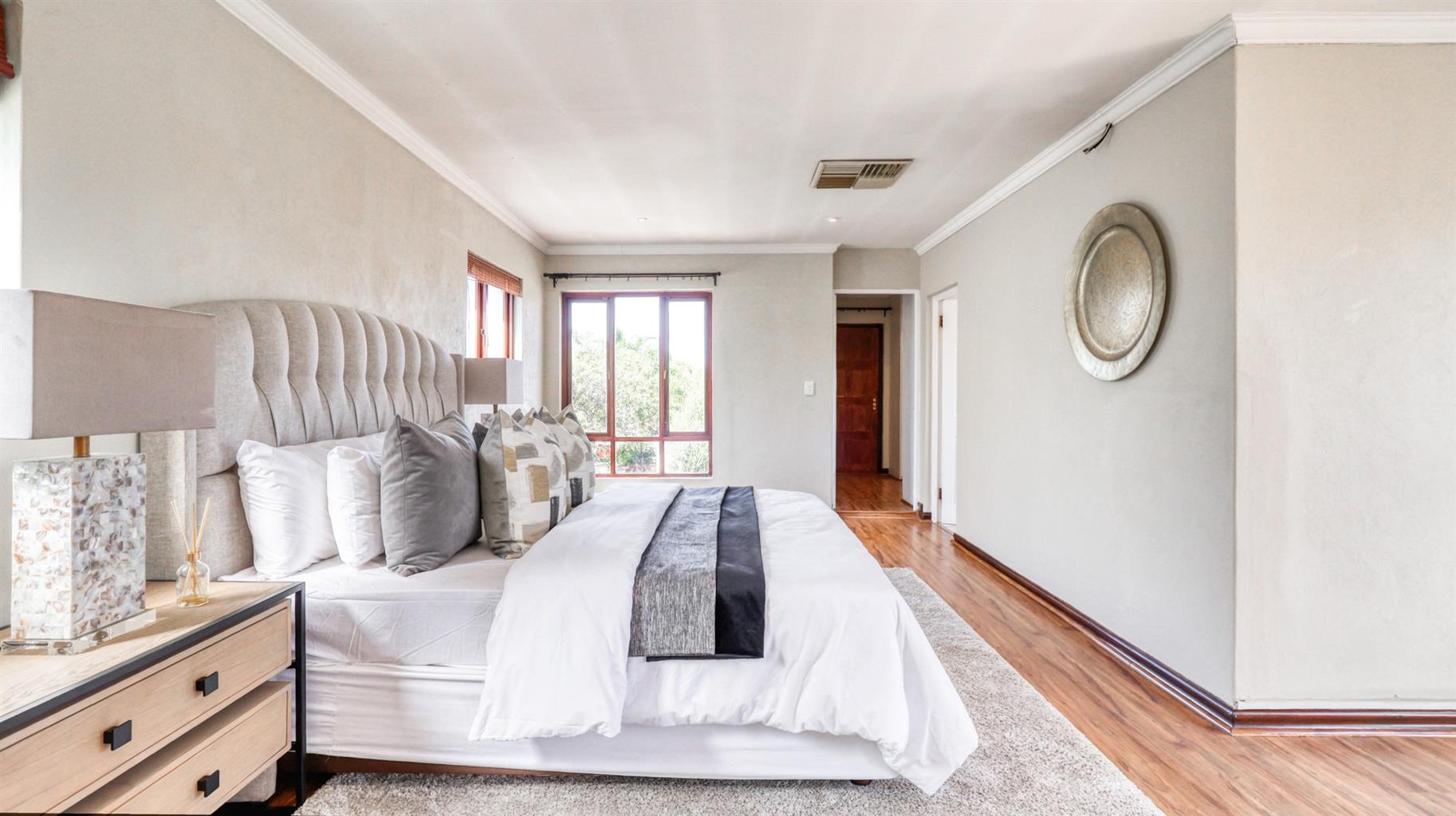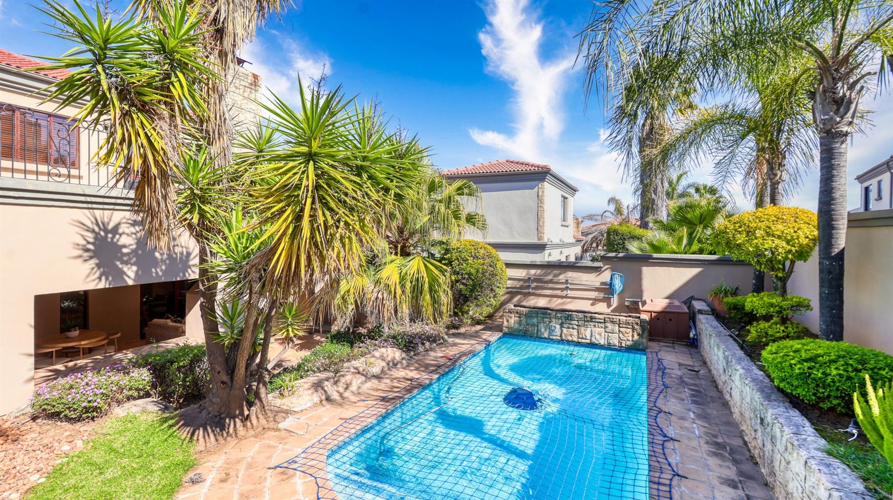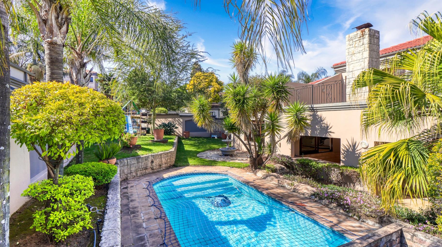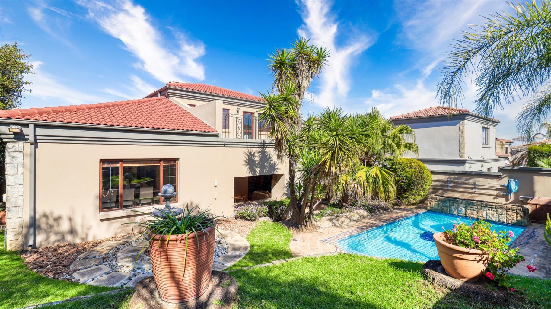 Entertain effortlessly on the covered patio with built-in gas braai, overlooking the landscaped garden and pool. Upstairs boasts four bedrooms with central cooling, two full bathrooms, and a main en-suite with private balcony and pyjama lounge.