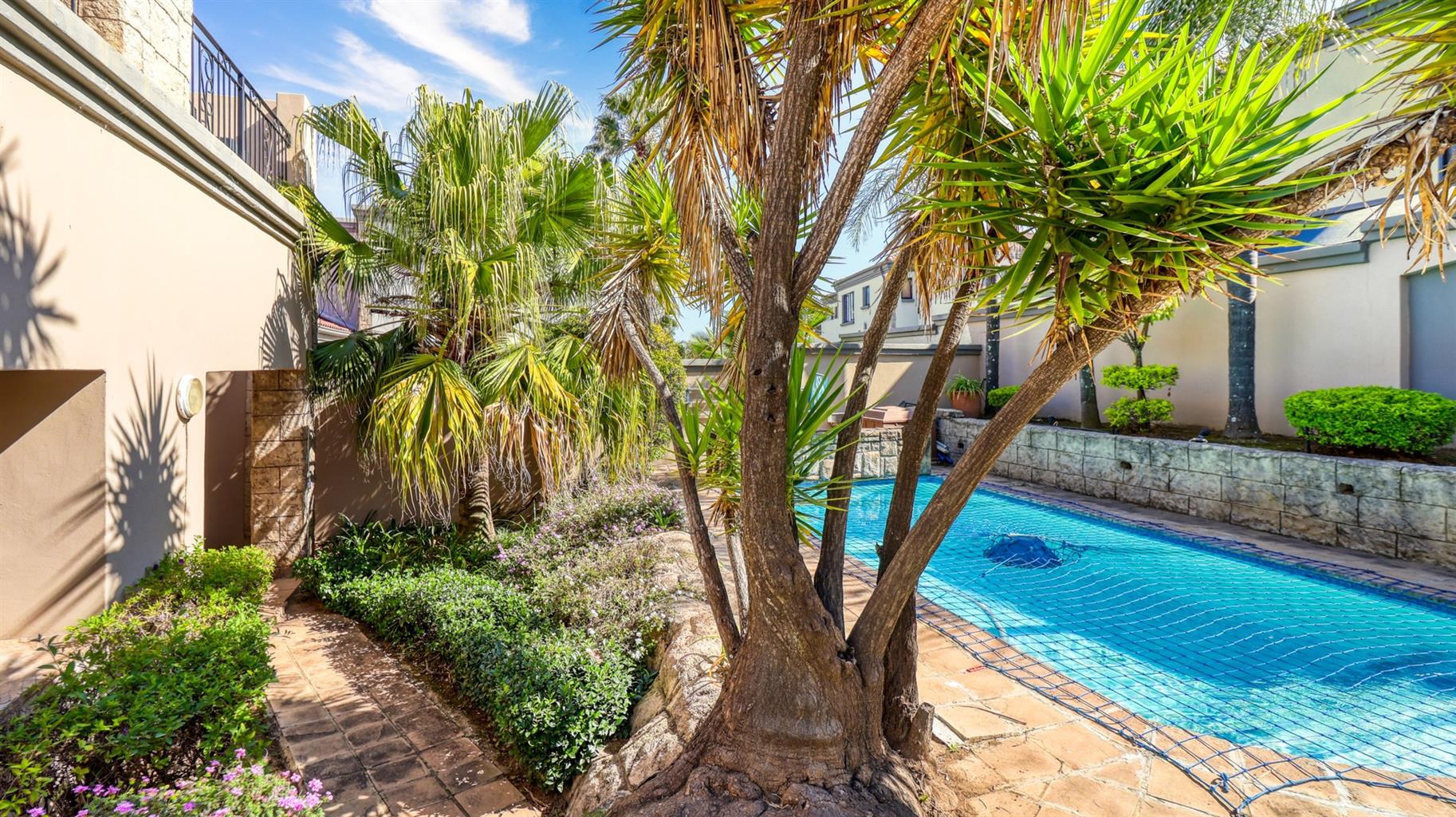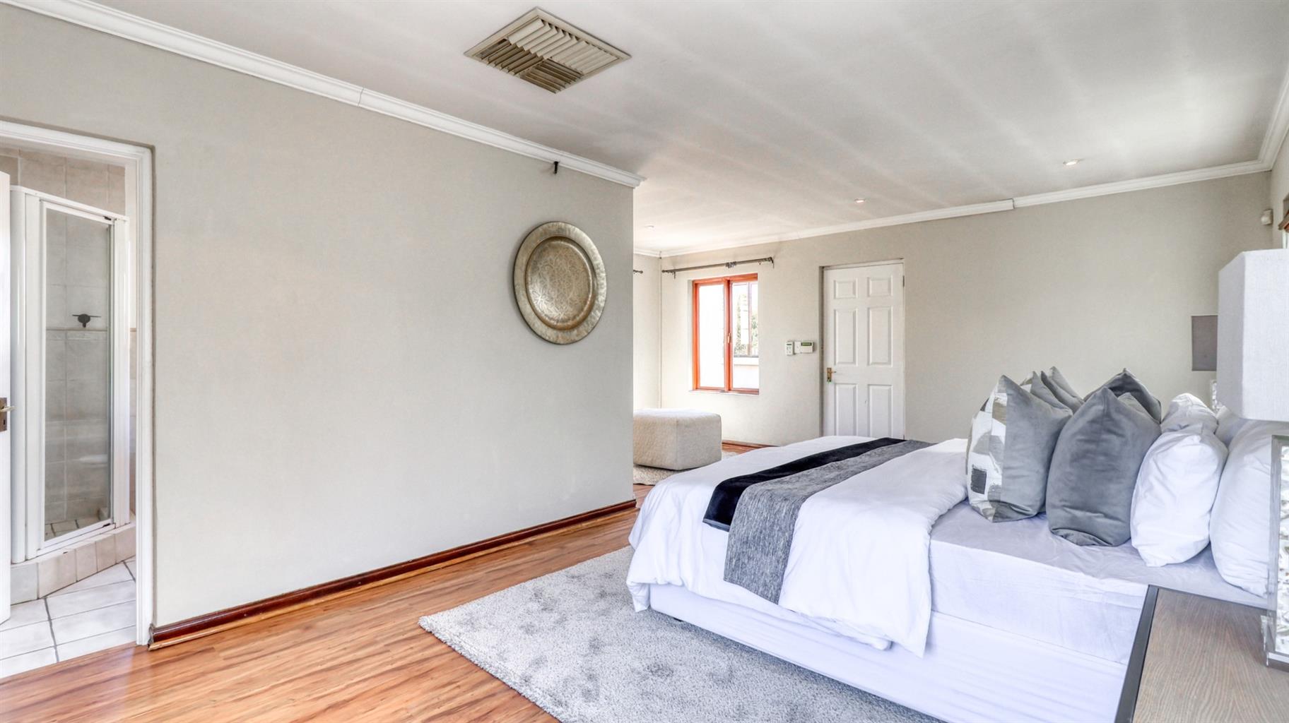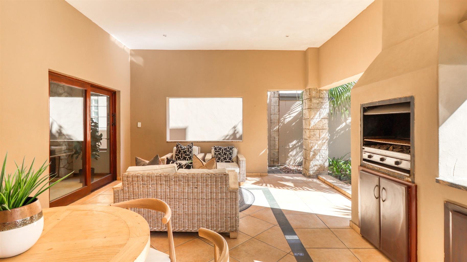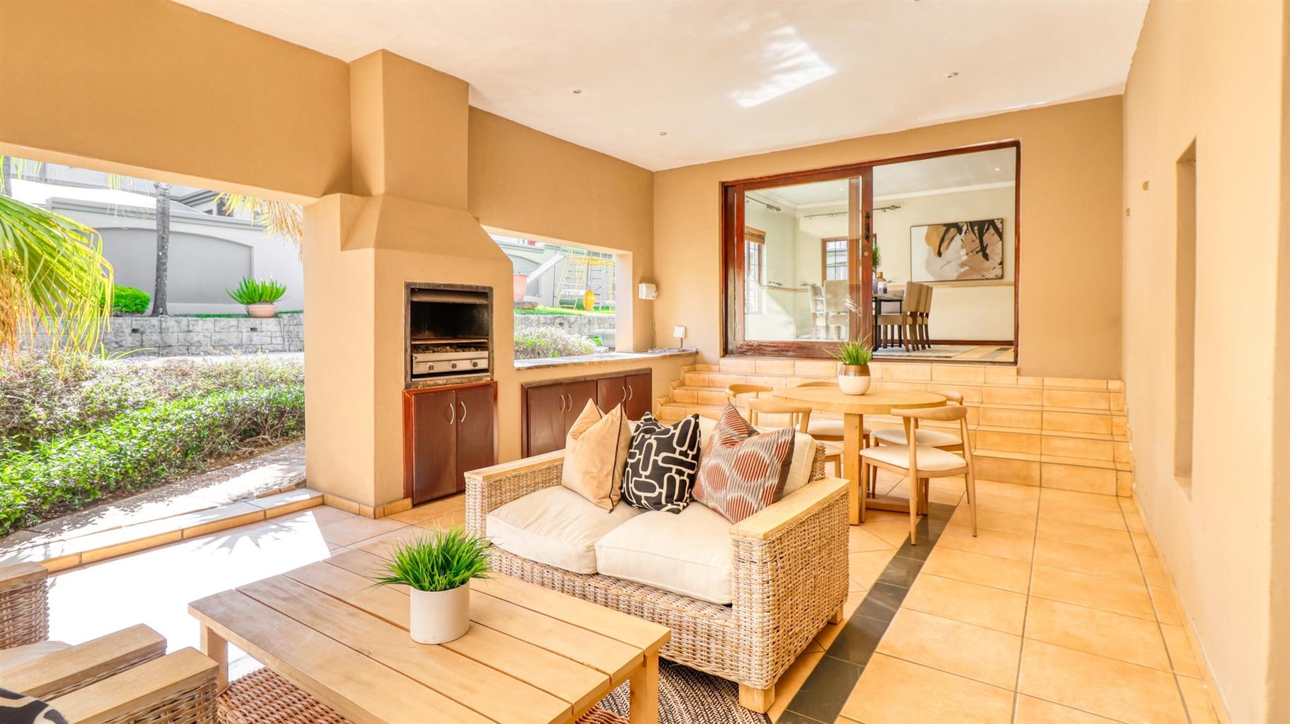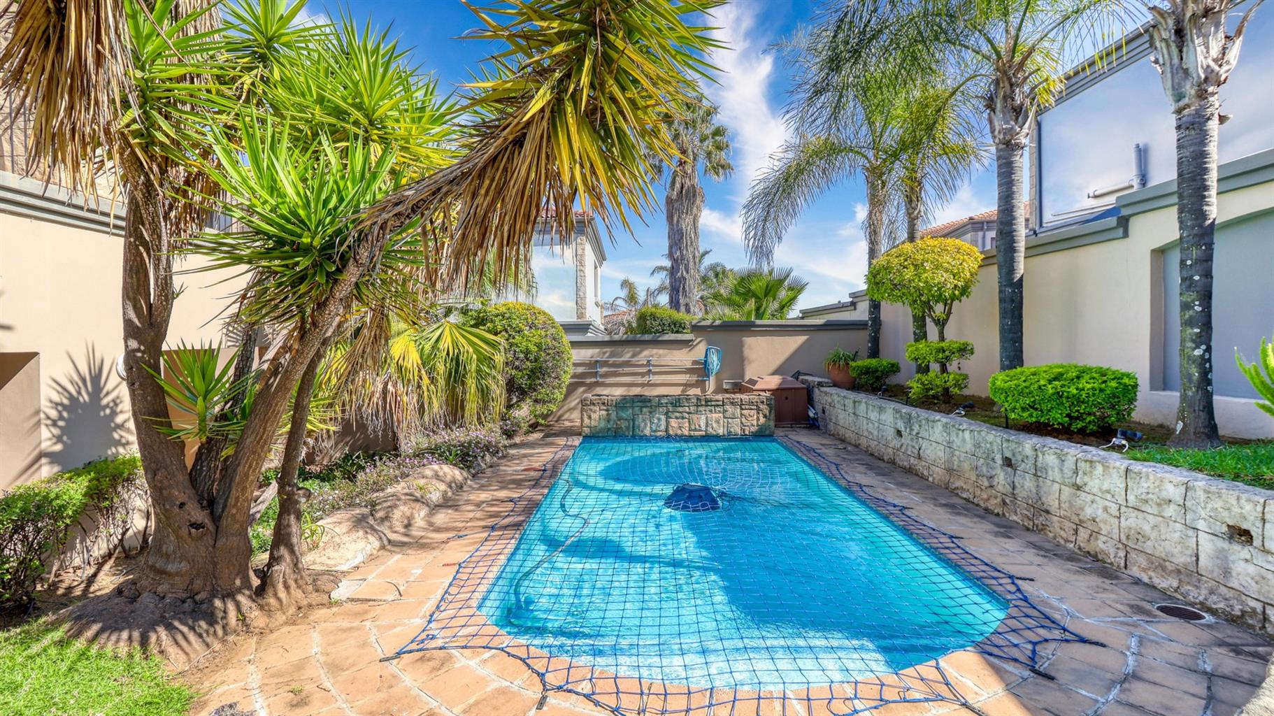 Entertain effortlessly on the covered patio with built-in gas braai, overlooking the landscaped garden and pool. Upstairs boasts four bedrooms with central cooling, two full bathrooms, and a main en-suite with private balcony and pyjama lounge.