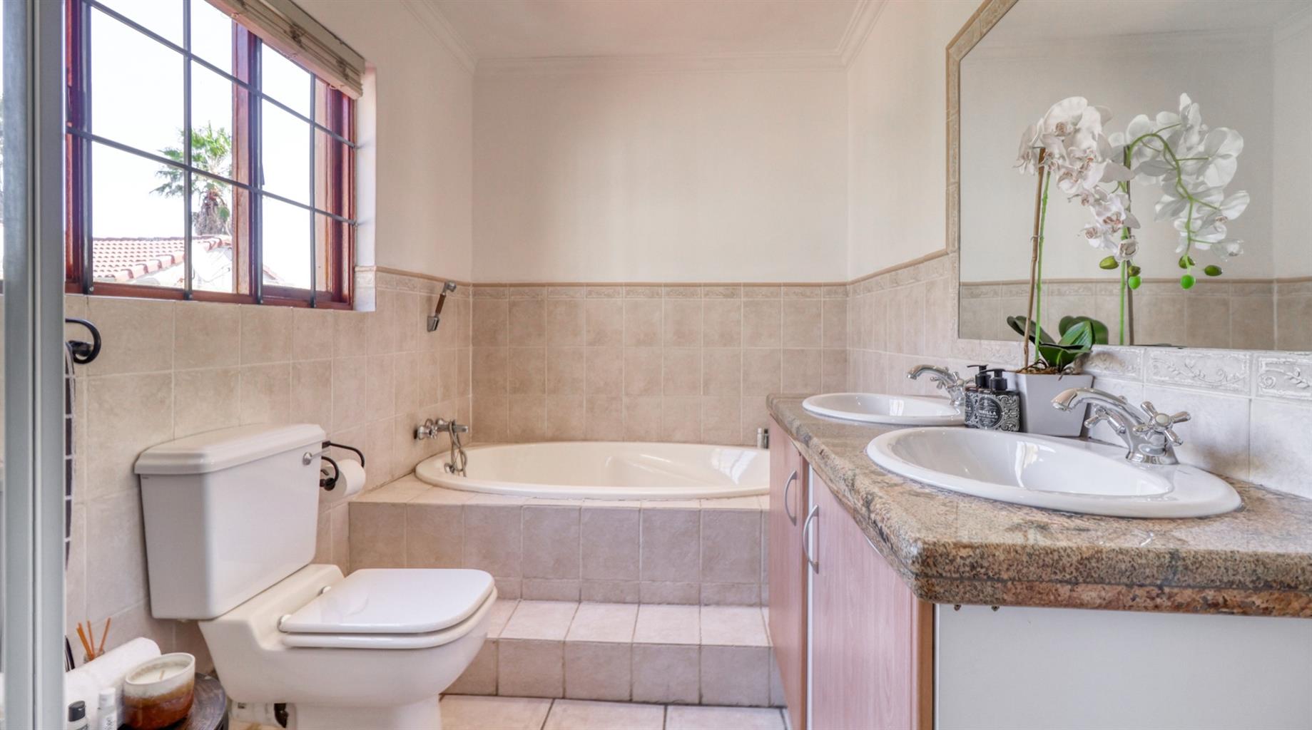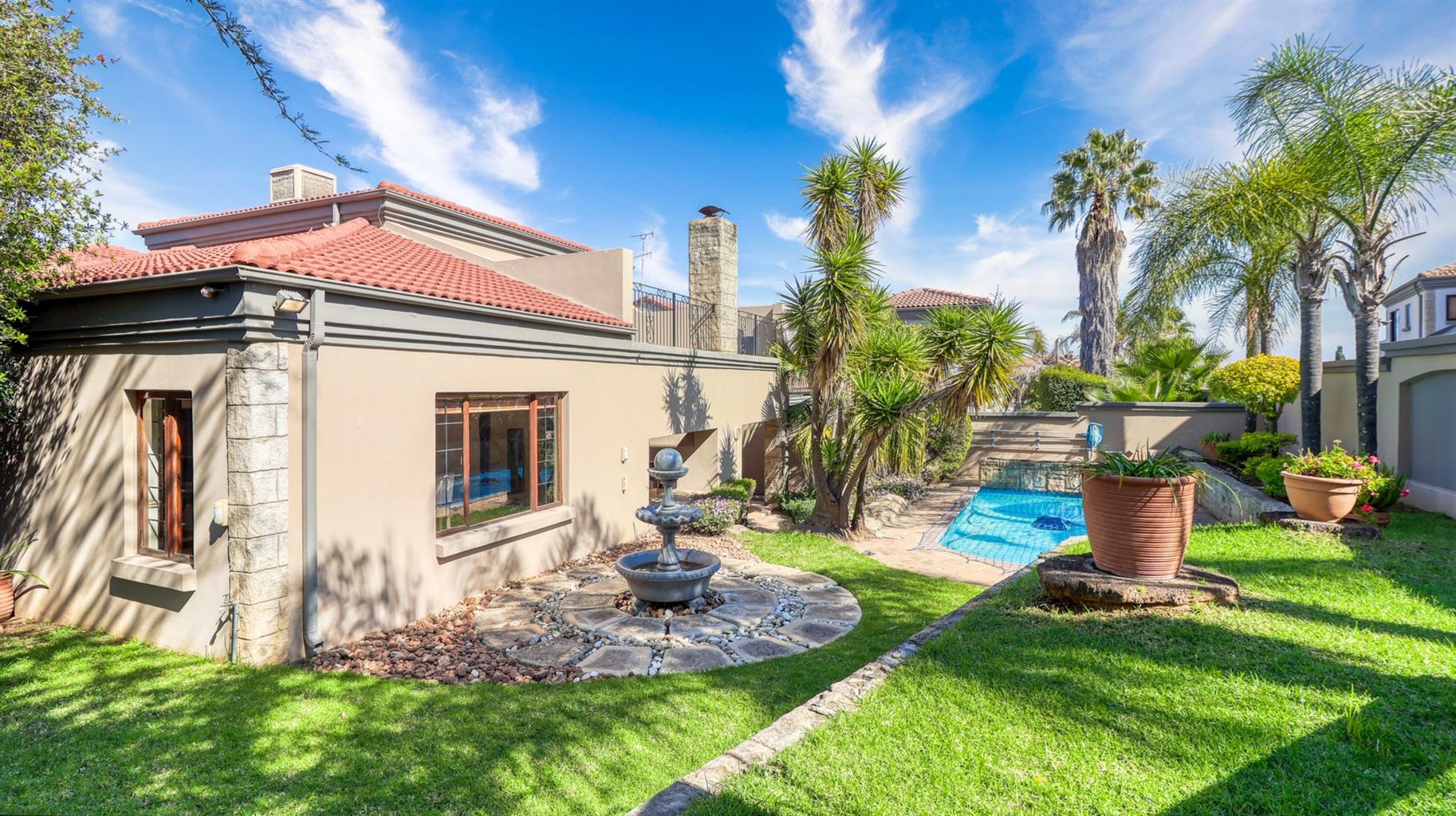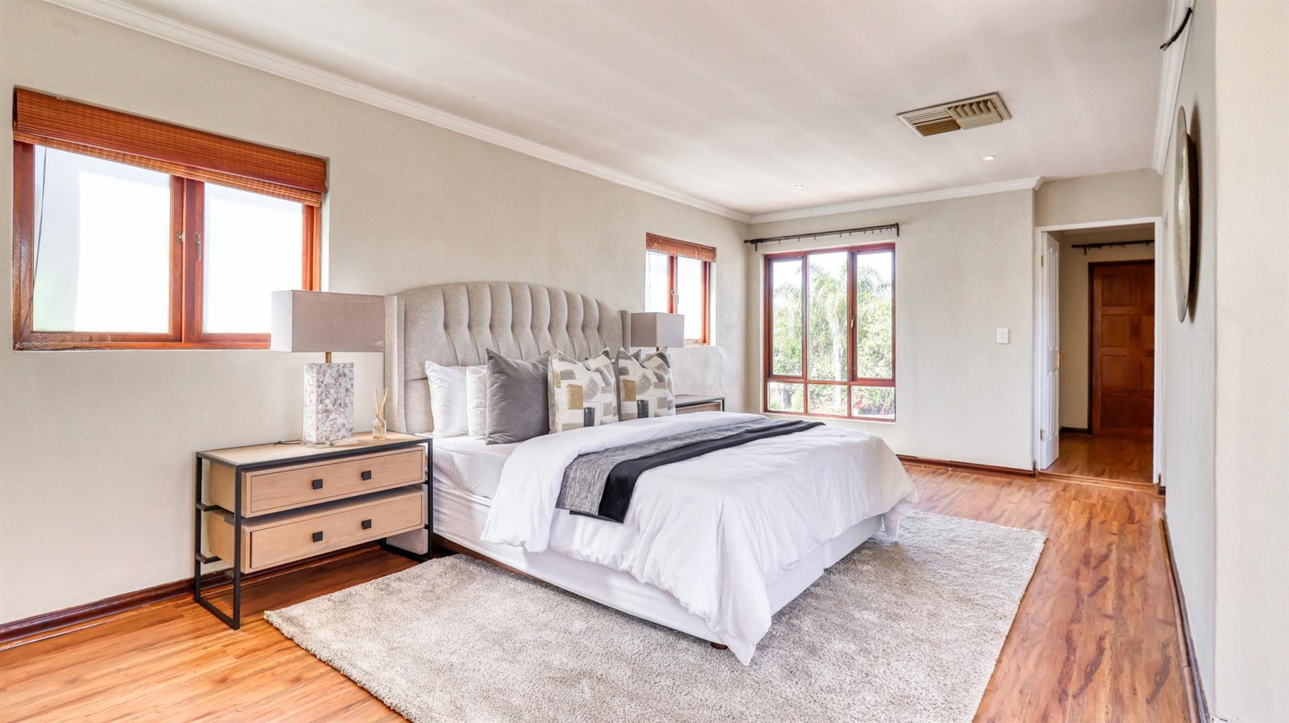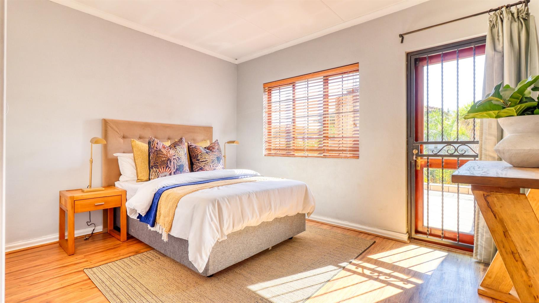 Entertain effortlessly on the covered patio with built-in gas braai, overlooking the landscaped garden and pool. Upstairs boasts four bedrooms with central cooling, two full bathrooms, and a main en-suite with private balcony and pyjama lounge.