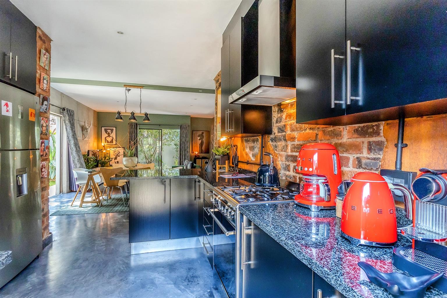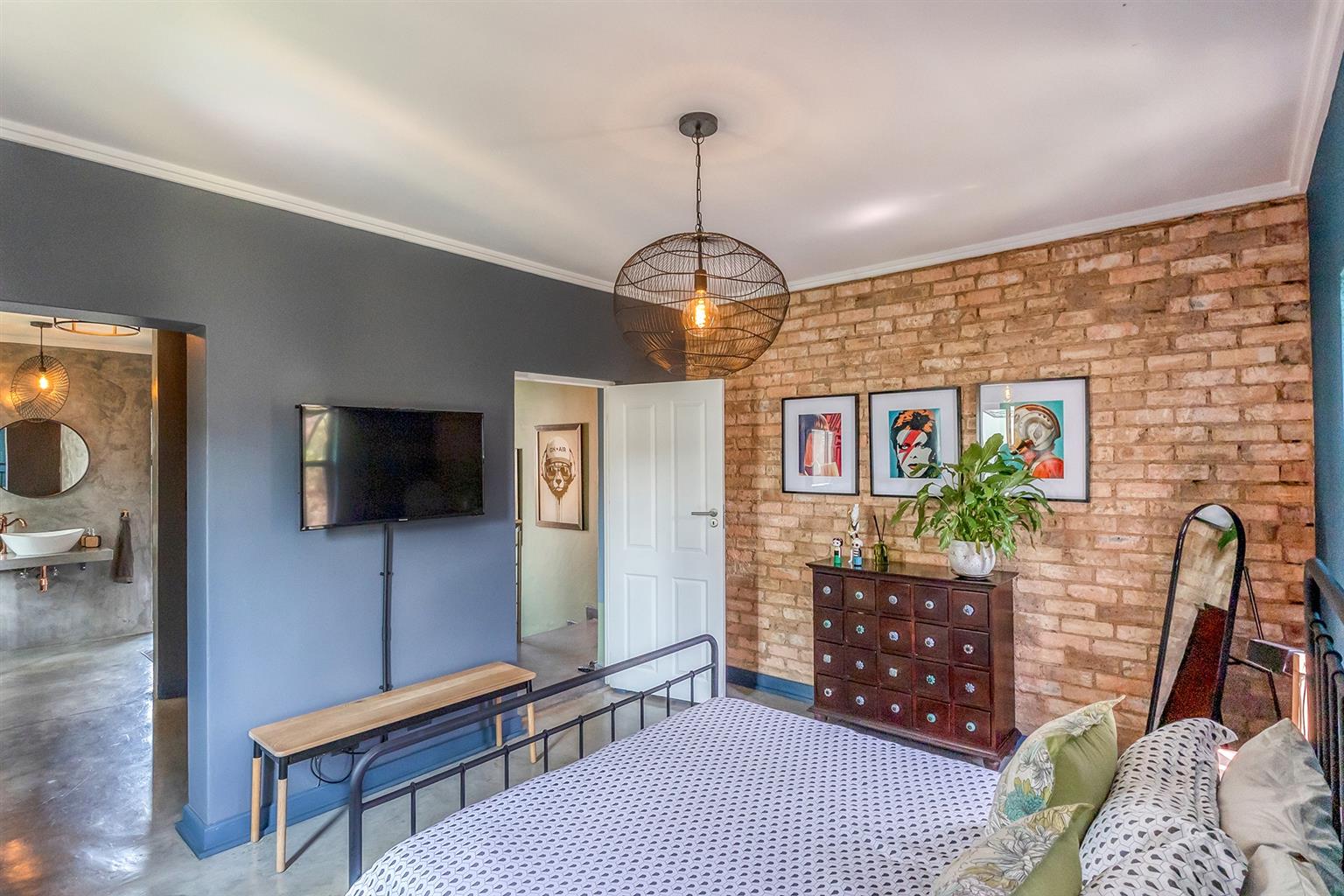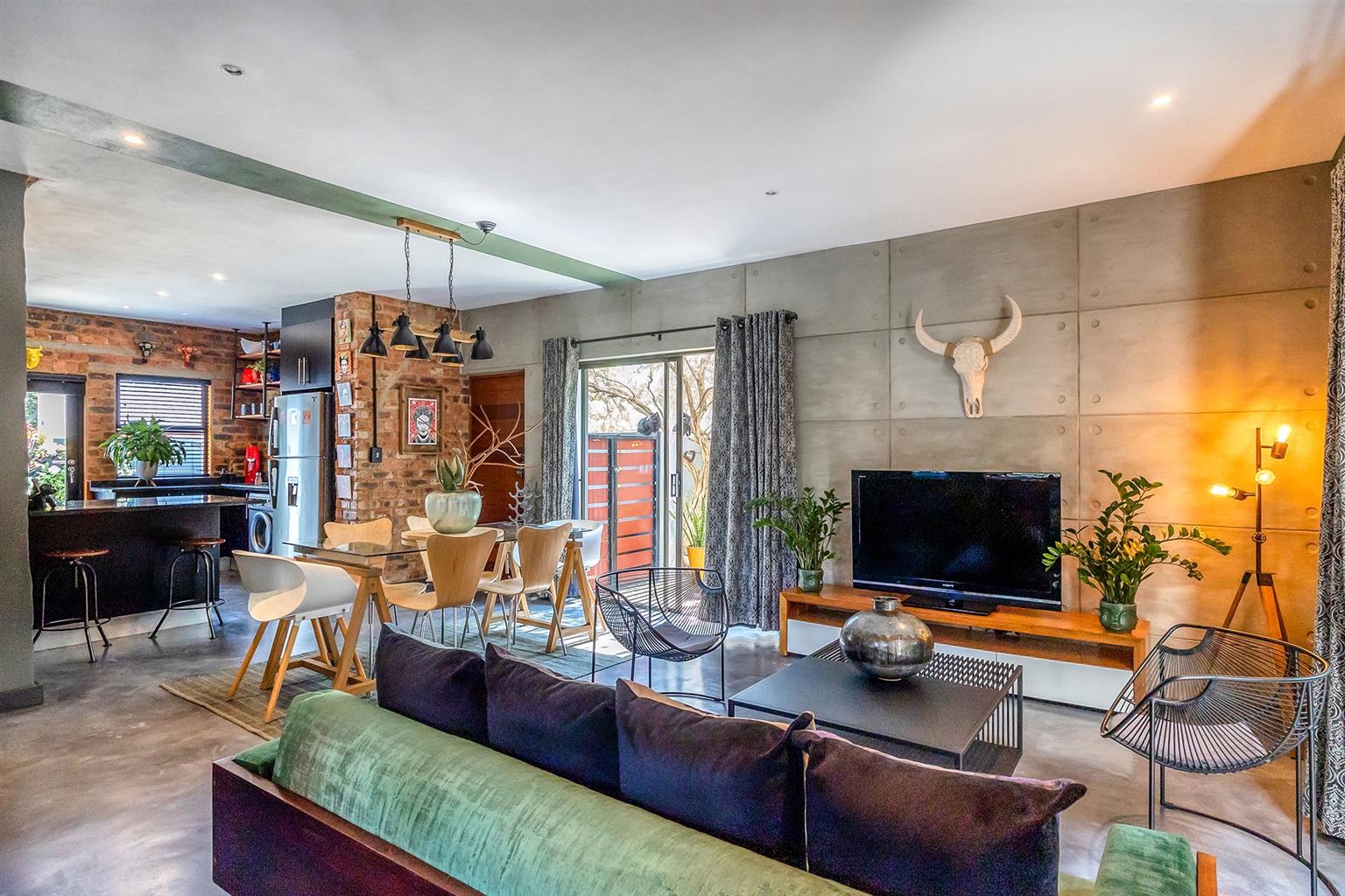 The open-plan living and dining spaces flow effortlessly into a sleek chef’s kitchen, with sliding doors leading to a covered patio, built-in braai, and beautifully landscaped wrap-around garden, perfect for entertaining.