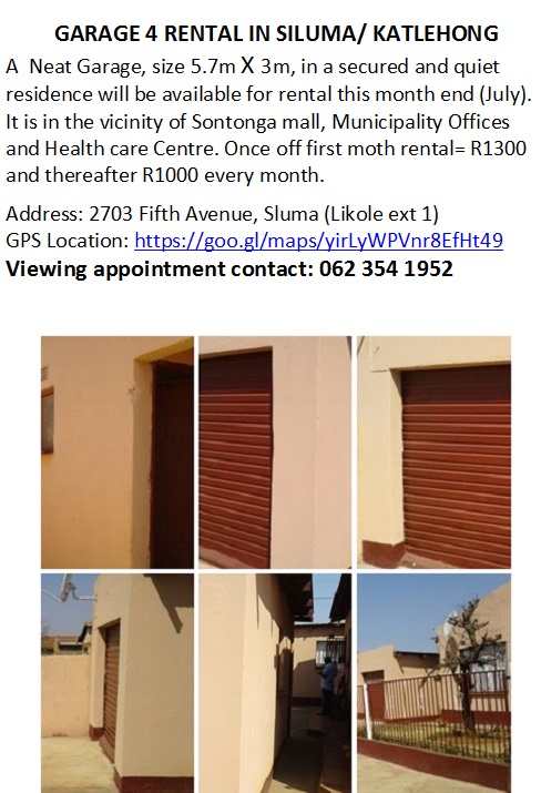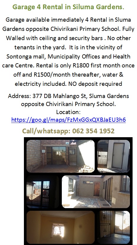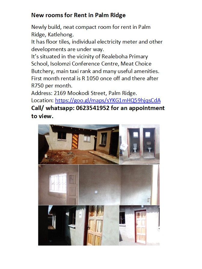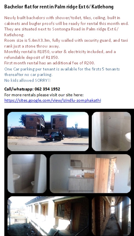 First month rental is R1100 once off, and there after it’s R800 every month. No car parking available.