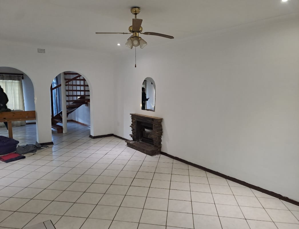 The home features a tiled dining room, a large tiled entrance hall, and a spacious open-plan family room. The bathroom includes a toilet and shower, while a bar adds a special touch to the living space. The kitchen is large with tiled walls and an open-plan layout, supported by a scullery with a double sink and a four-plate stove. The lounge is also large and tiled, with a small tiled study nearby. Windows throughout the home are steel. 2 bathrooms and one ensuite