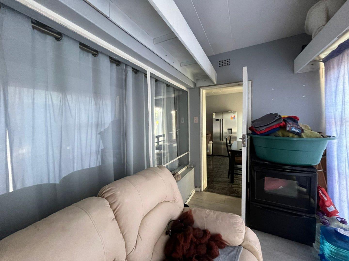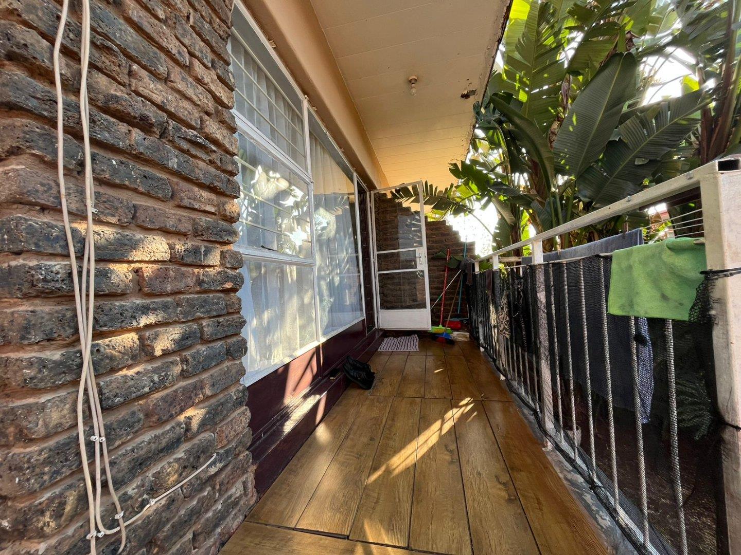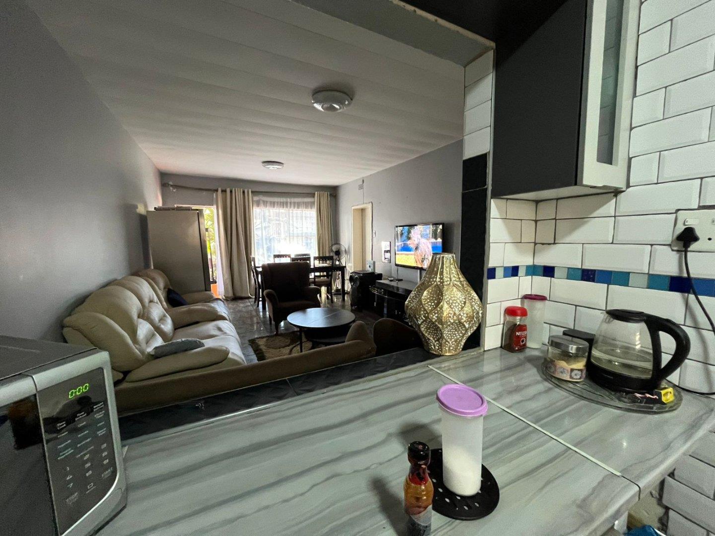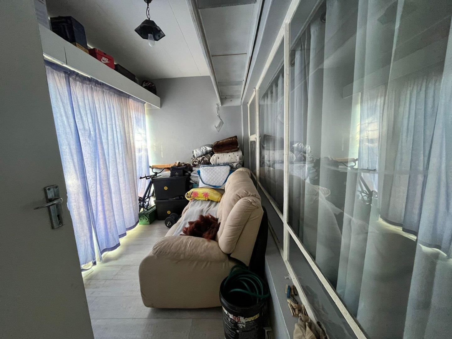It has an open plan lounge and dining area, a sun room which can also be used as a storage room, a well-sized kitchen with modern finishes, one modern bathroom with a sliding door, a bath, basin and toilet. Two bedrooms, the main is very spacious with built-in cupboards, the second bedroom is well-sized with also with built-in cupboards.