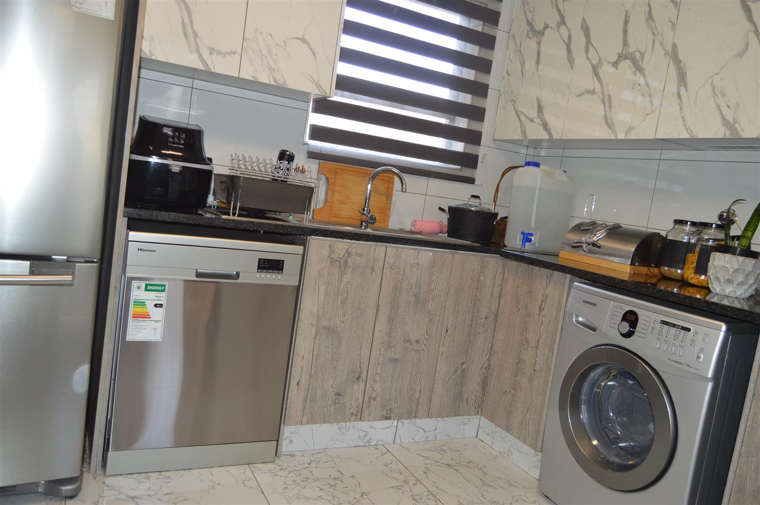 The kitchen has ample built in cupboards and granite tops as well as space for a dishwasher and washing machine.
