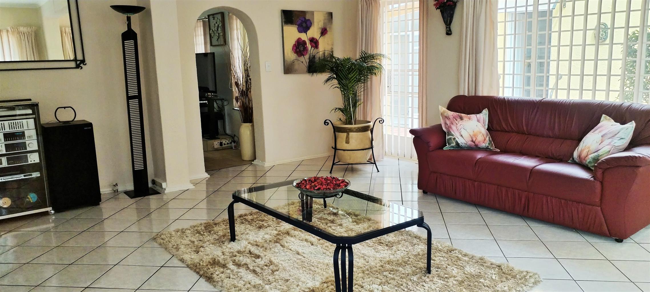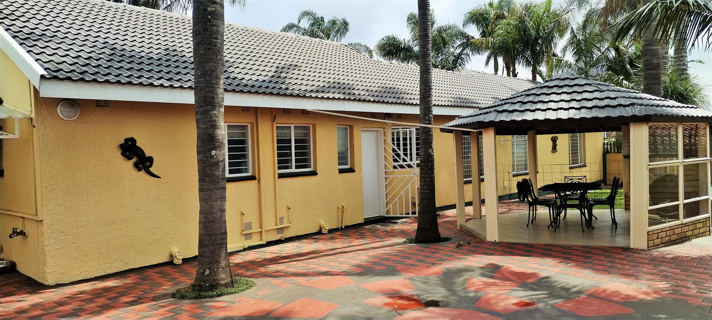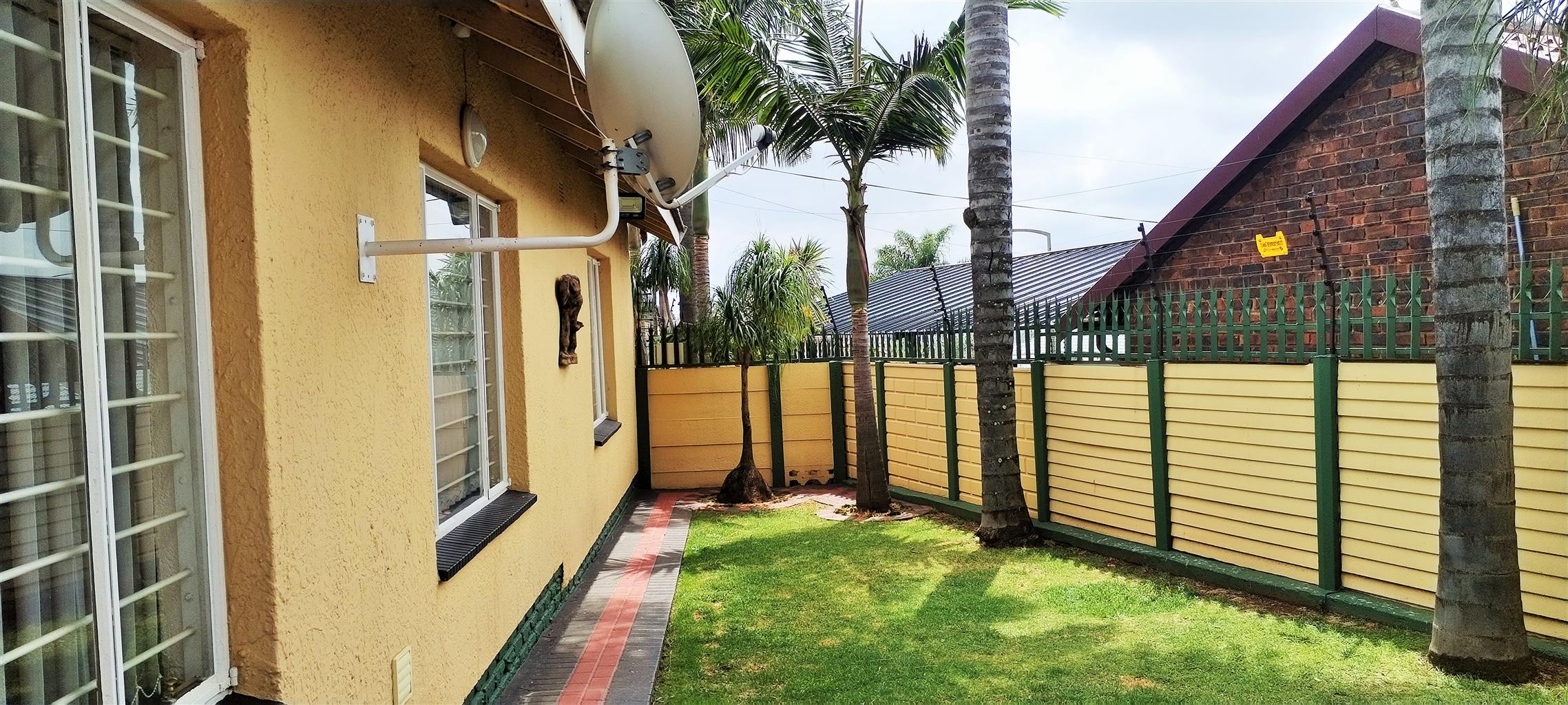 The exterior is designed for relaxation and secure living. The beautiful Lapa provides a perfect setting for outdoor entertaining and alfresco dining. The extremely well-maintained garden, featuring elegant palm trees, evokes a tranquil, vacation-like atmosphere. Security is paramount, with the entire property fully walled and gated.