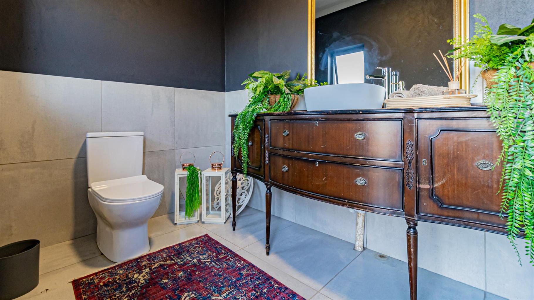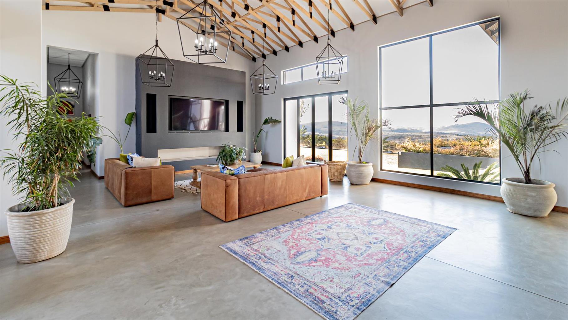 Step inside to discover soaring double-volume ceilings, exposed timber beams, and panoramic glass stacking doors that flood the home with natural light and seamlessly blend indoor luxury with outdoor serenity. The open-plan design features Cemcrete flooring, two biofuel fireplaces, and a designer farm-style kitchen with oak veneer countertops and a high-end Smeg gas stove, ideal for culinary creativity and entertaining.