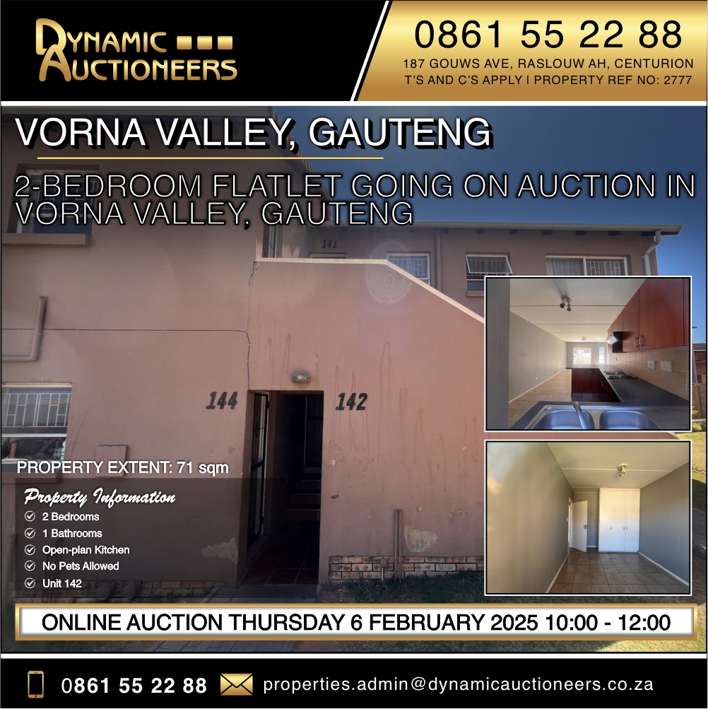 #VornaValleyProperty #FlatletForSale #OnlineAuction #InvestmentOpportunity #GautengRealEstate #RealEstateAuction #2BedroomFlat #ModernLiving #PropertyForSaleSA #ConvenientLiving