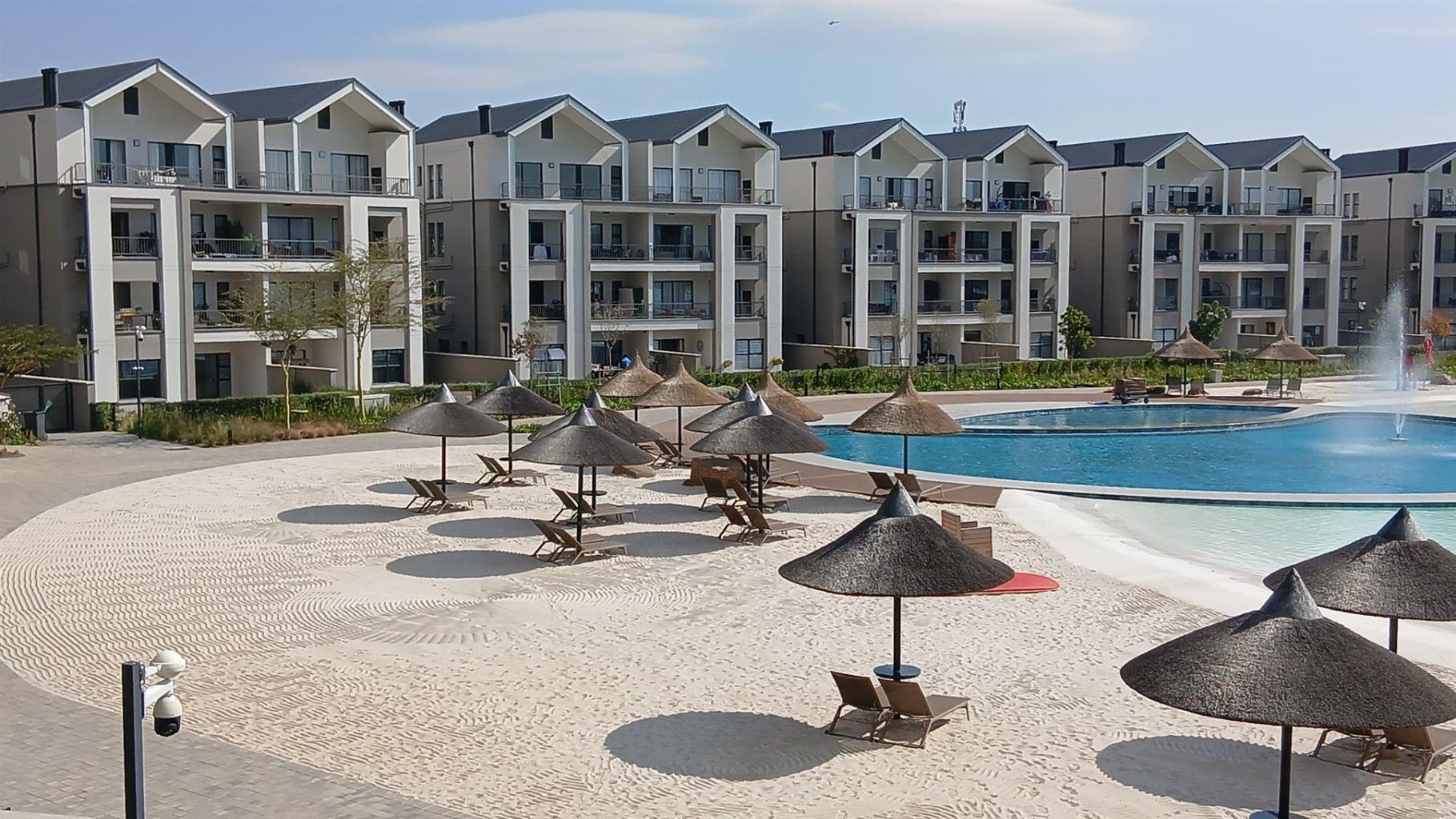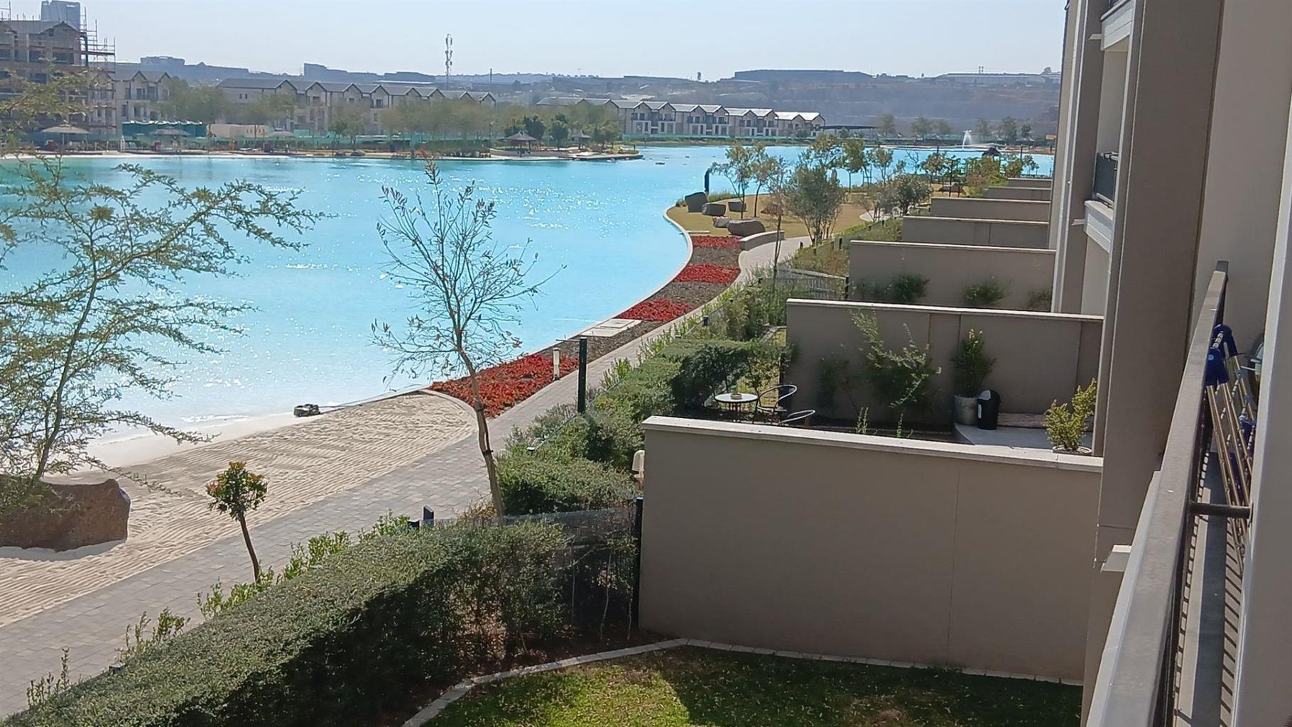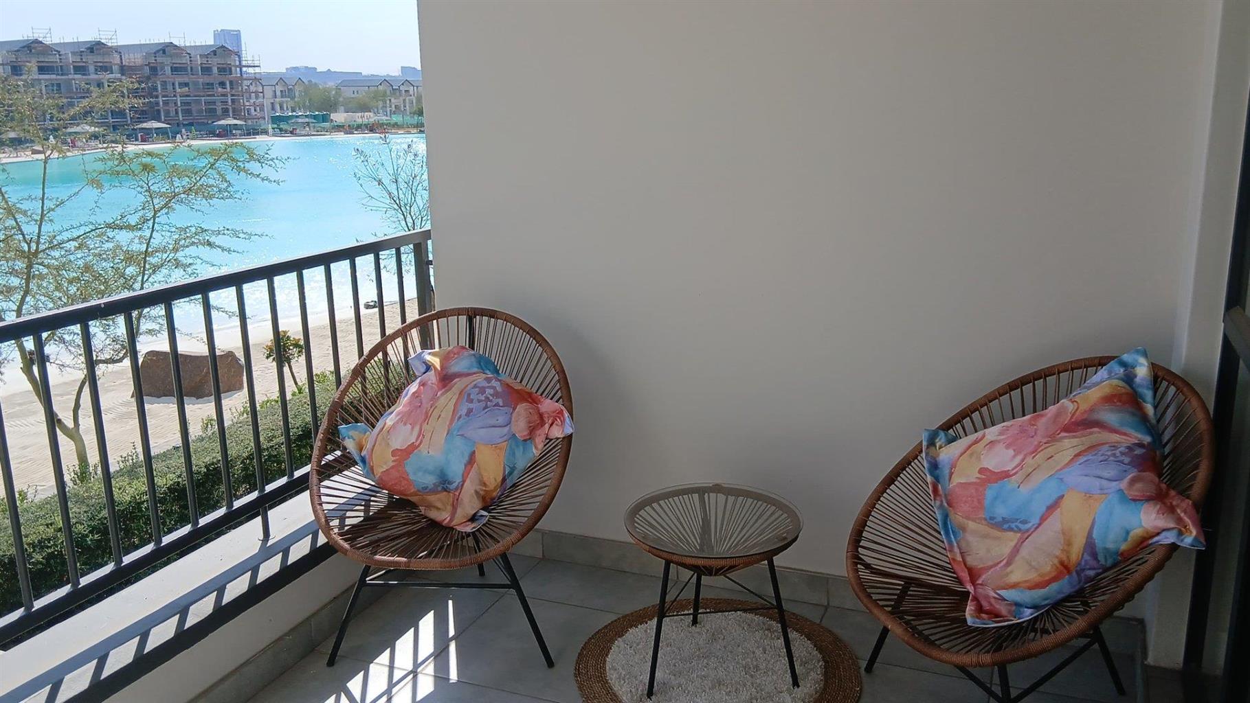 The spacious open-plan lounge and dining area seamlessly flows onto a private balcony, perfect for enjoying the picturesque lagoon views.