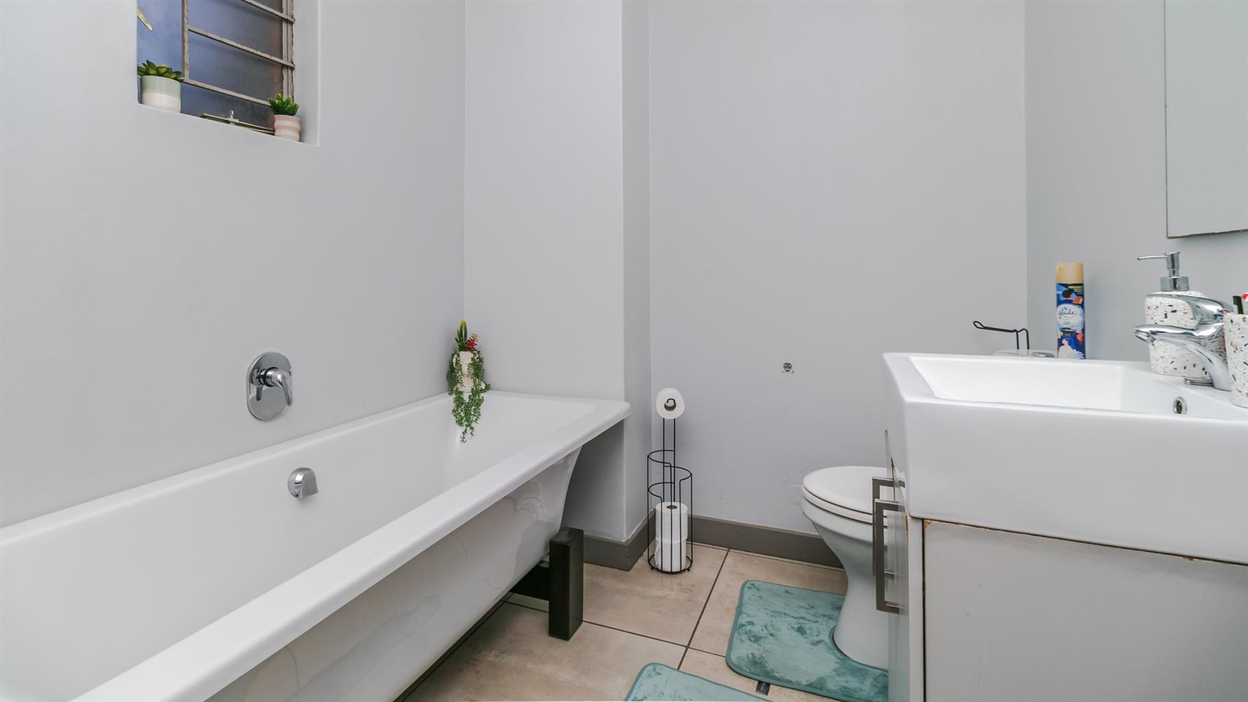 The spacious bedroom provides a tranquil retreat with built in wardrobes. The full bathroom features a bathtub, shower, vanity, and toilet, combining function with a touch of luxury.