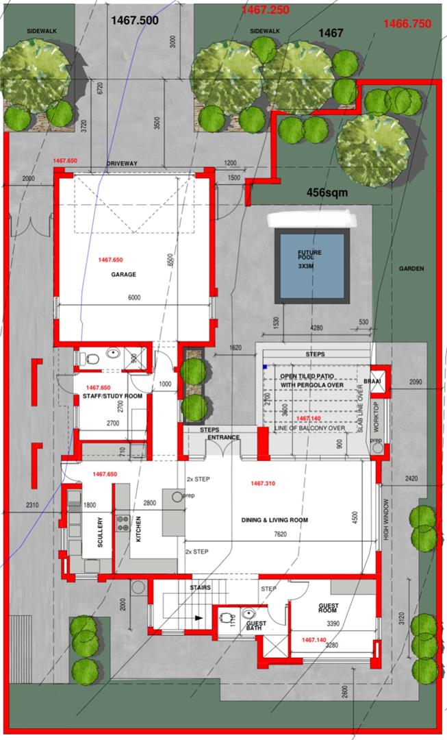 The ground level features an open-concept layout including a modern kitchen with a separate scullery, a spacious dining area, and a comfortable living room with direct access to the sparkling pool. A private guest bedroom with a nearby bathroom provides ideal accommodation for visitors, and a versatile additional room can serve as either staff quarters or a home office/study.