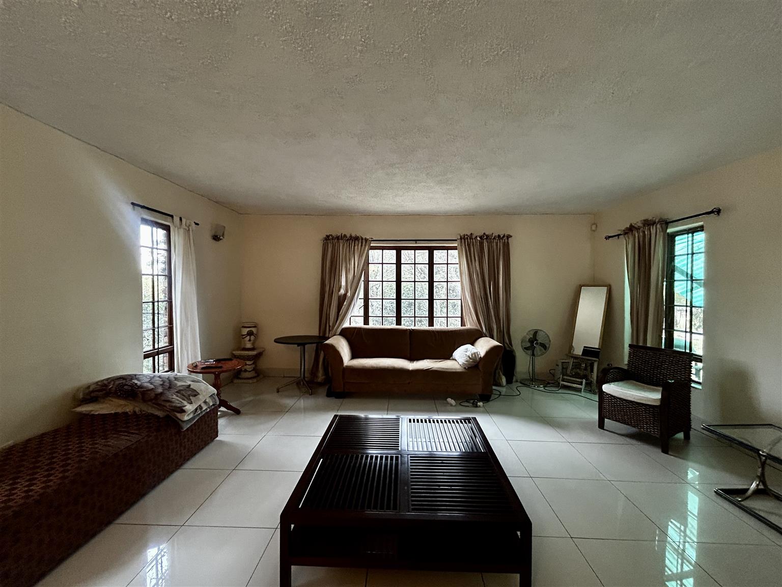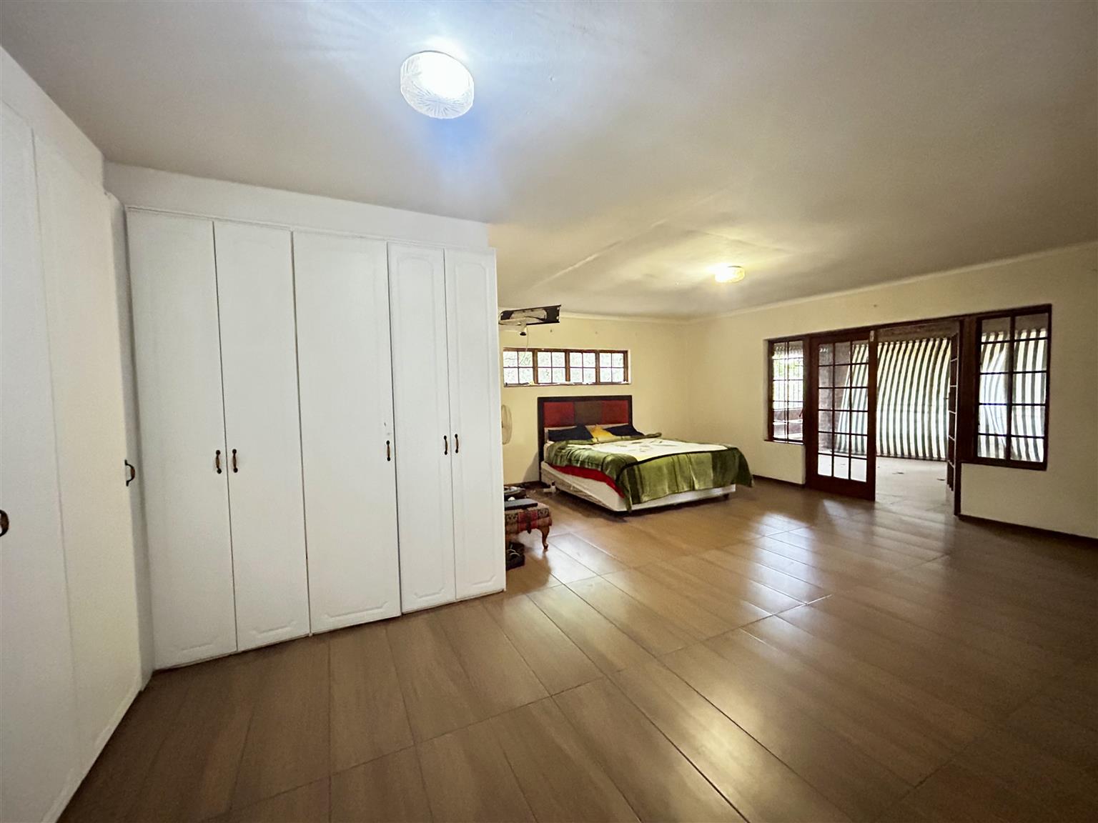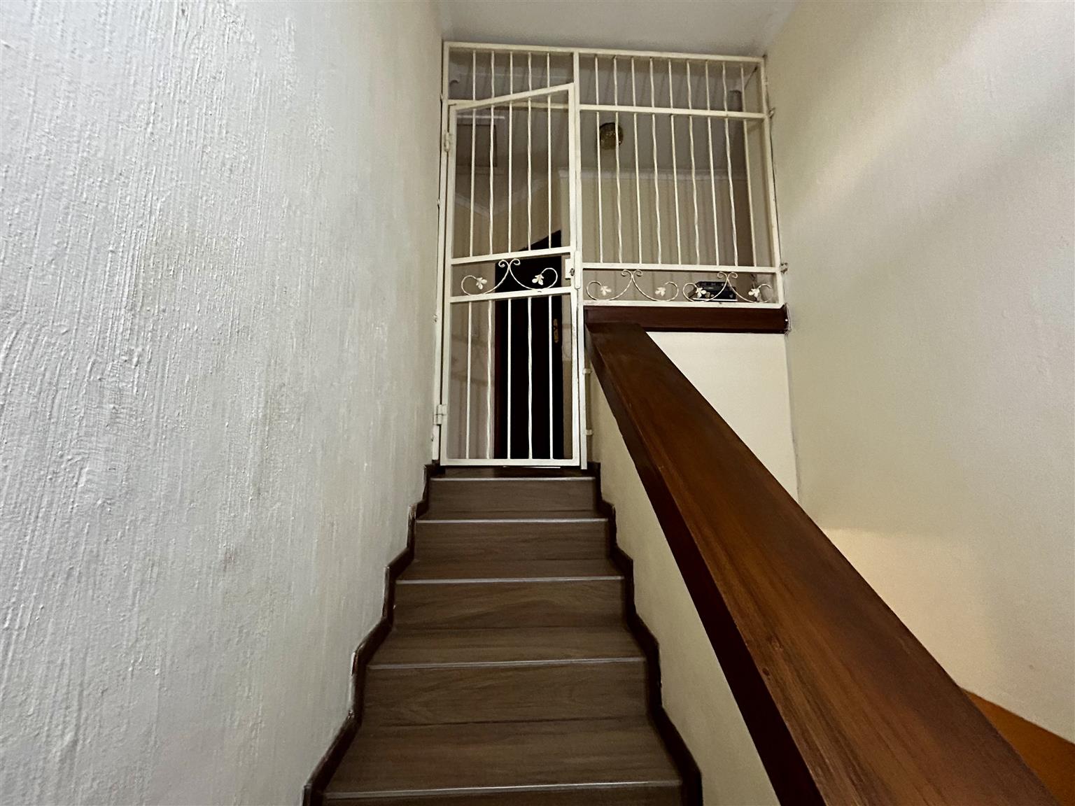 Take the stairs to the 1st floor and on the righ hand side is a bedroom and another small room attached hereto including the 3rd bedroon on this floor.They have a door leading to the long balcony which is also used by the main bedroom. The pajama lounge is located towards the main bedroom and has a door leading to the balcony referred to earliar with a bathroom in the vicinity shared by the other bedrooms. Proceed to the main bedroom on en-suite and a door leading to the balcony overlooking the garden and swimming pool.