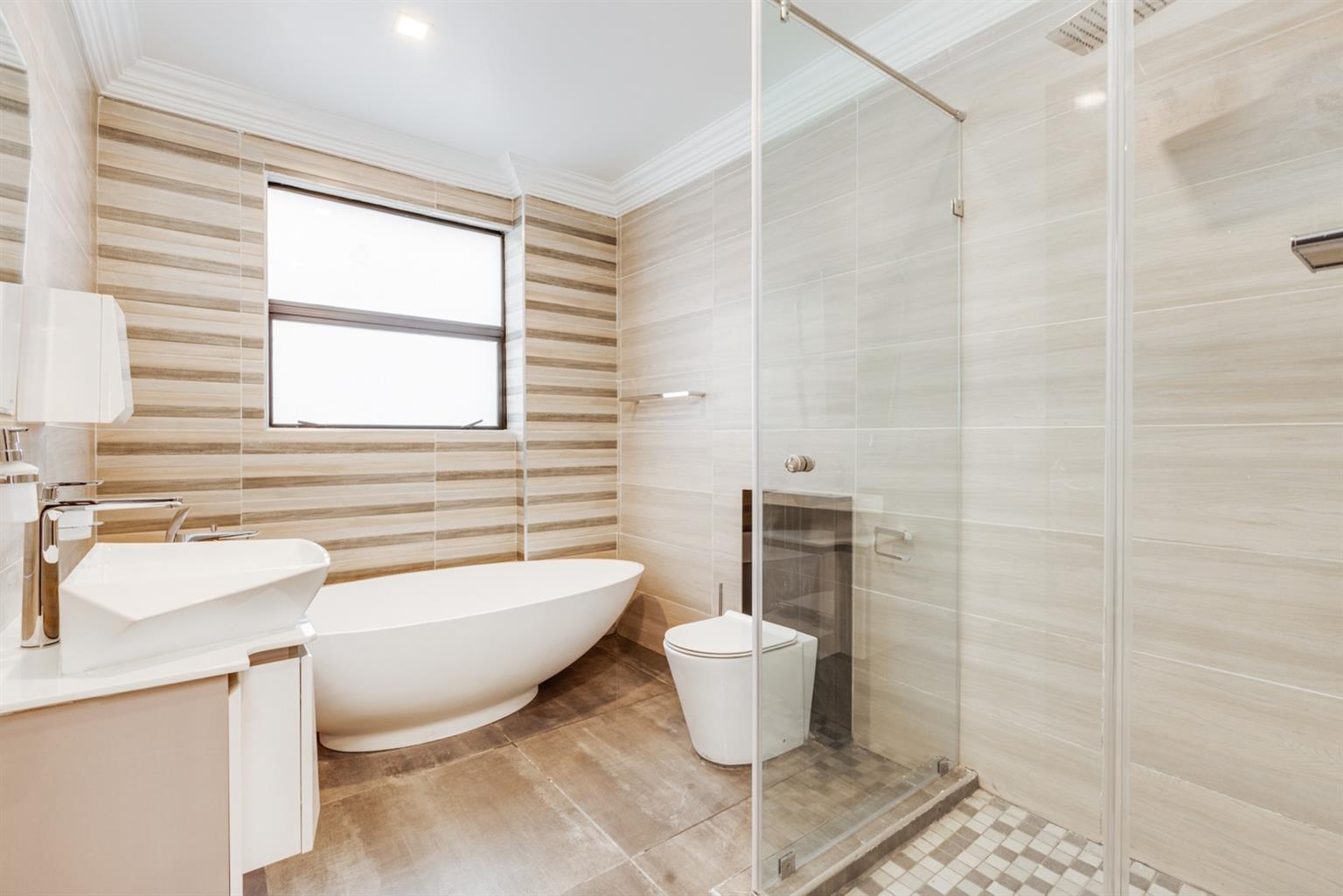 A beautiful 5-bed north-facing home with double volume entrance hall, open-plan living and dining area, placed around a double-sided gas fireplace. An indoor built-in bar counter with a place for an under-counter fridge. The drinks cabinet and braai area with glass sliding doors lead to the swimming pool area.