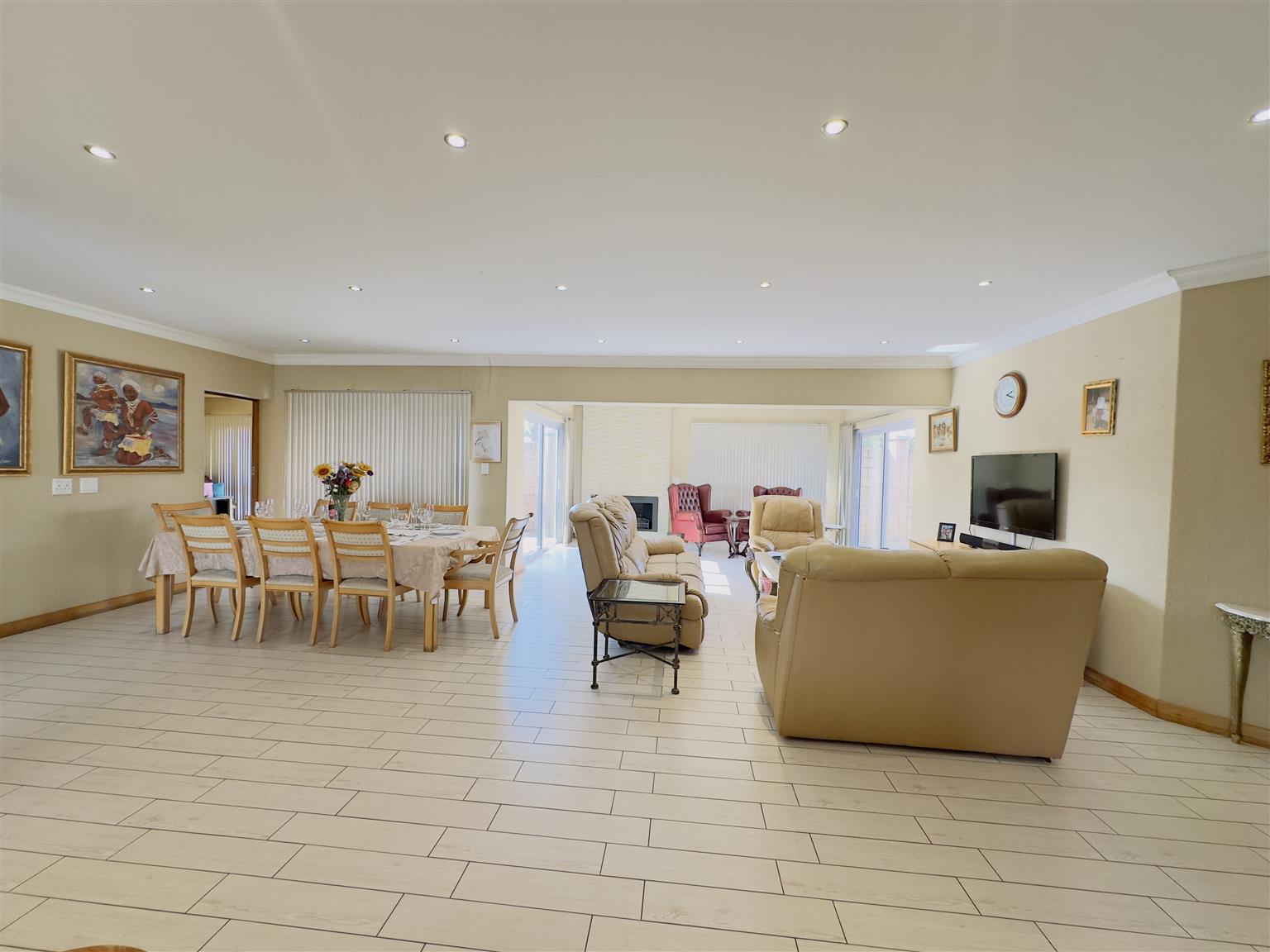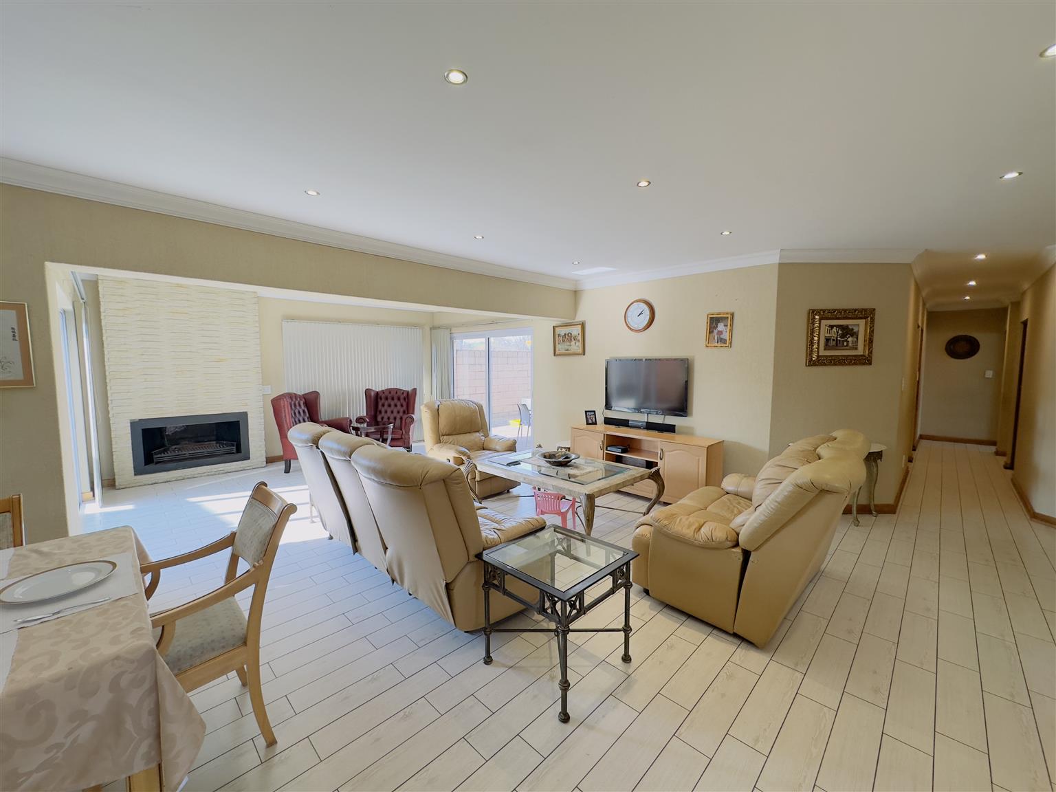 The home features a well-appointed kitchen with a stove, extractor fan, oven, and a separate scullery. The dining area flows into a spacious lounge fitted with a cozy fireplace and sliding doors leading to the outside. There’s also a study or office space with underfloor heating—perfect for working from home.
