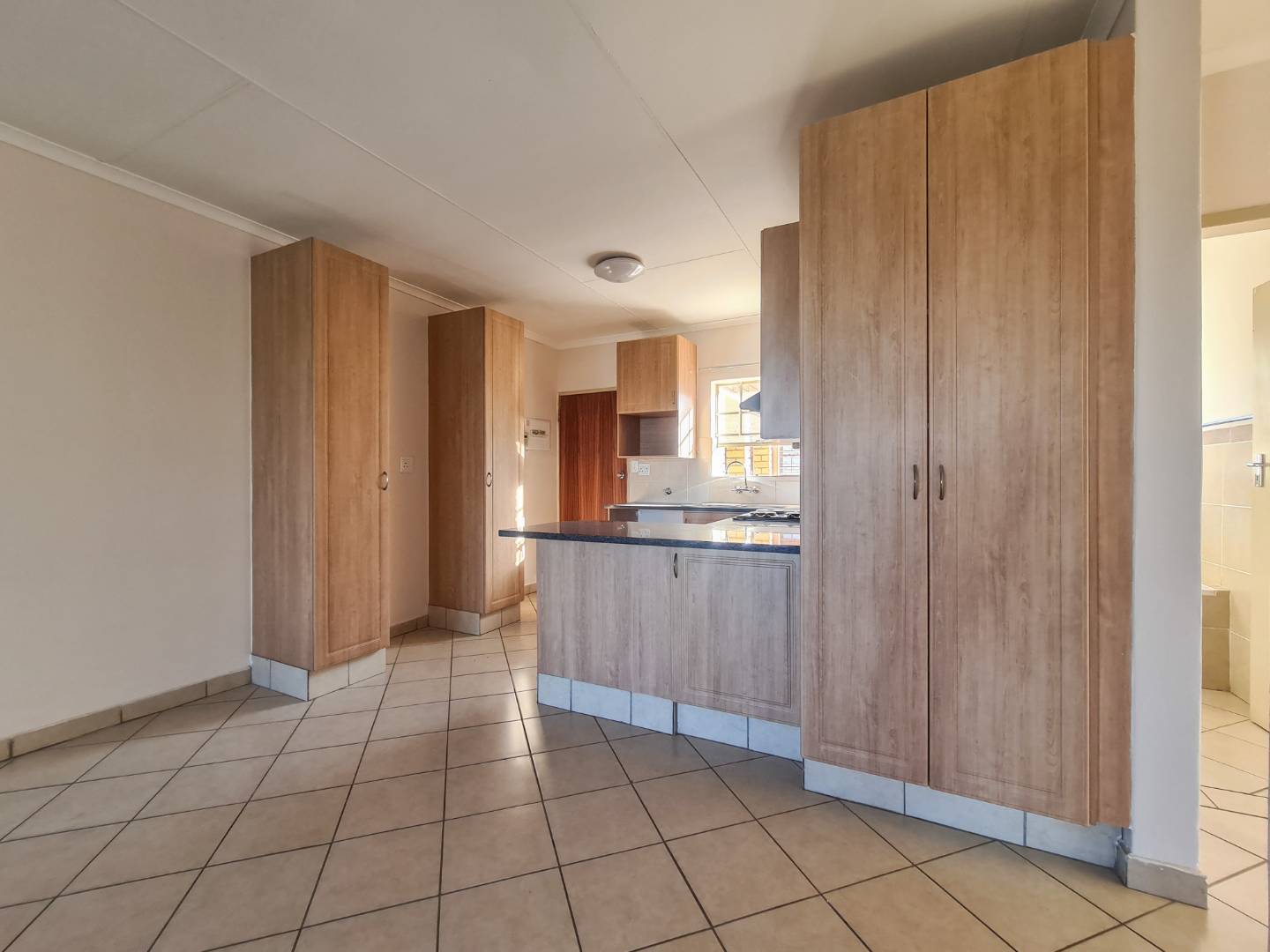This spacious and bright apartment consists of an open-plan kitchen that is a dream with generous light wood storage cupboards, black stonework surfaces, space for two under-counter appliances, and a small breakfast nook.