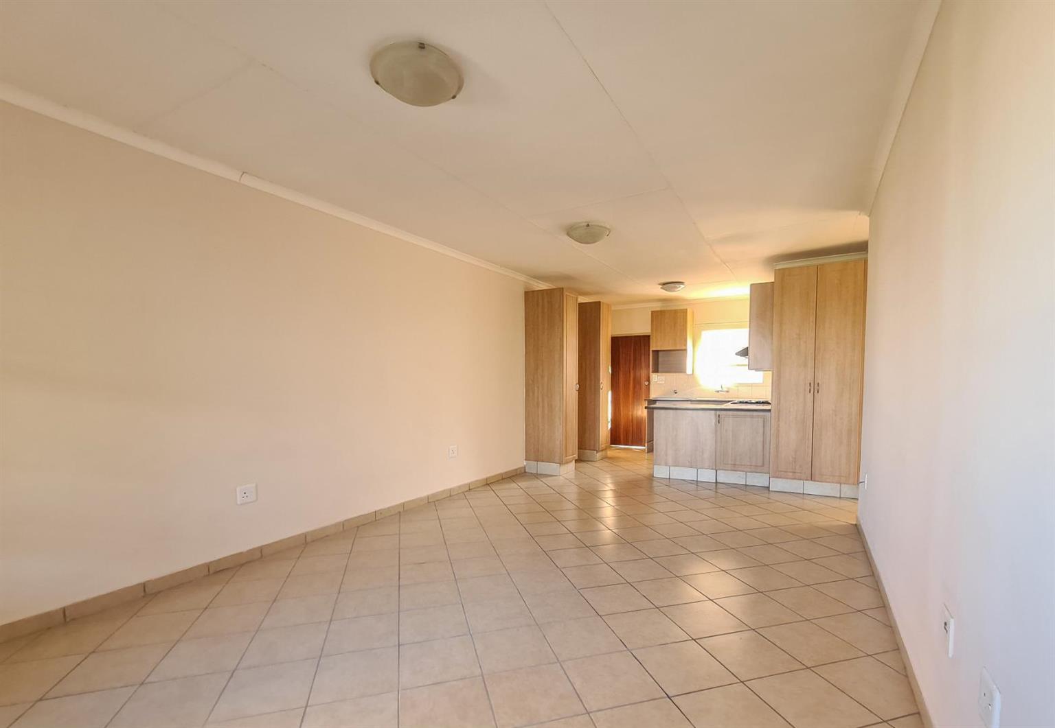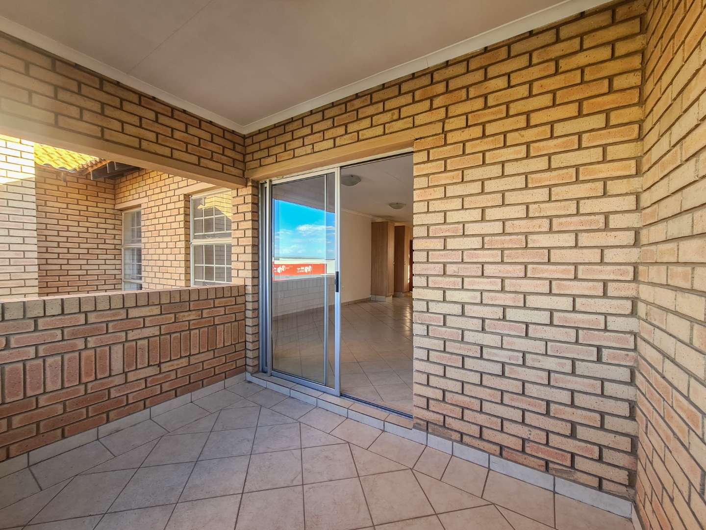 A spacious living room/lounge with a sliding door that leads onto a covered balcony that has a built-in-braai.