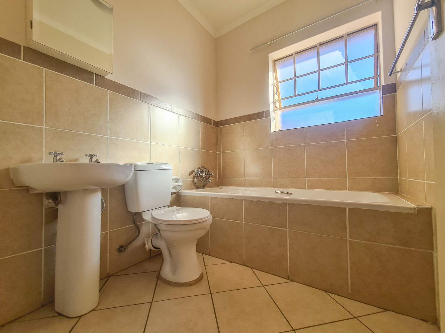 The remaining bedroom is a medium-sized room with built-in cupboards. The second bathroom is a shared bathroom complete with a toilet, basin, and bath.