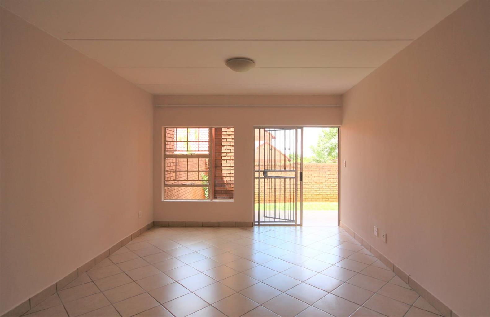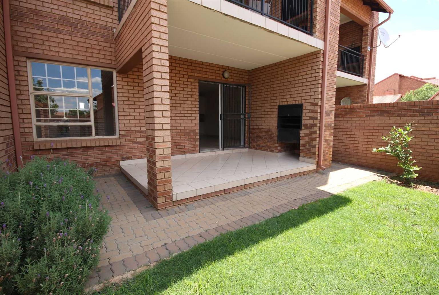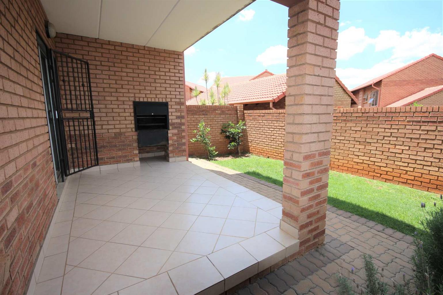 This unit has a spacious living room/lounge with a sliding door and security gate that leads onto a covered patio that has a built-in-braai and a private garden.