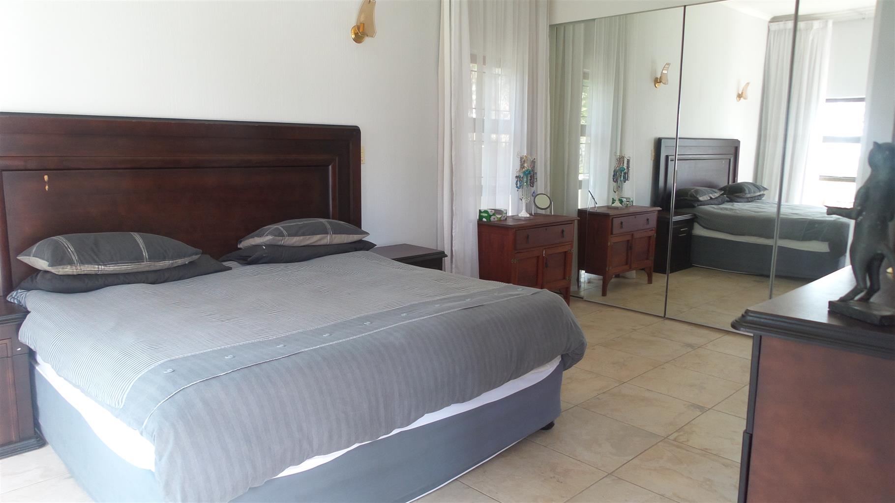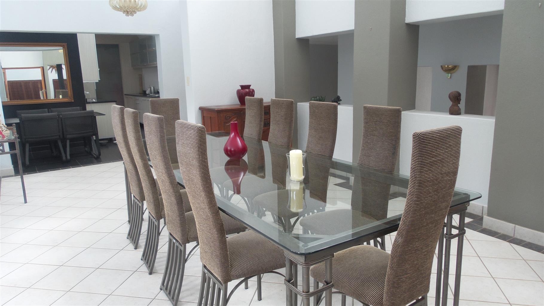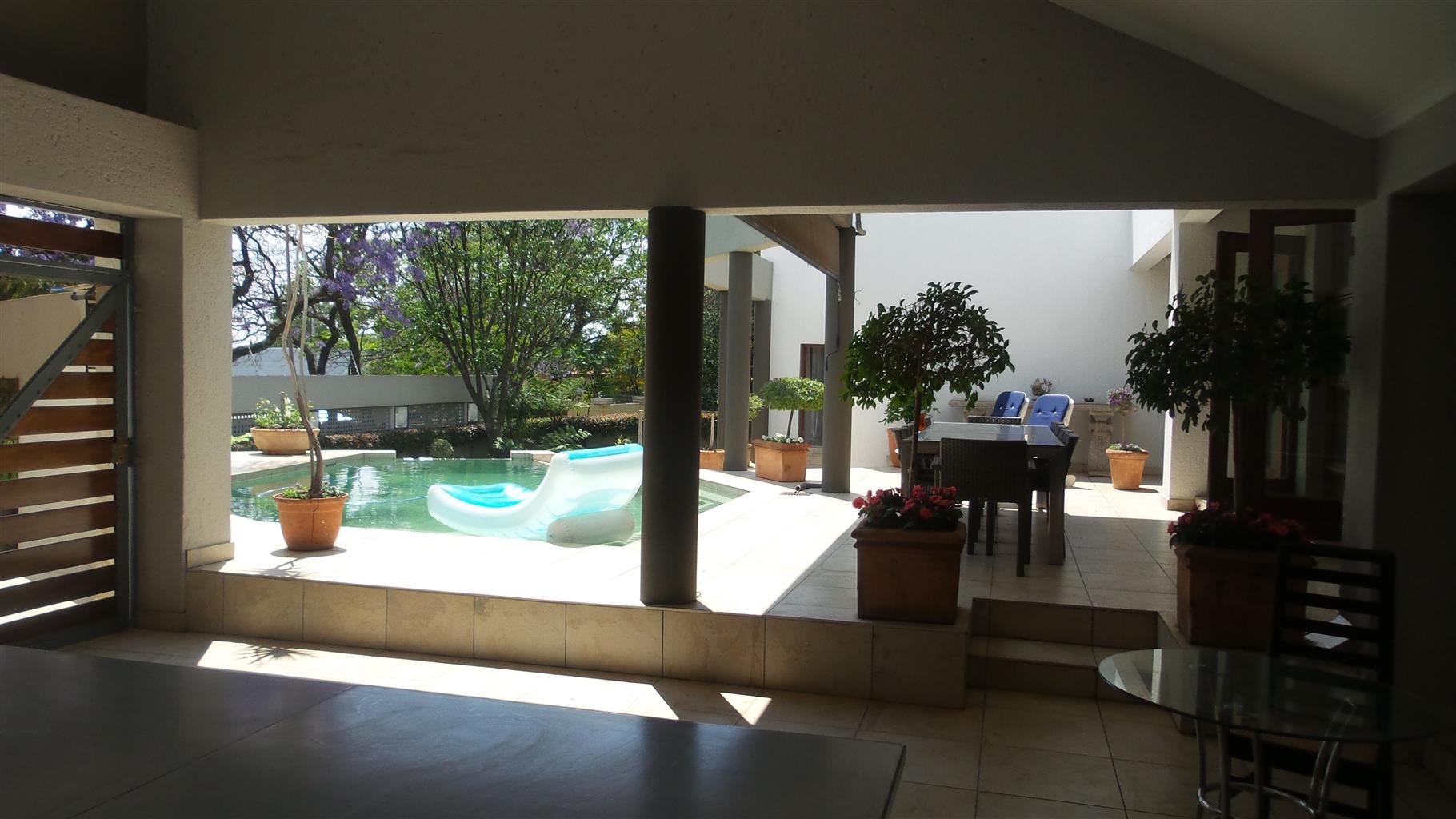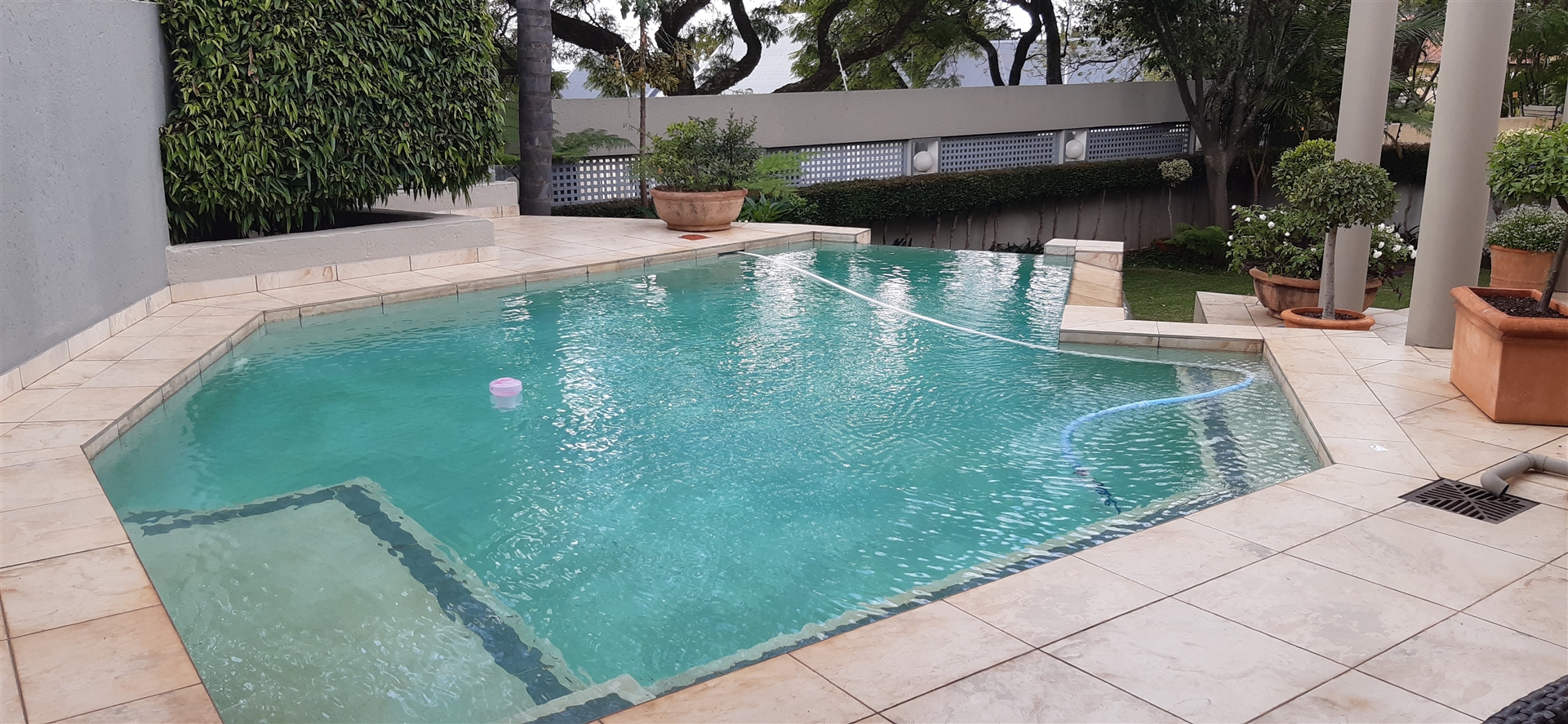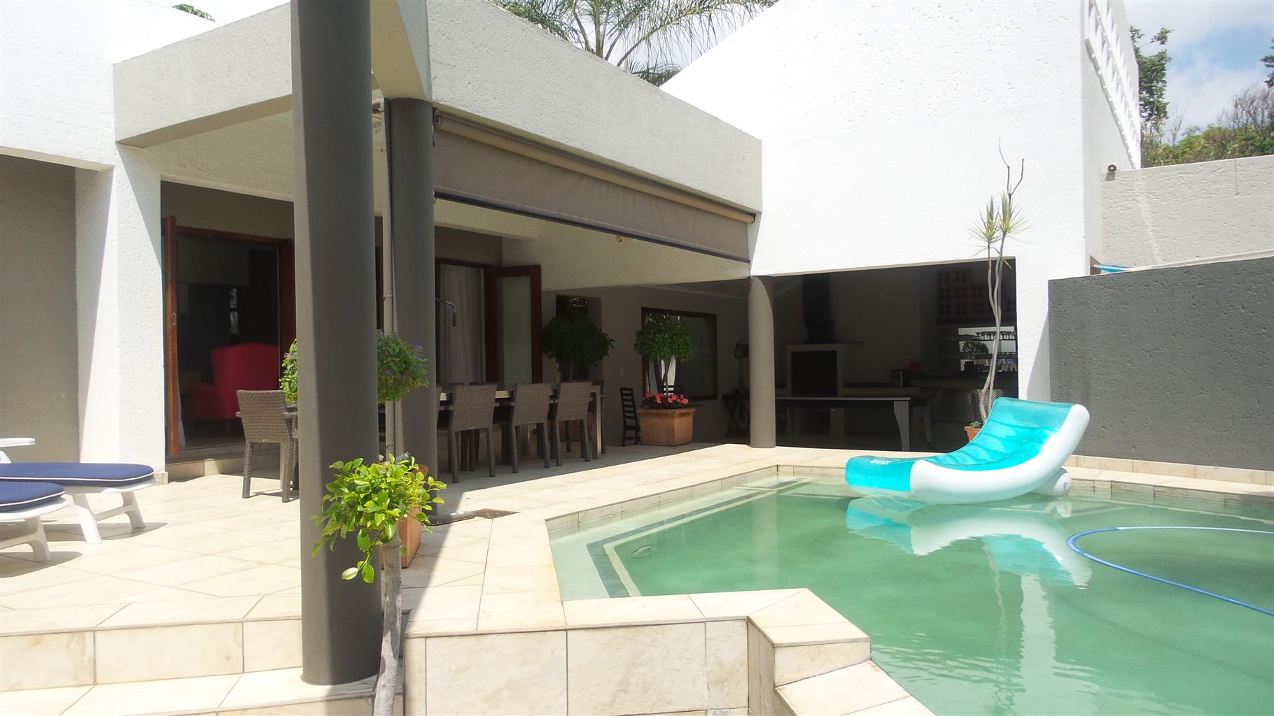 Uncluttered design with sleek and sophisticated elegance. Excellent finishes complimented by modern open-floor plan living gives this house a spacious, airy, roomy feel. The design centers around a wrap-around patio/entertainment area, lush garden and a rim-flow pool, all ensuring a superb lifestyle and easy living. A design of flair and architectural integrity maximizing the South African sun and light throughout the house. Excellent security. Excludes electricity and water. Includes Garden and Pool maintenance.
