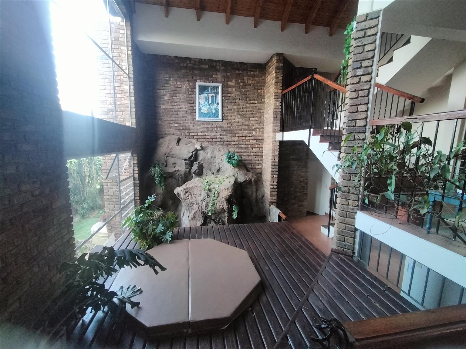 Nestled against the majestic Magaliesberg in the sought-after suburb of Florauna, this uniquely designed six-level home offers space, style, and serenity. With multiple living areas, a fully-equipped bar and entertainment zone complete with a built-in braai and jacuzzi, plus a second braai on the patio overlooking the landscape, this property is perfect for entertainers and families alike. The main bedroom is exceptionally spacious with a full en-suite bathroom, while the home is further enhanced with solar power, a 40,000-litre rainwater harvesting system, and a flourishing vegetable garden—ideal for sustainable living.