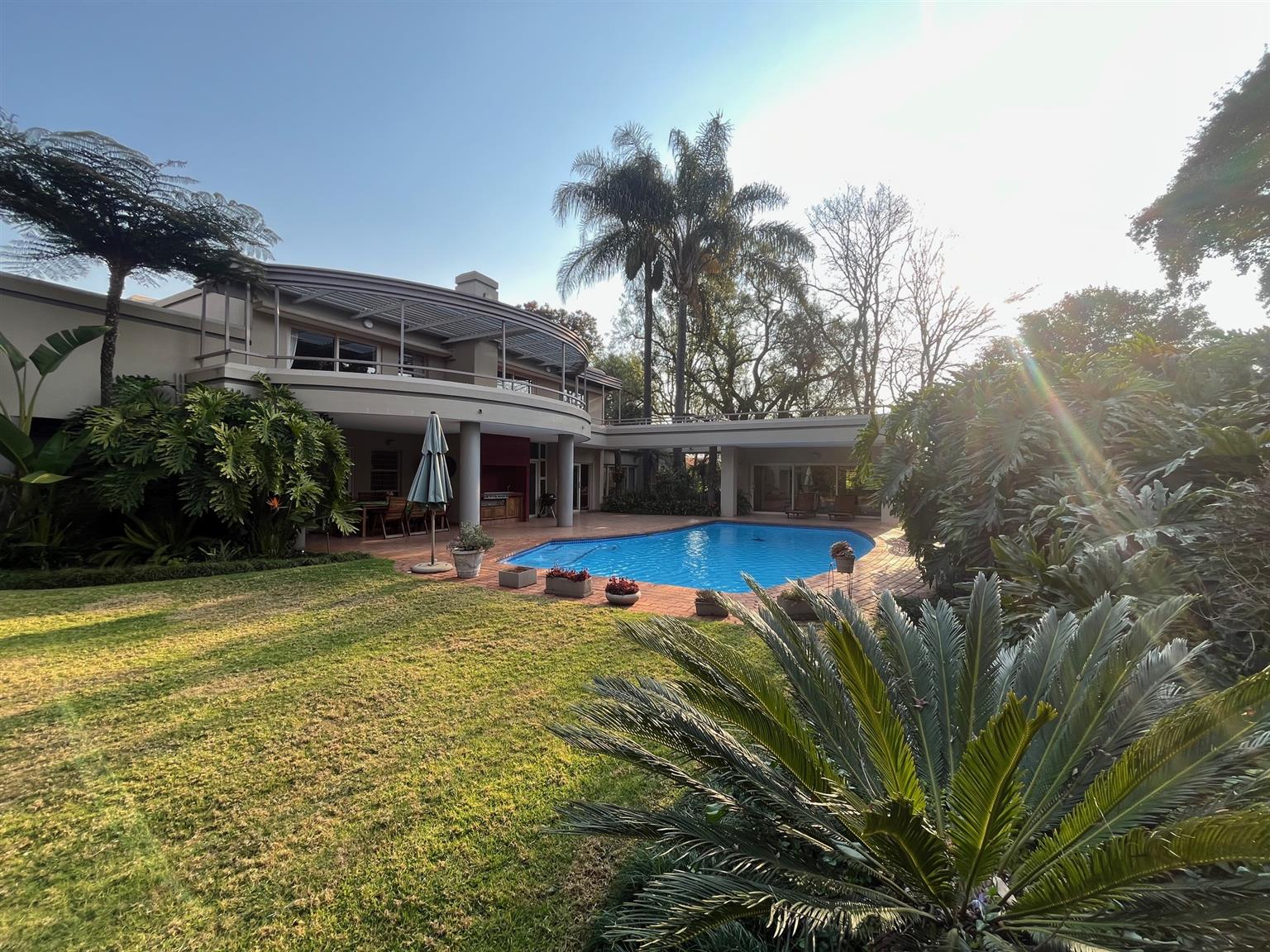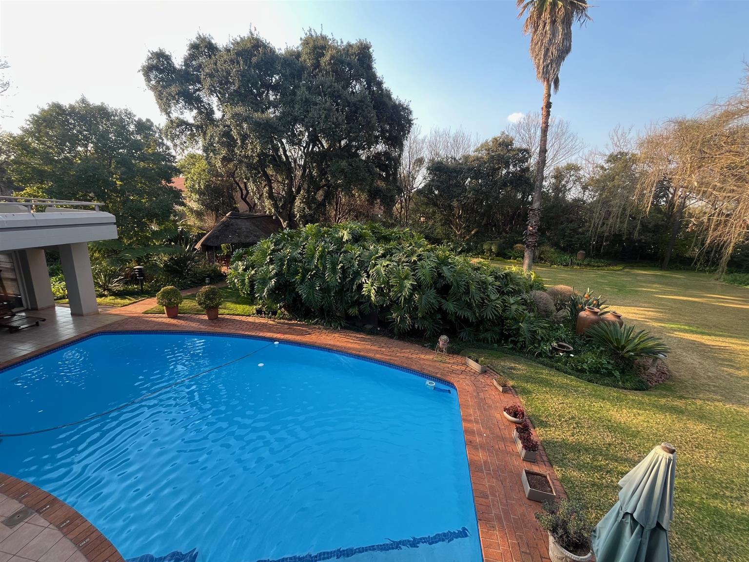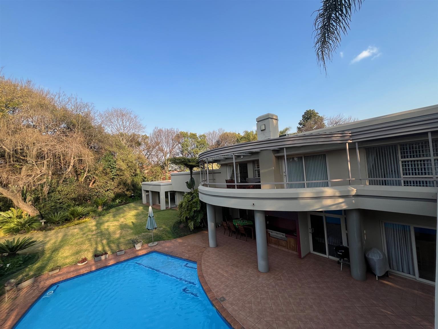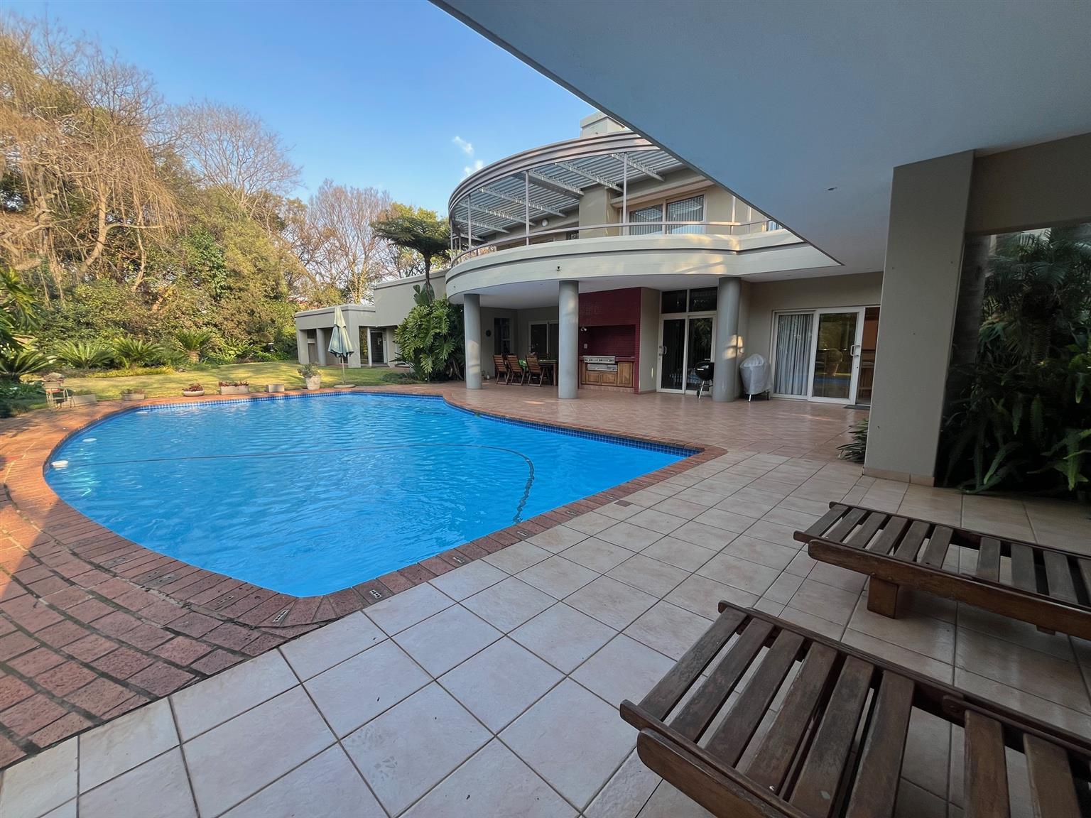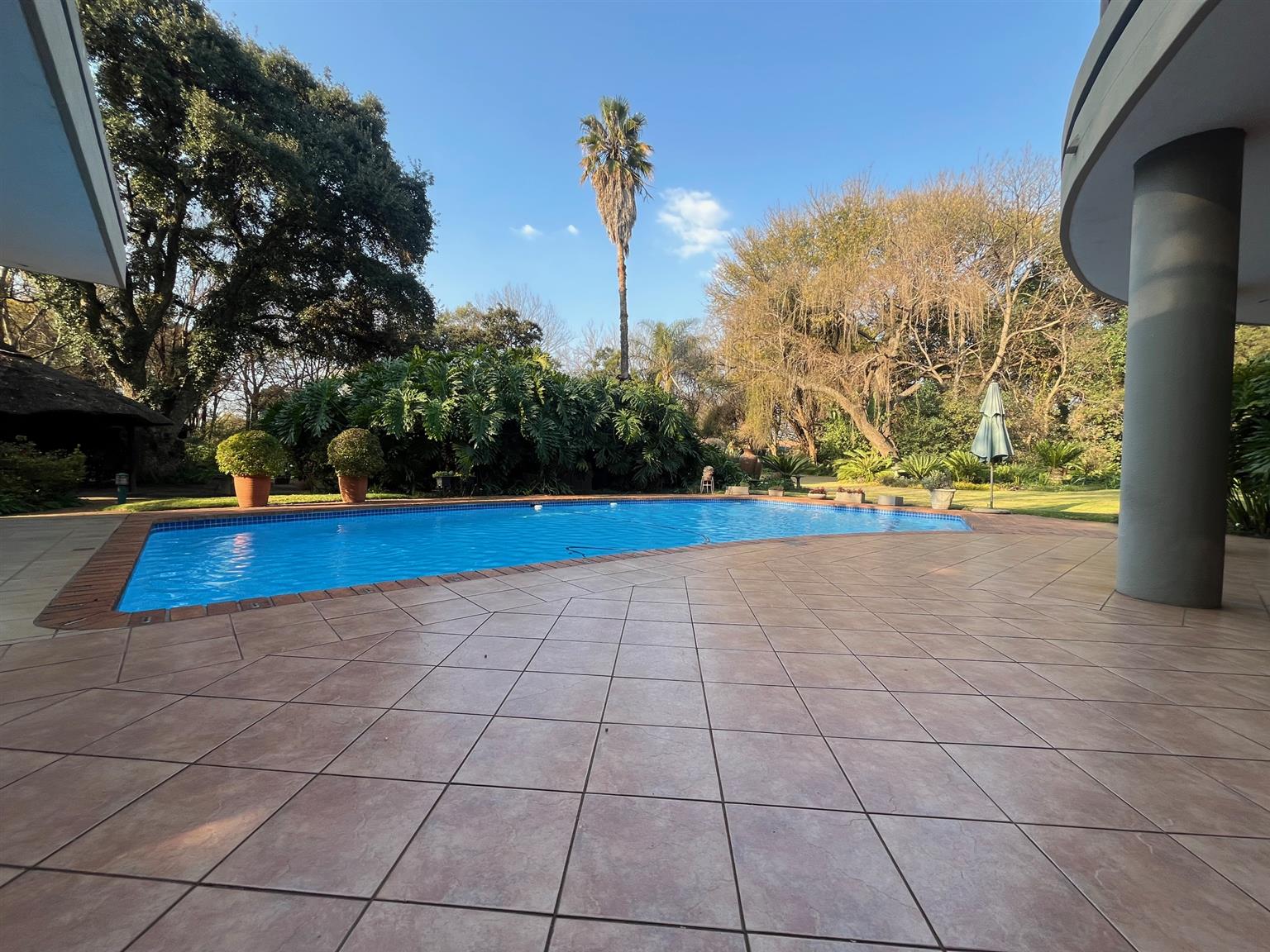 As you enter this serene and expansive property, you’ll be captivated by its charm. The meticulously maintained lawns, bordered by 50-year-old trees, create an inviting atmosphere perfect for entertaining. Host over 100 guests in the lavish indoor bar and entertainment area that opens onto a covered patio and health spa, complete with a sauna, Jacuzzi, and gym. The outdoor space features a sparkling pool and a tropical garden filled with tree ferns and clivias, redefining luxury living with an exclusive touch.