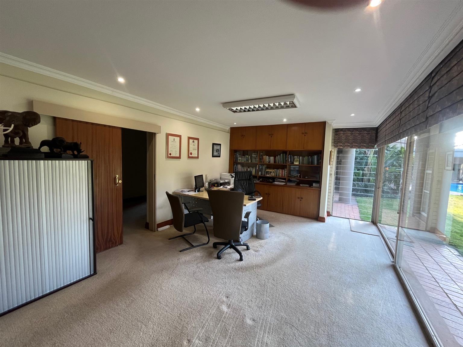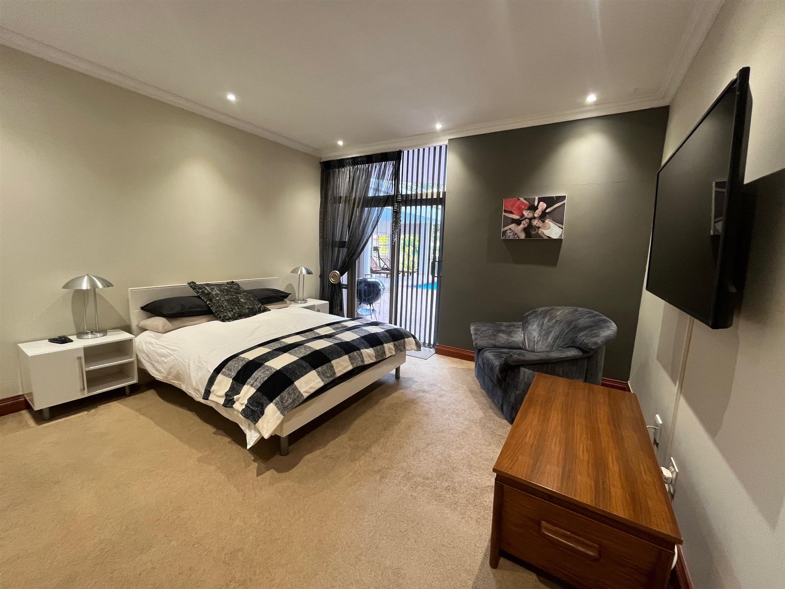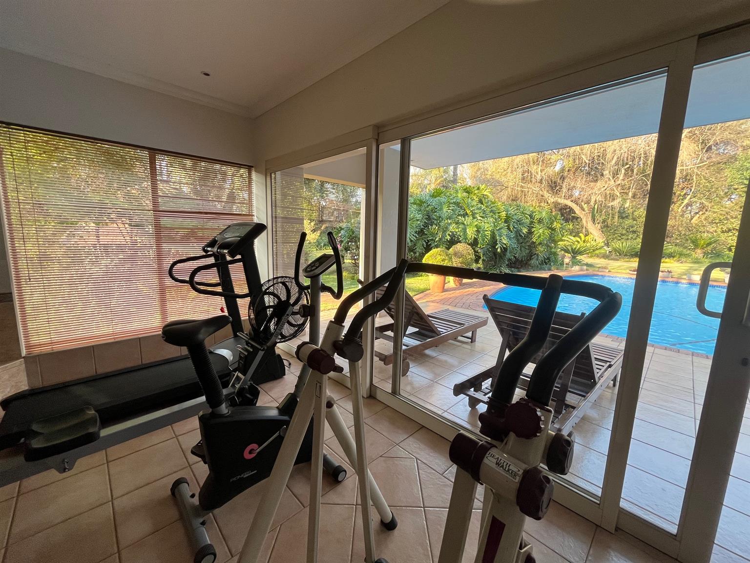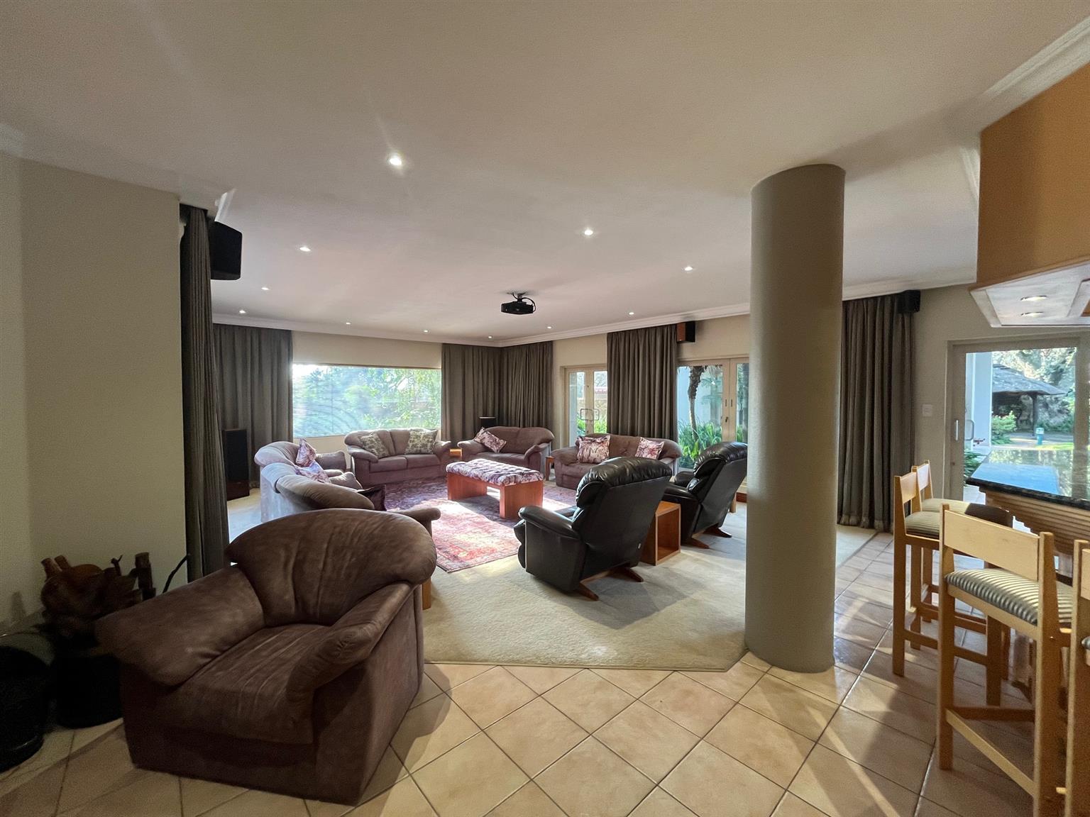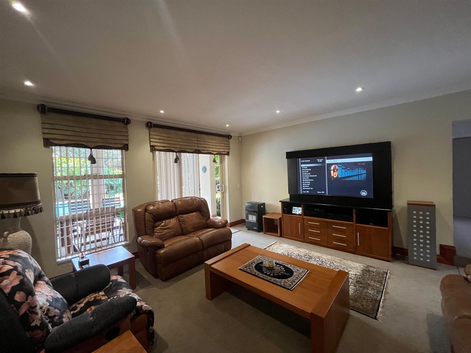 - A TV room with access to the patio and pool.