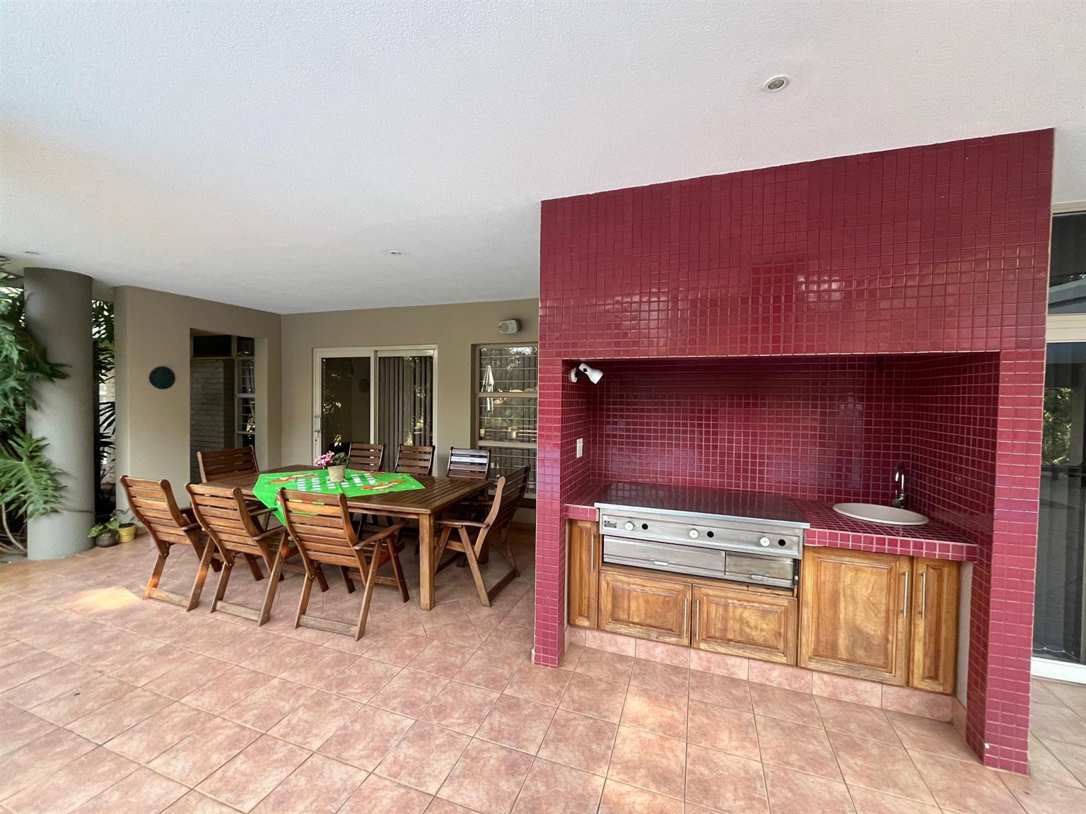 - A covered patio leading to the heated swimming pool.