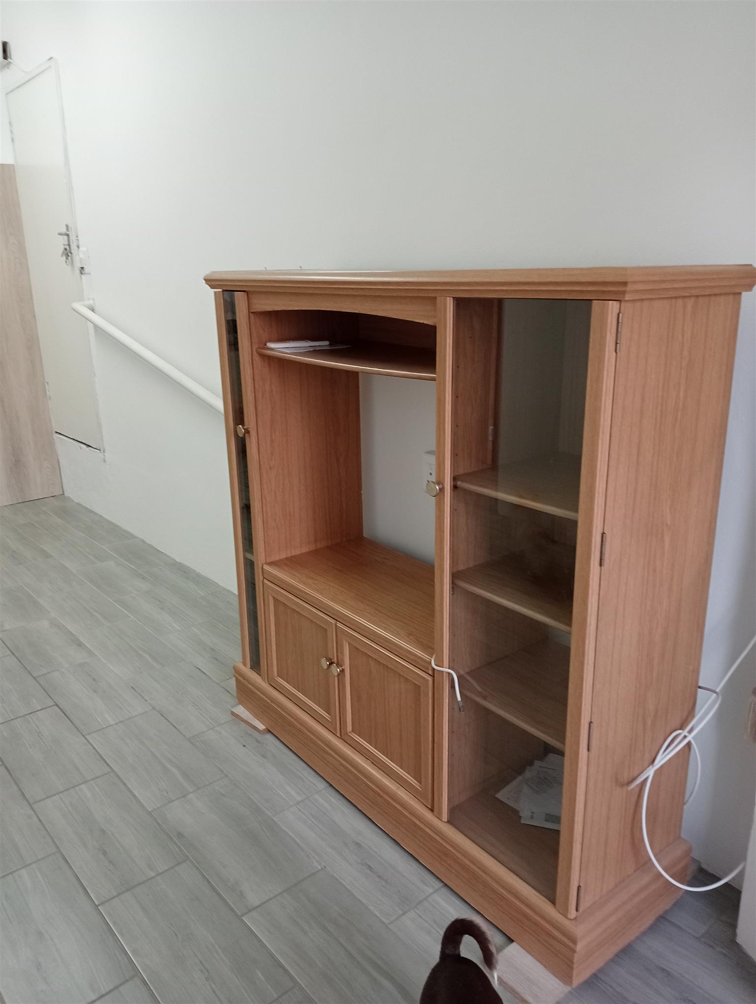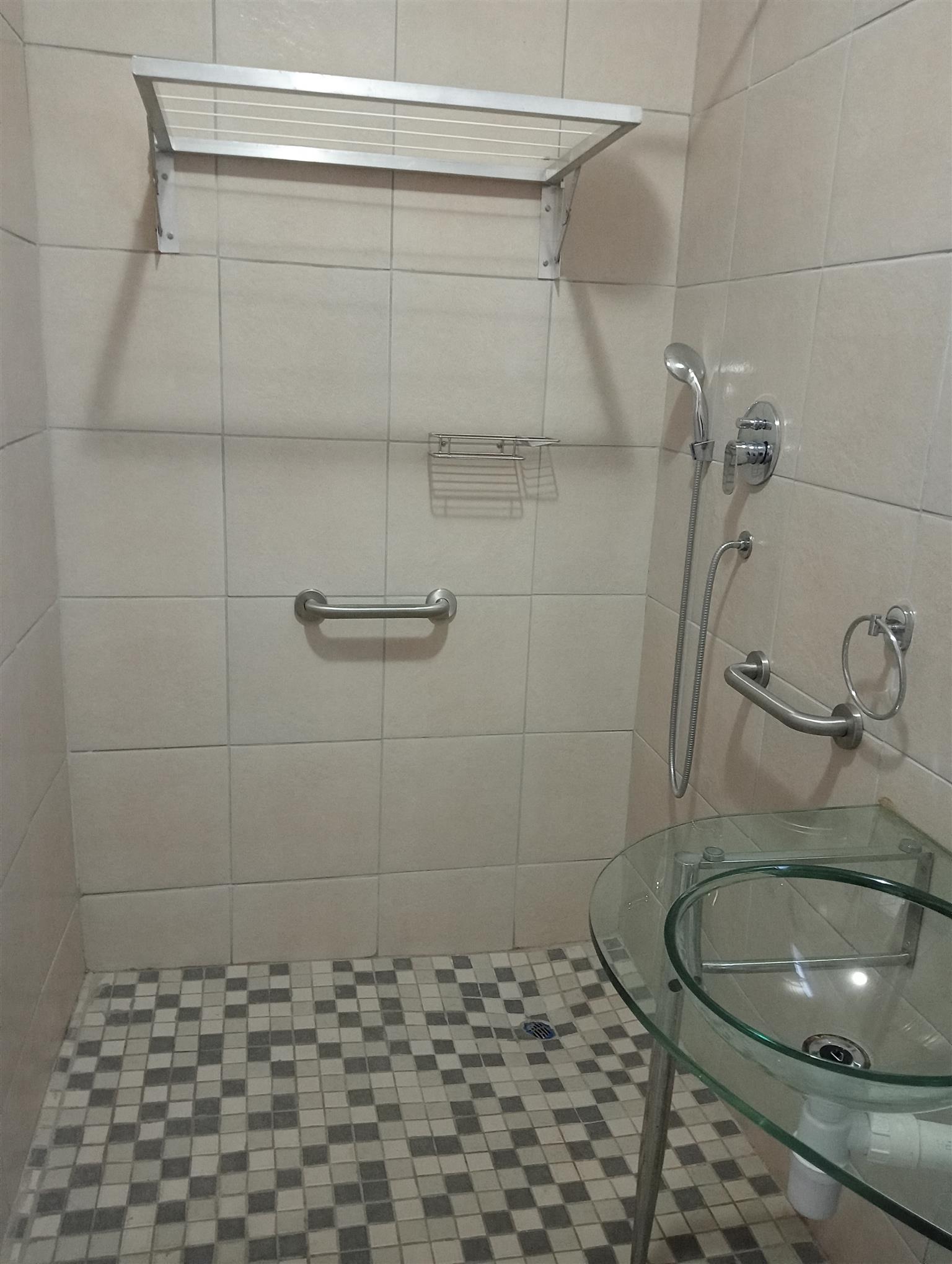 Bathroom with shower and ample space for washing machine. Kitchen/lounge/TV room