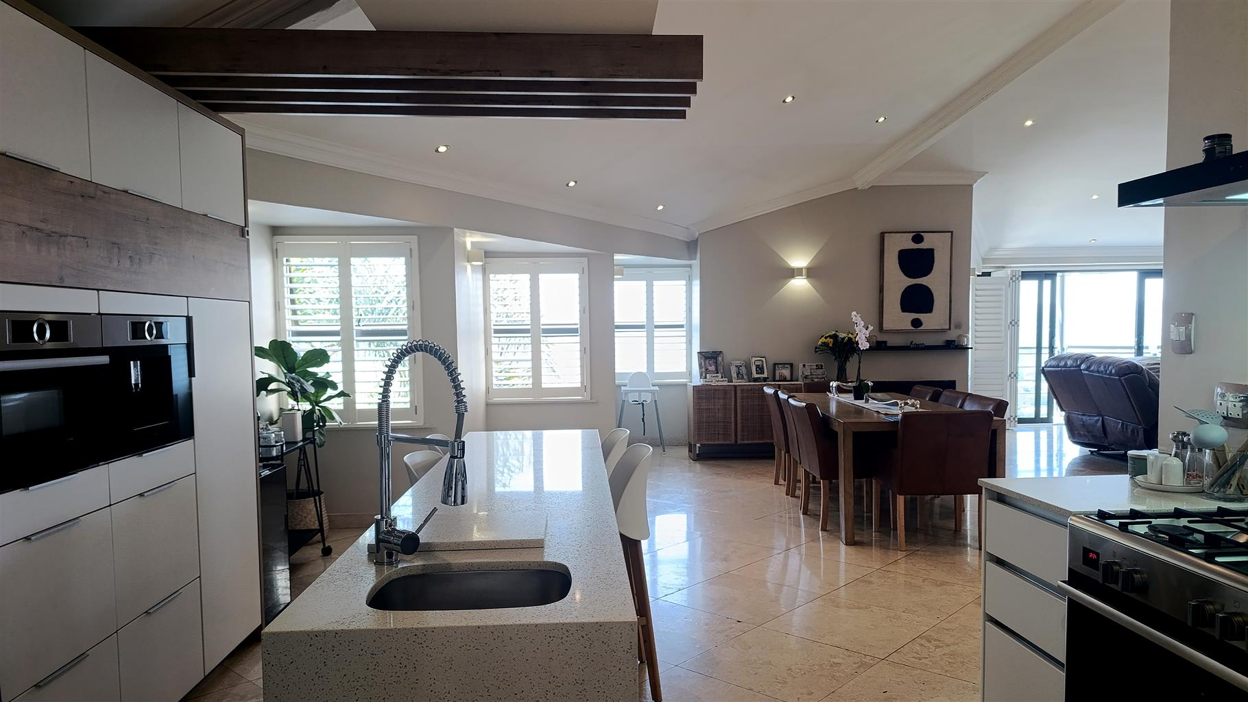 The dining area easily accommodates an eight-seater table, making it ideal for family gatherings or dinner parties. A fashionable kitchen featuring a gas stove, ample storage, and an open pantry connects effortlessly to the separate scullery and washing-up area.