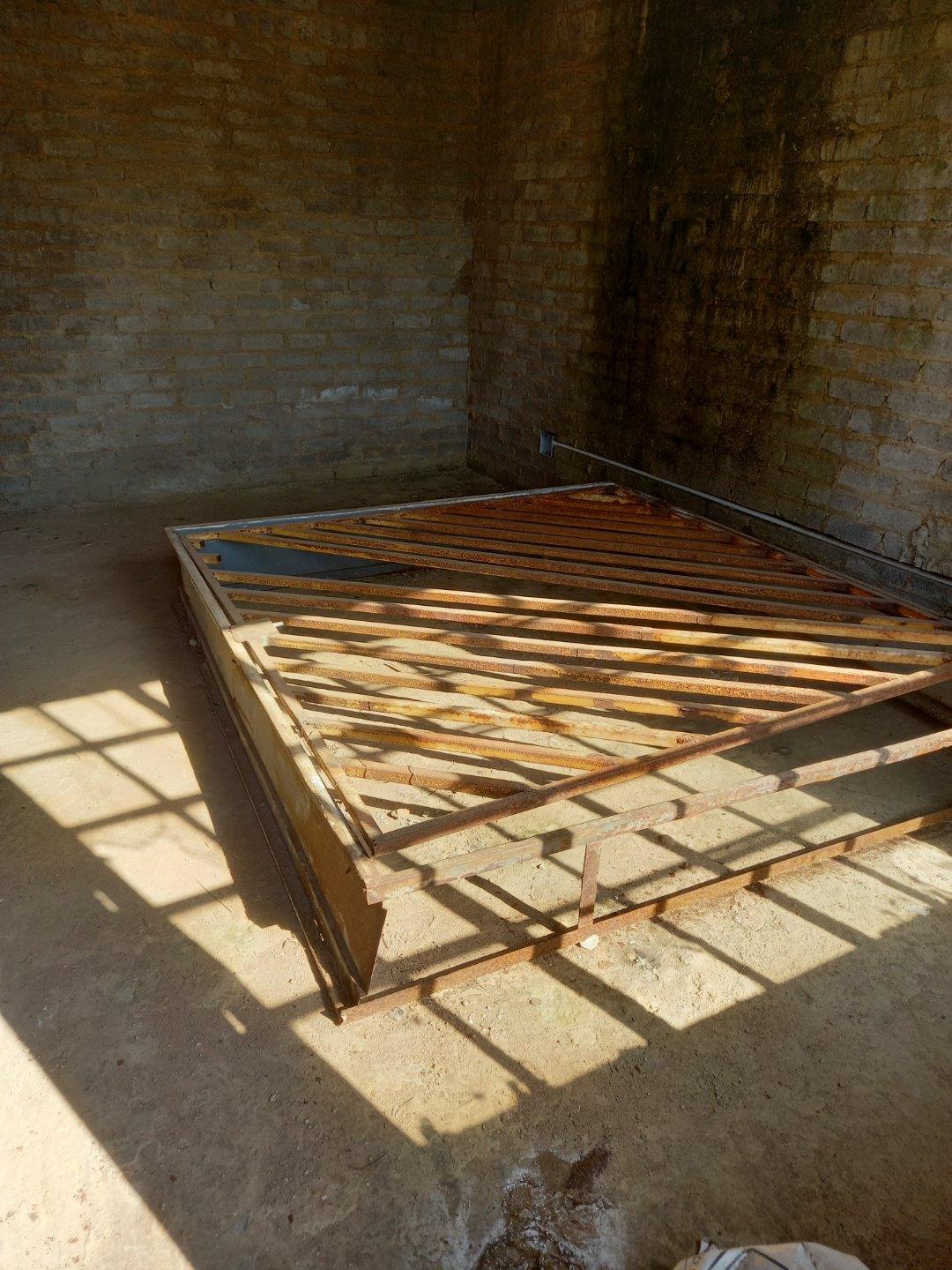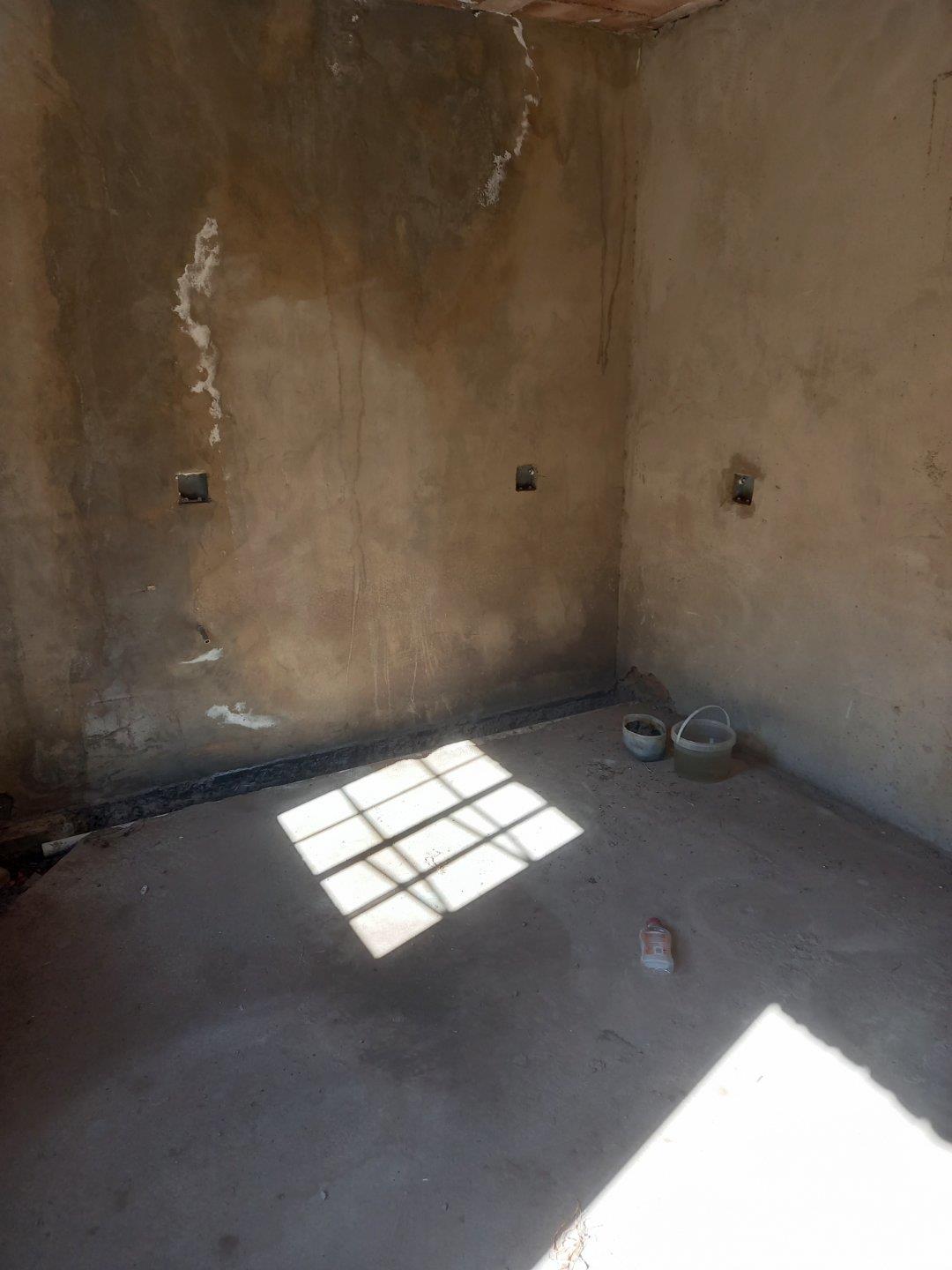 Walls have been erected, and half of the top floor has a roof. Water and electricity available.