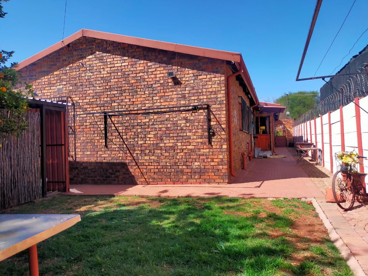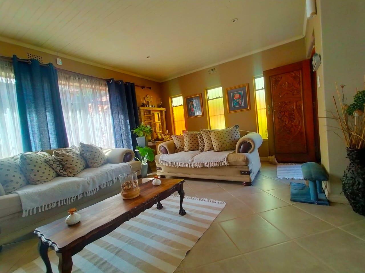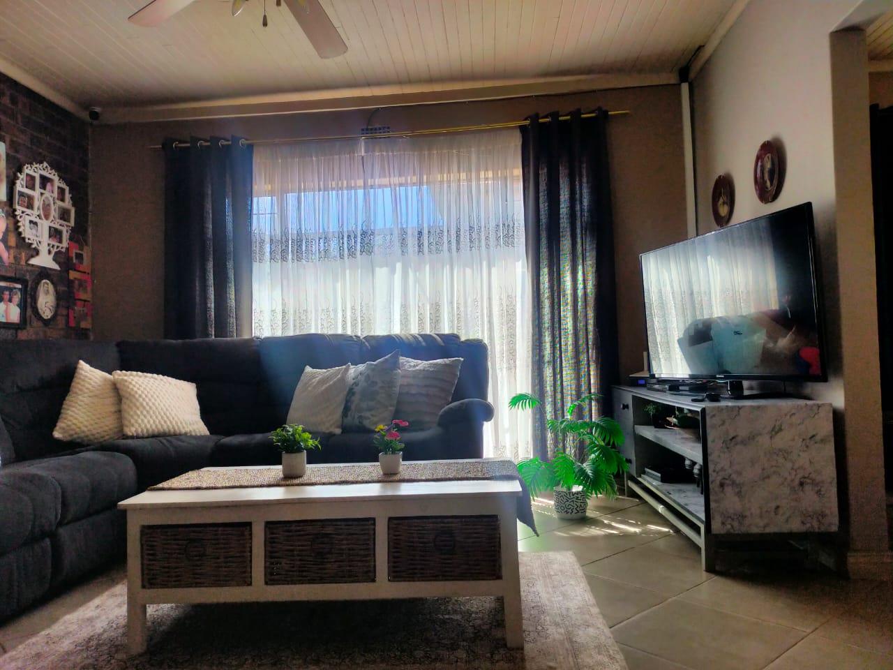 Open plan living room/ TV room , With naughty pine ceilings. One wall is a face brick feature wall.