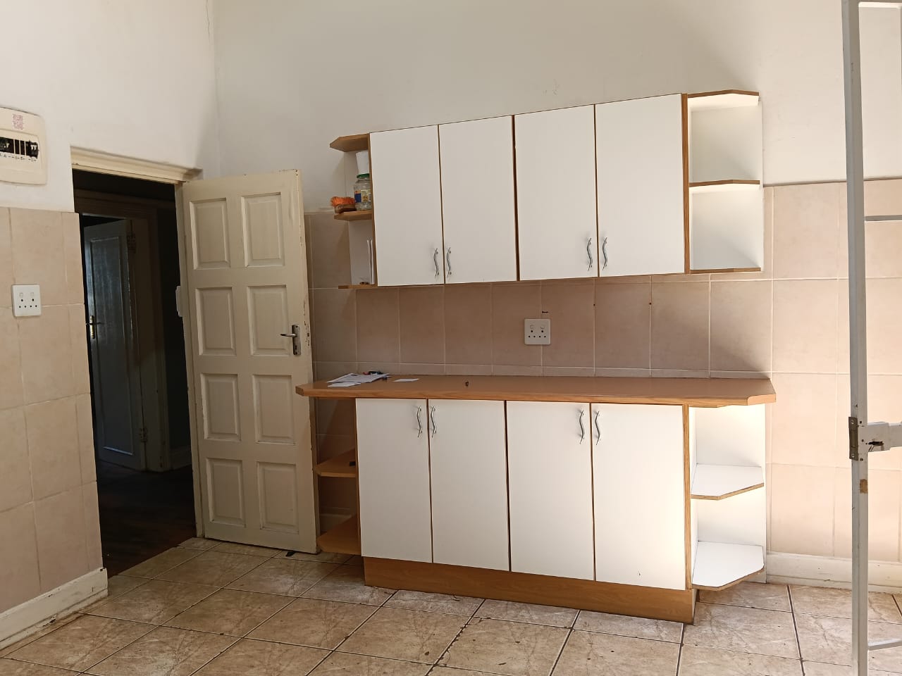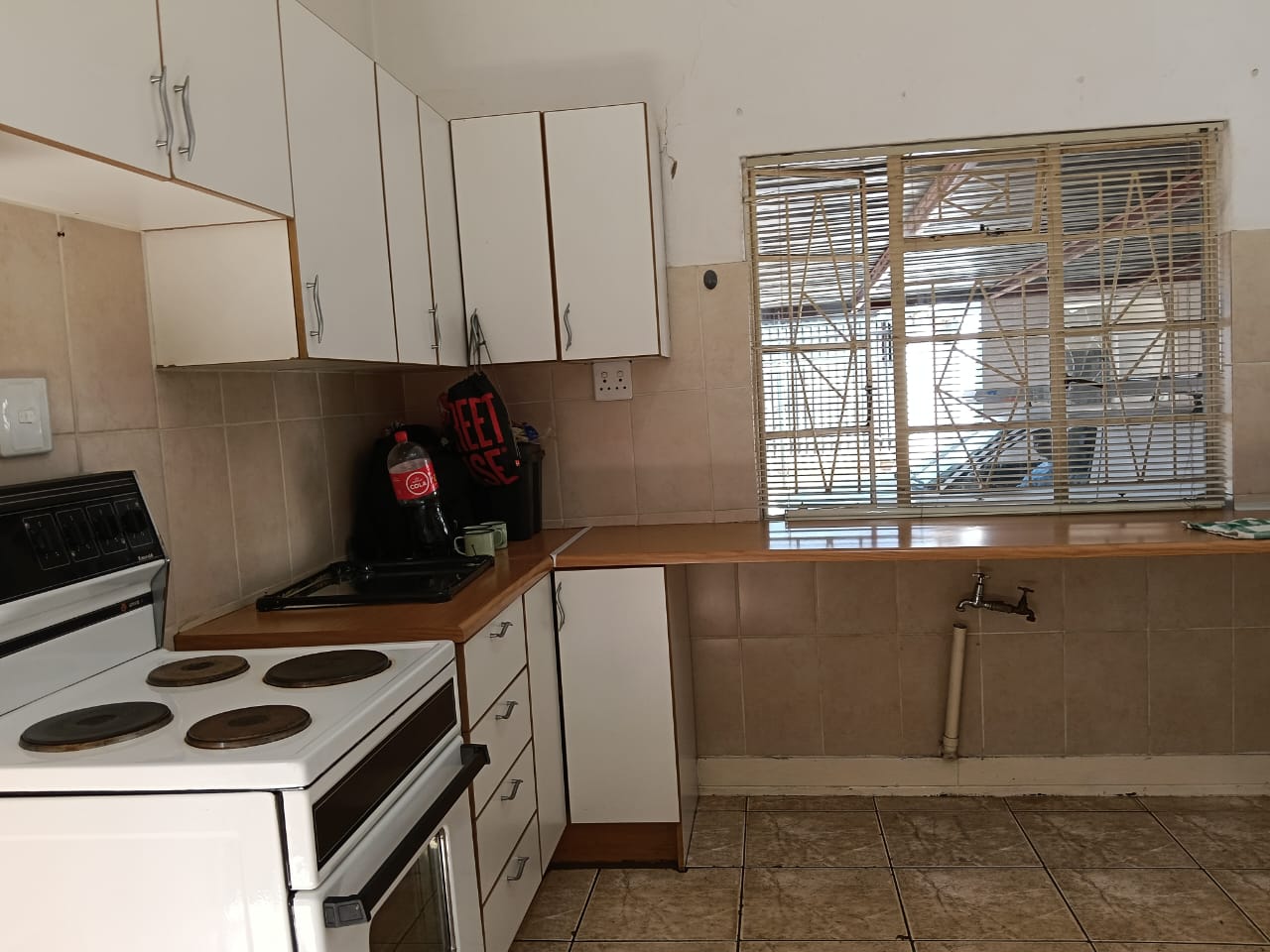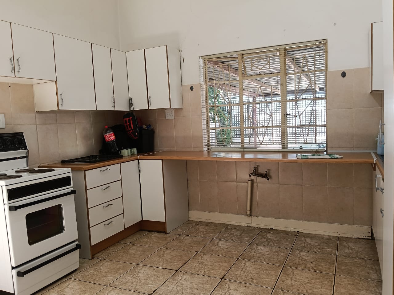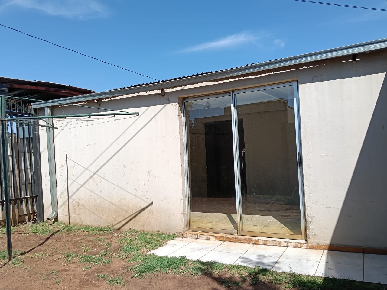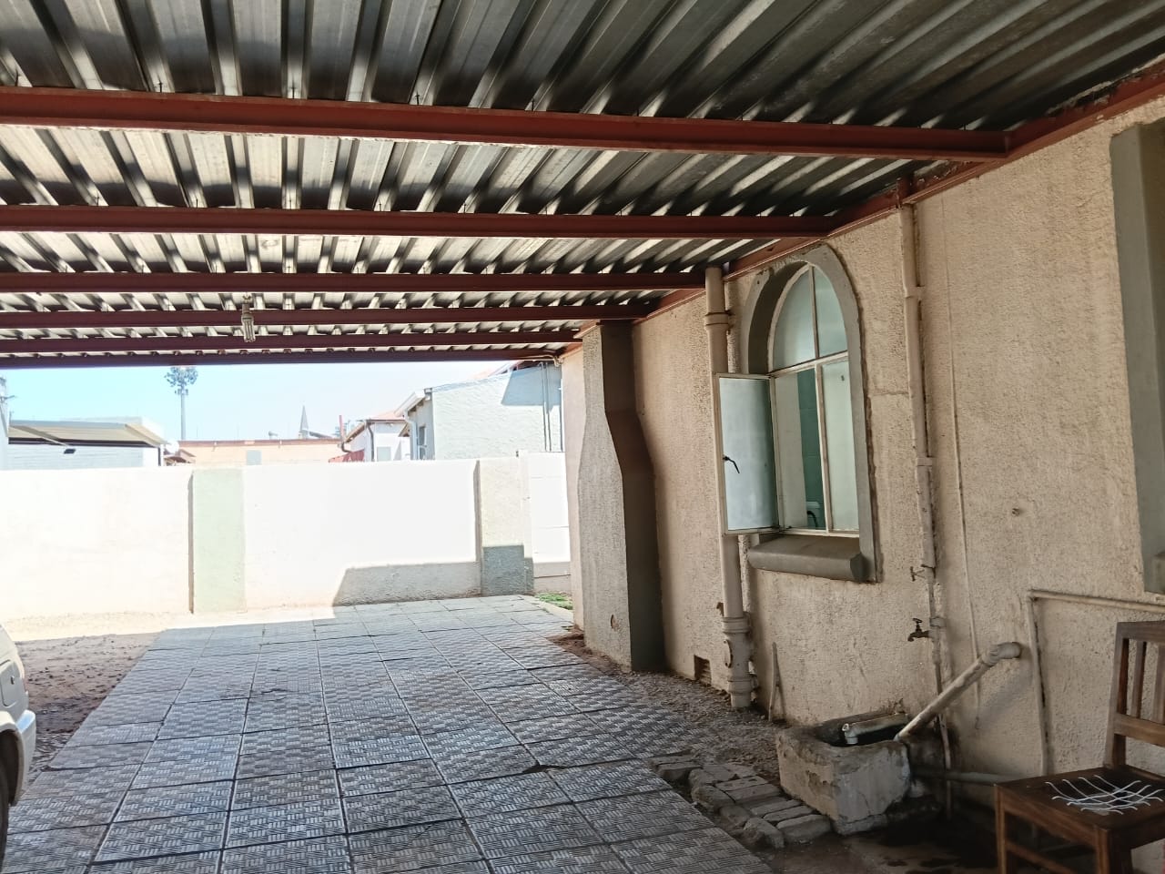 The main building consists of four bedrooms, three of which have built-in cupboards, a full bathroom, a guest bathroom, a spacious lounge, an open-plan entrance hall, and a well-sized kitchen. Ample parking with space in front of the building, carports at the back, and a single garage.