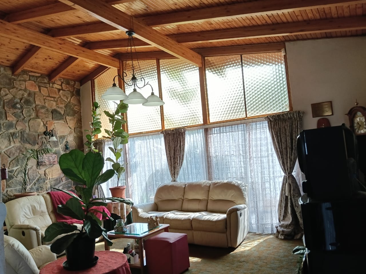 TV room with sliding doors opening onto an enclosed sunroom