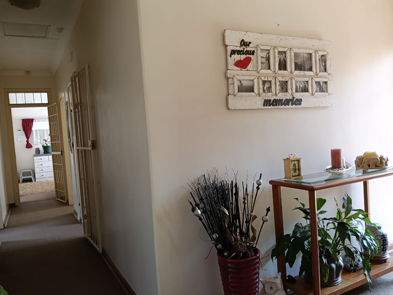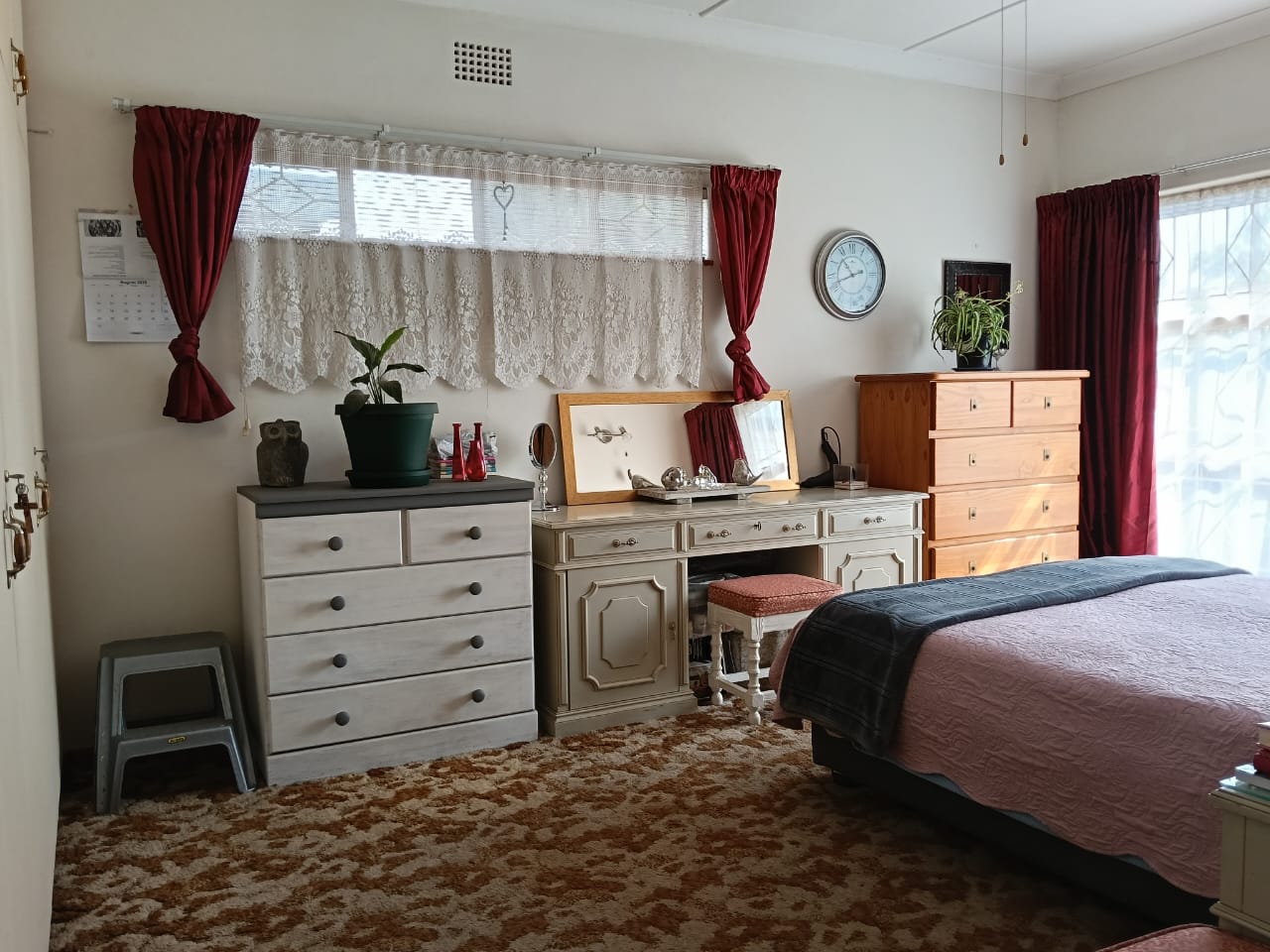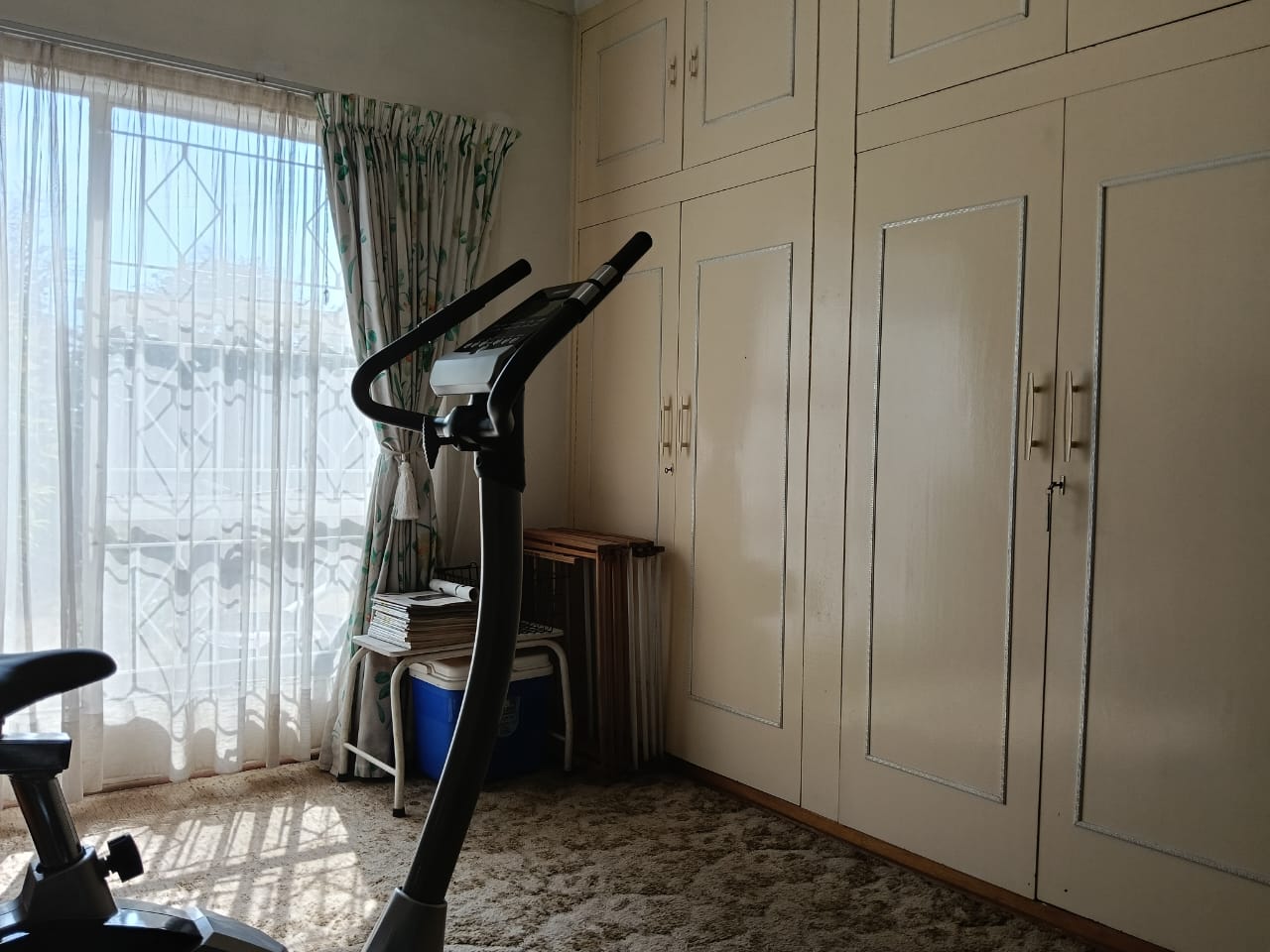 Domestic room with built-in cupboards and carpet