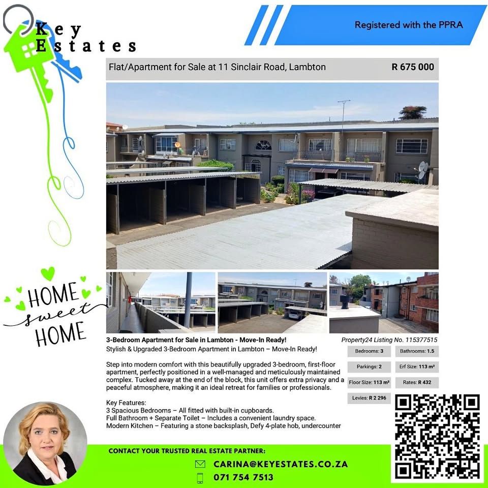 Move-in ready! 🔑 Don't miss this stylish 3-bedroom apartment for sale in Lambton, Germiston. Perfectly maintained with modern comforts, offering privacy and a peaceful atmosphere. Ideal for families or professionals! Listed at R 675 000. Contact Carina: or #ForSale #Lambton #ApartmentForSale #Property #RealEstate #KeyEstates #MoveInReady #GermistonHomes