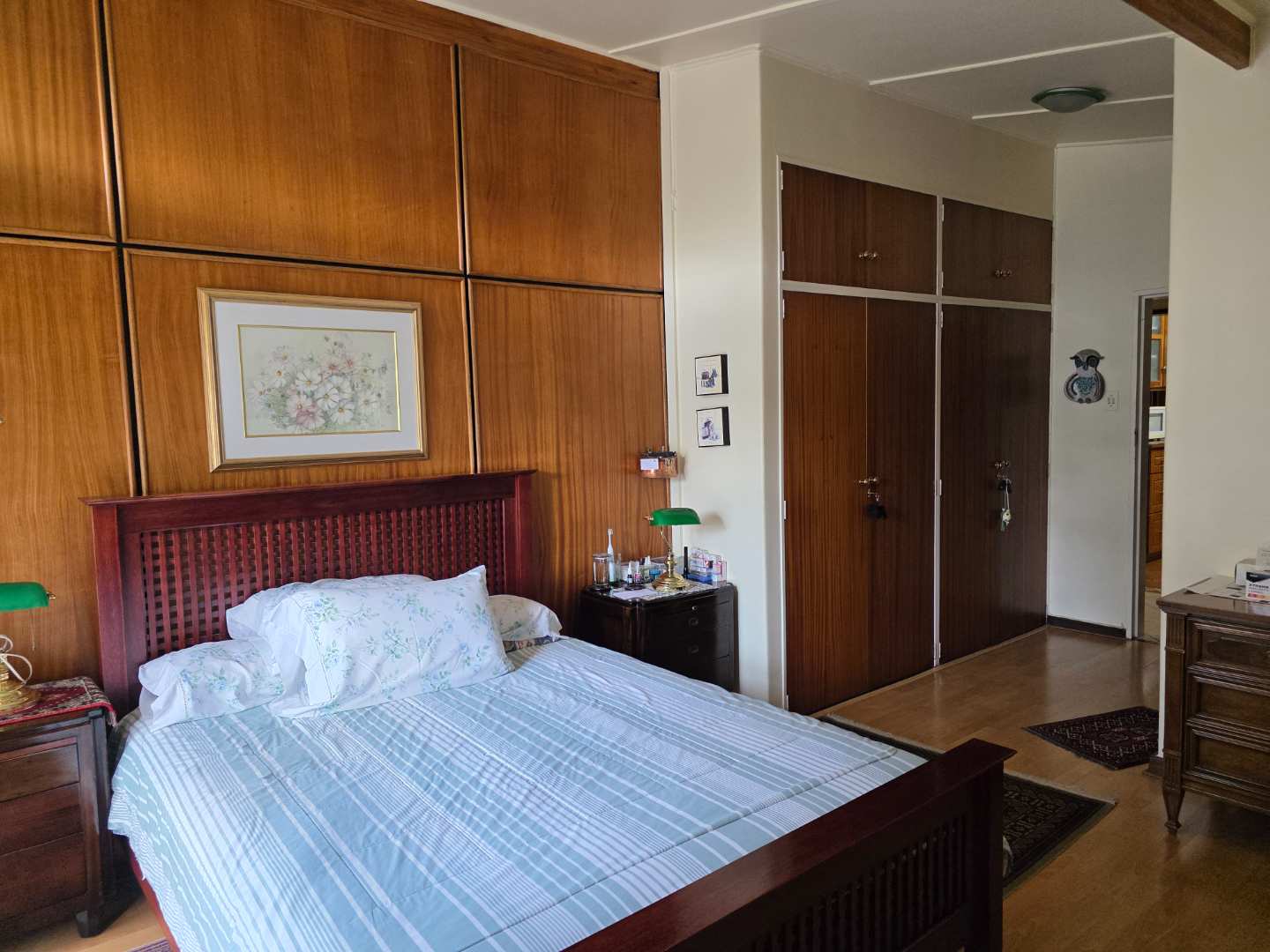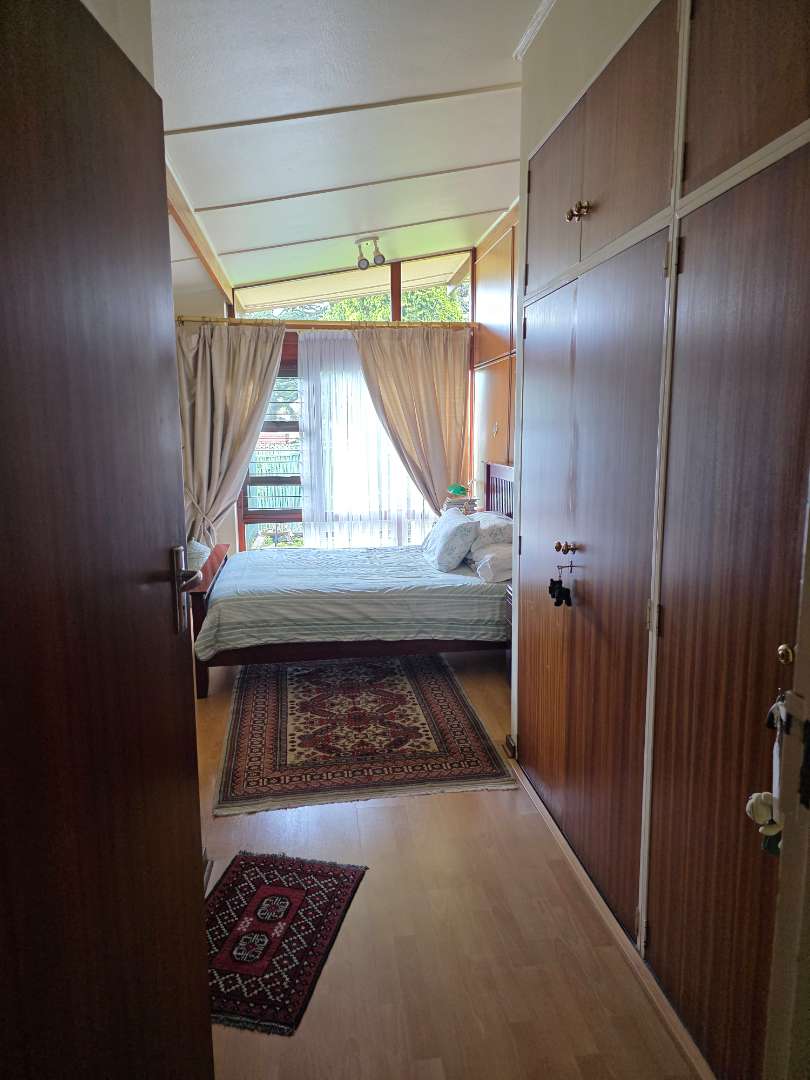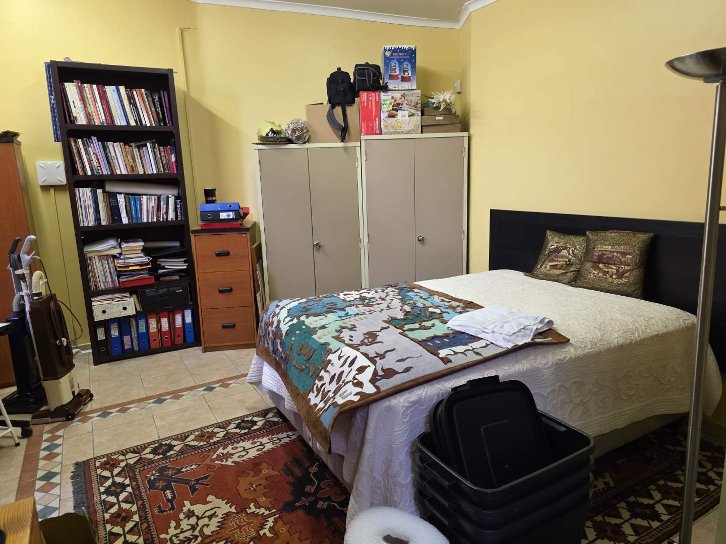 Exiting the kitchen, there is a door that leads to the main bedroom. This bedroom has an en-suit bathrooms (bath, basin and toilet), built in cupboards and large windows.