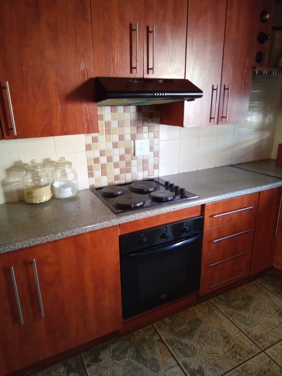 Built in stove set and cupboards.