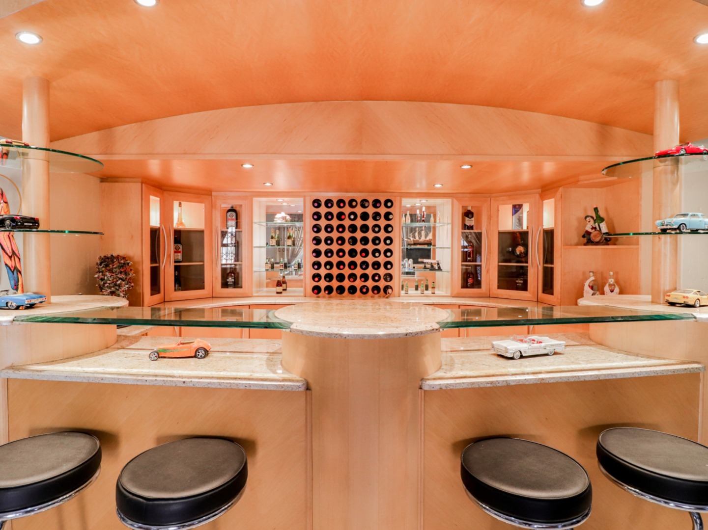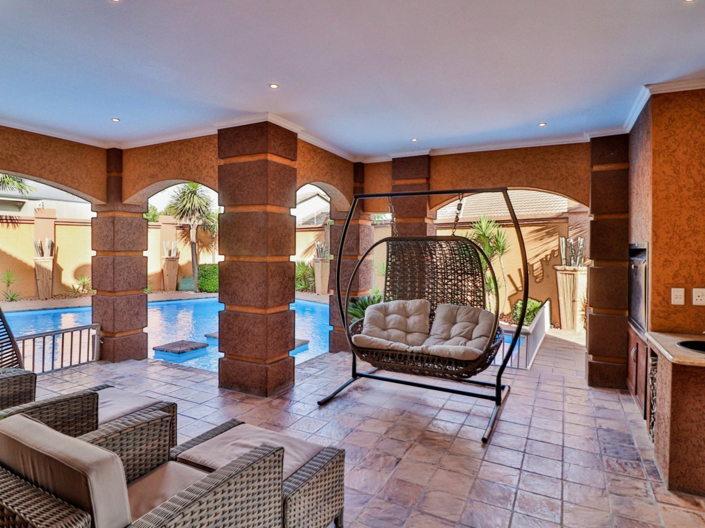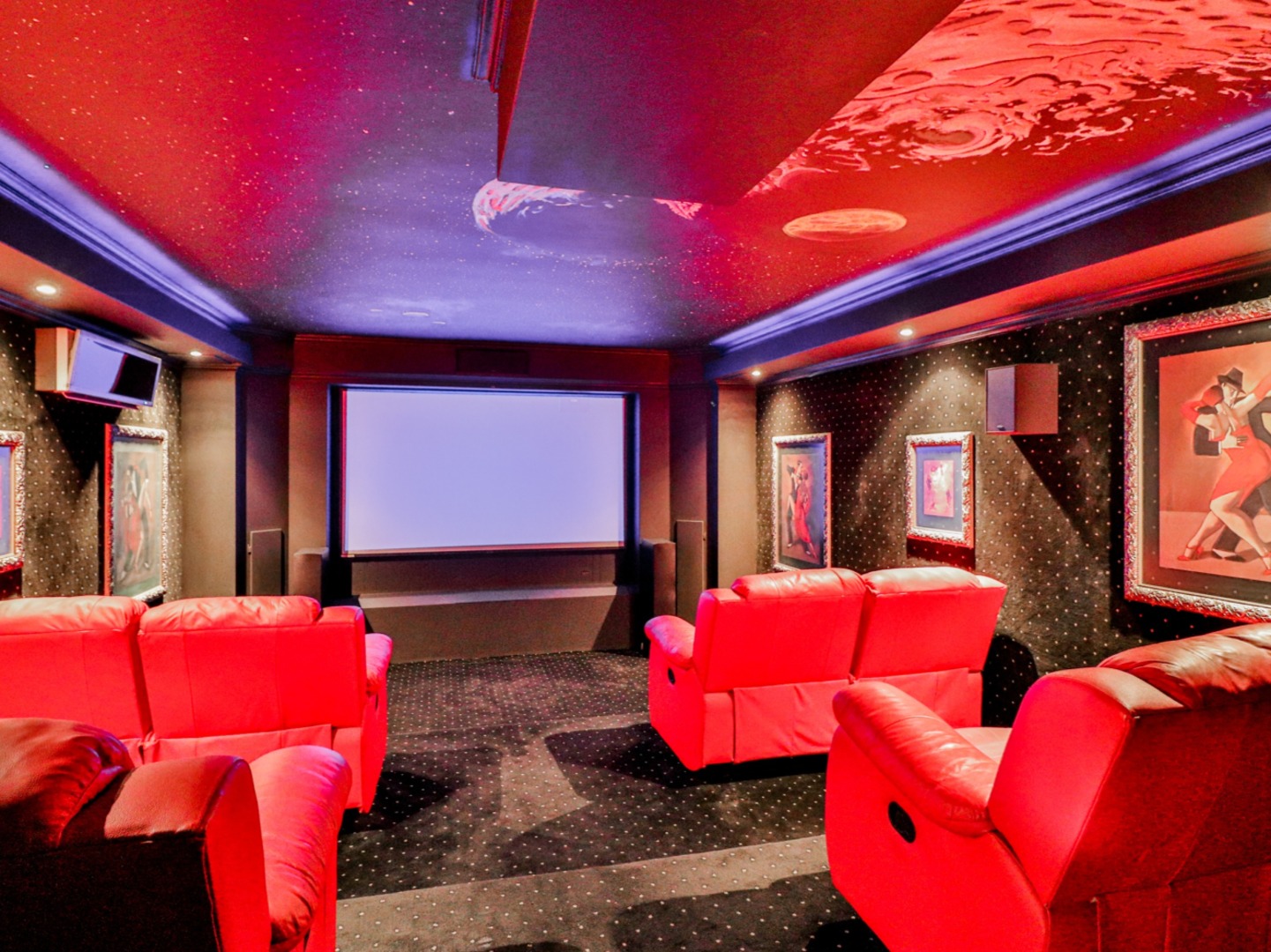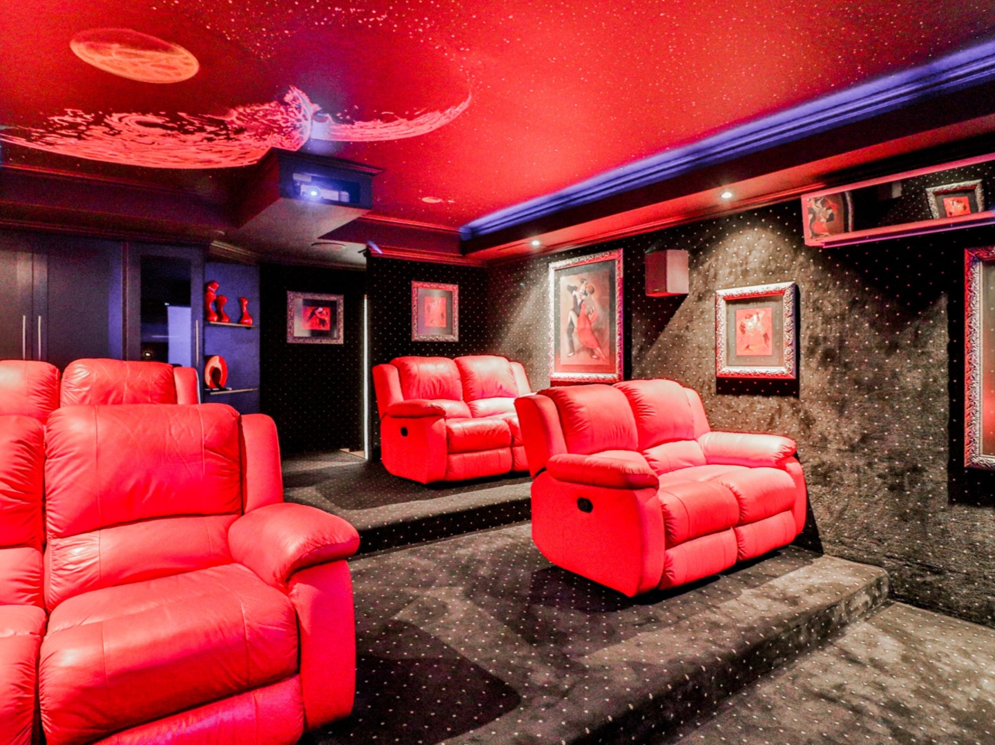 Downs stairs through the glass doors, you find an office, with it own entrances, formal lounge, entertainers bar, large open-plan living room, lounge and dining, opening up to the undercover patio, sparkling swimming pool and garden 8-seater cinema.