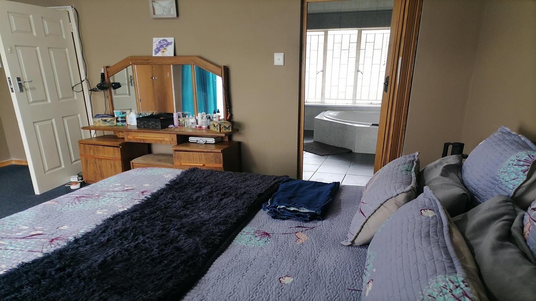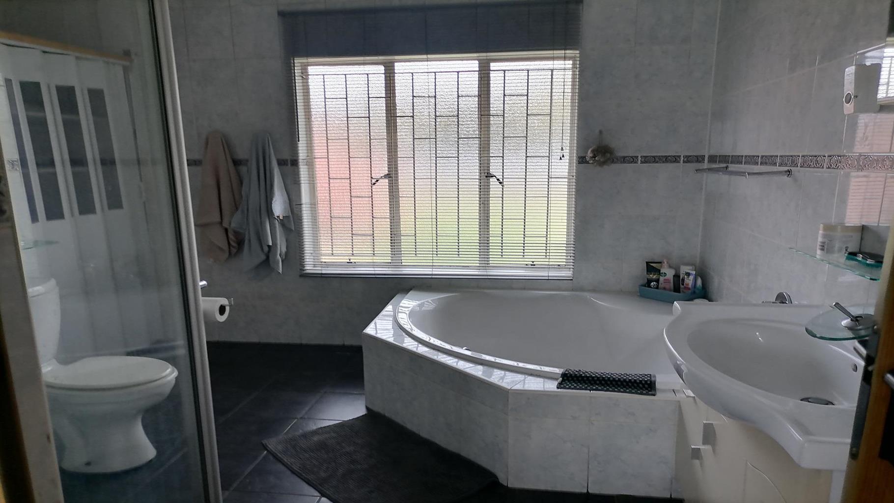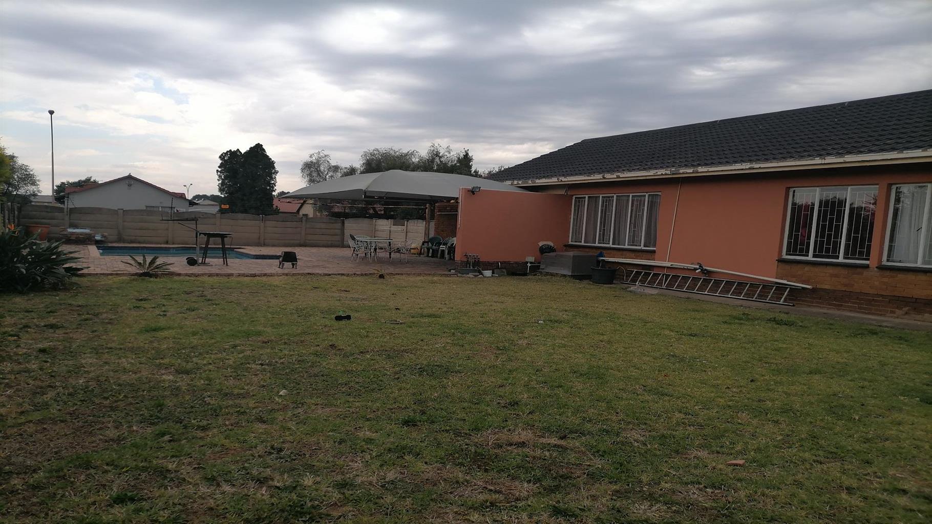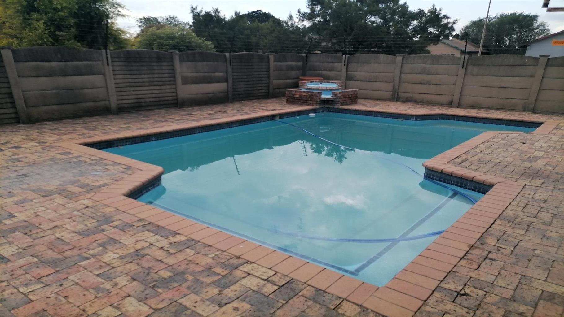 This home welcomes you with a nice spacious open plan lounge/dining room and TV room. A private covered braai area next to the swimming pool to relax for the whole family in the hot summer days. Nice kitchen with build in cupboards and an extra room for overnight guests with a scullery and quest toilet. There is a burglar gate that covers the 3 bedrooms. The main bedroom has an en suite bathroom with a nice big bath, shower, toilet and a build in cupboard for extra storage. Solar geyser and garages for 2 cars. It is close to schools, shopping centers and churches. Electric gate for eTasy life and secure fencing with Vosbeton and electric fencing. The whole house is covered with burglar bars for the safety of the family.
